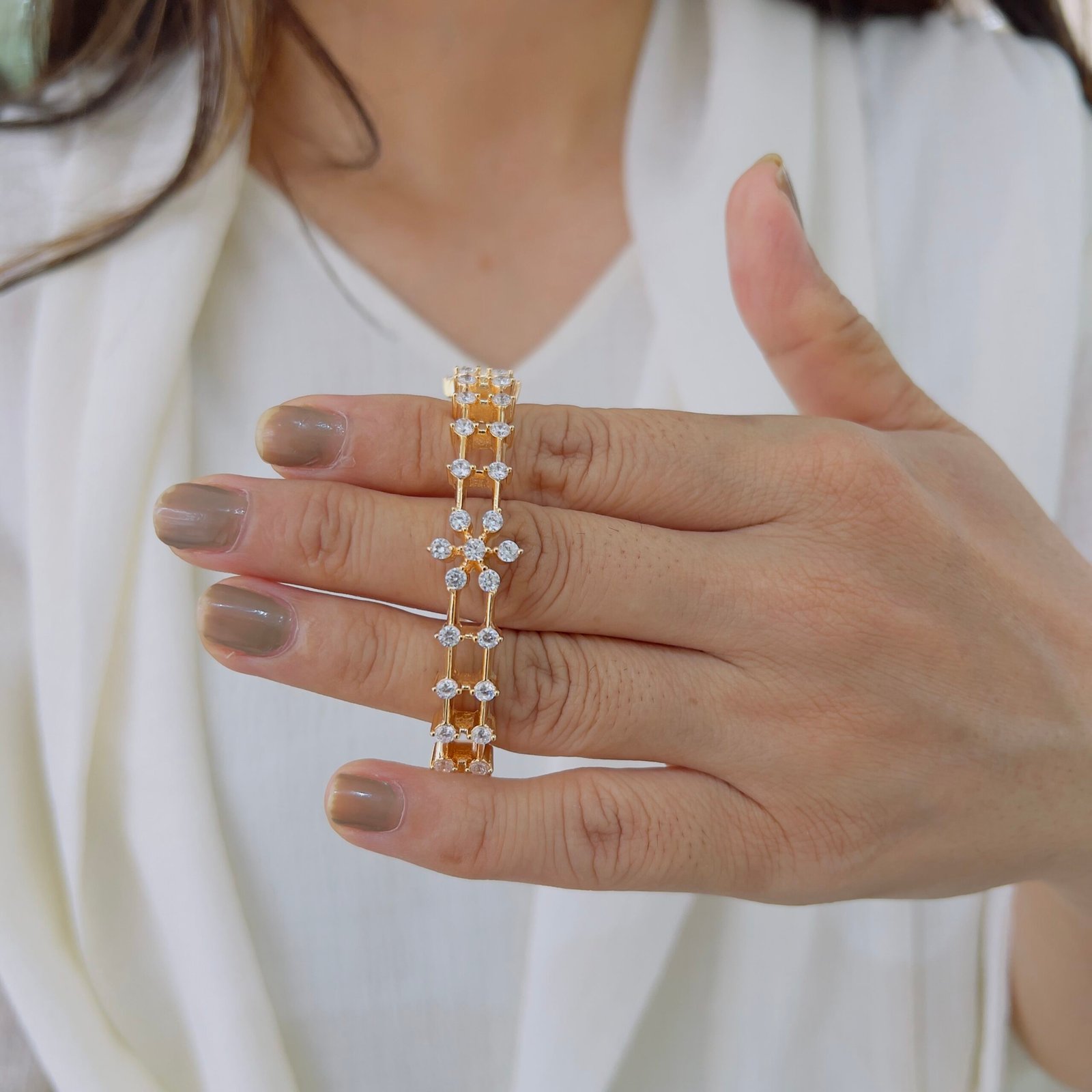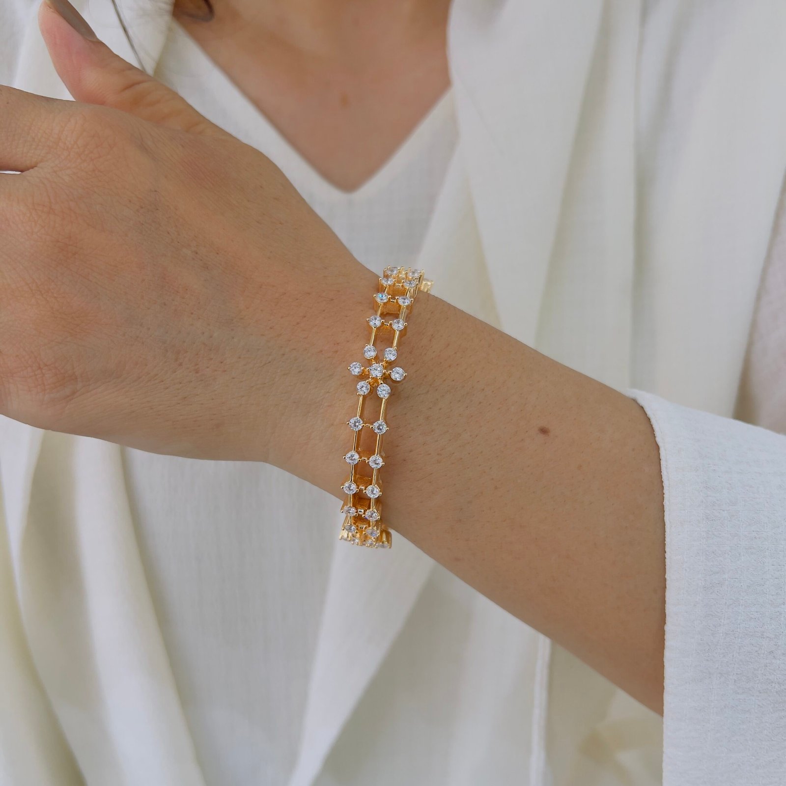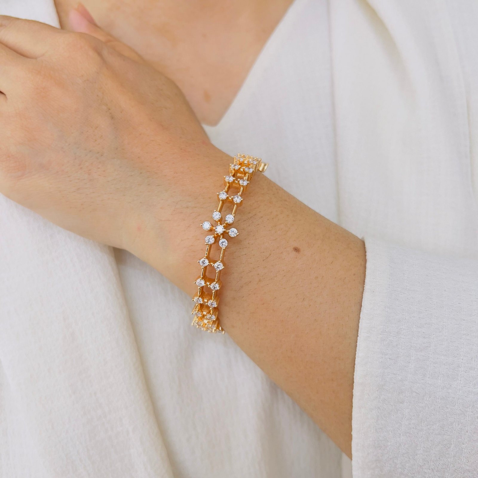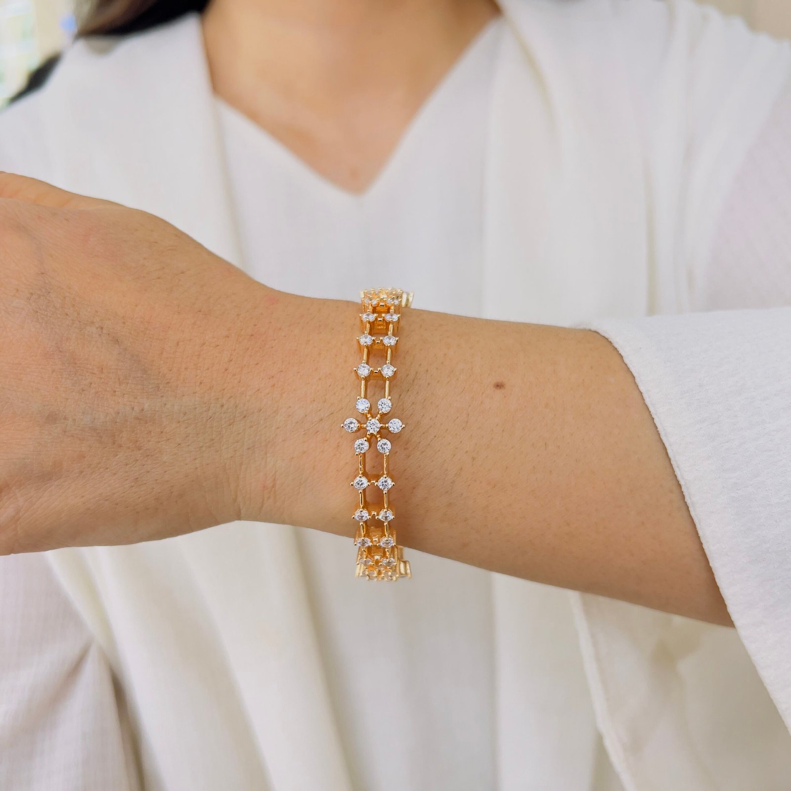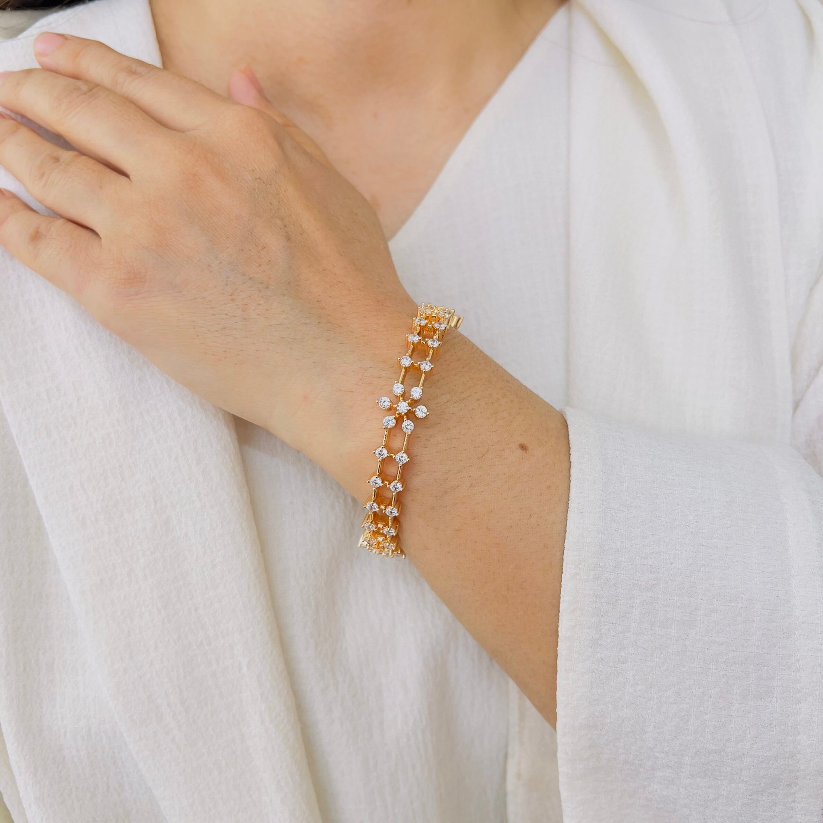 Fall in love with this exceptional, hand-made flower diamond bangle. Beautifully 18K gold plated and anti-tarnish, it combines elegance and durability for everyday charm that truly lasts.