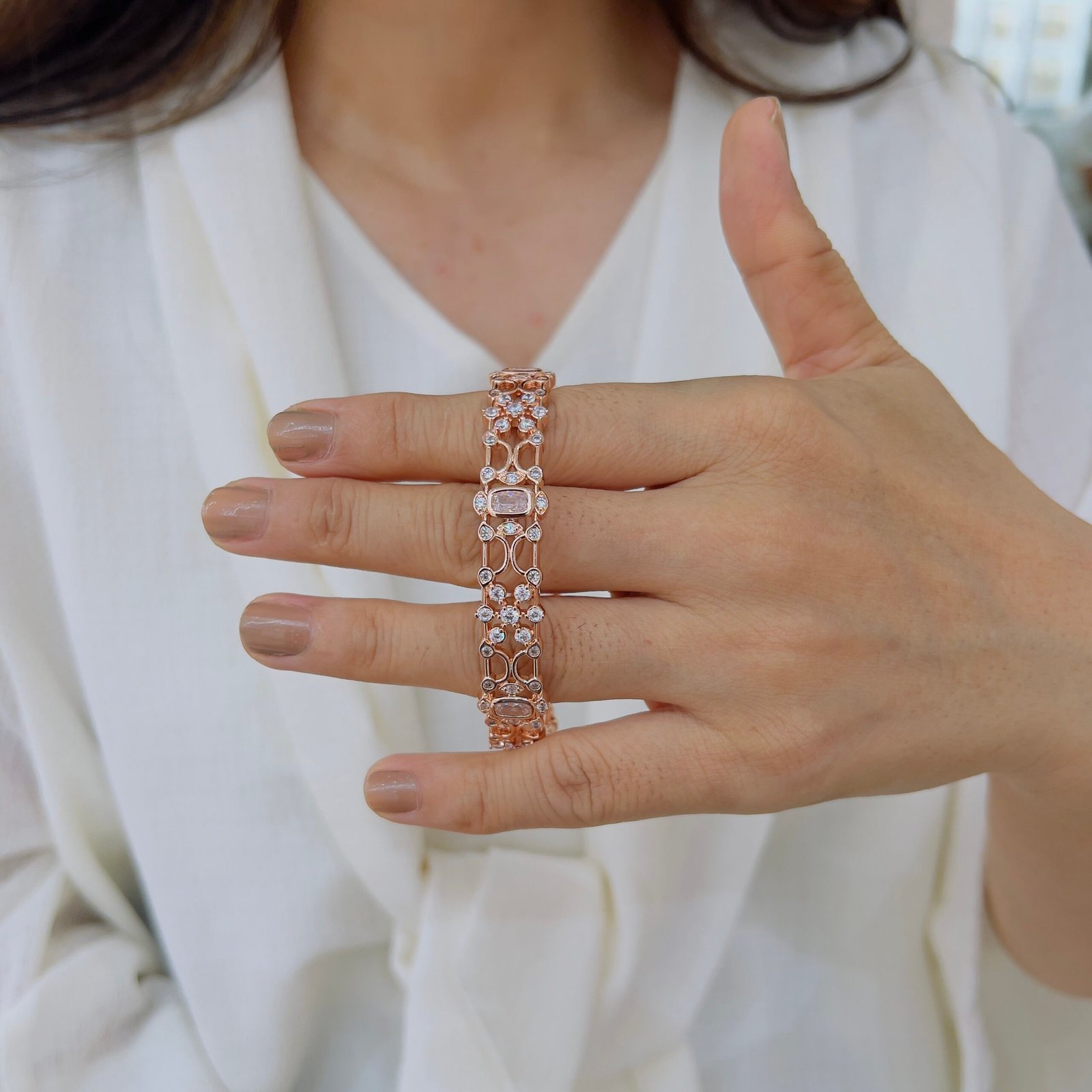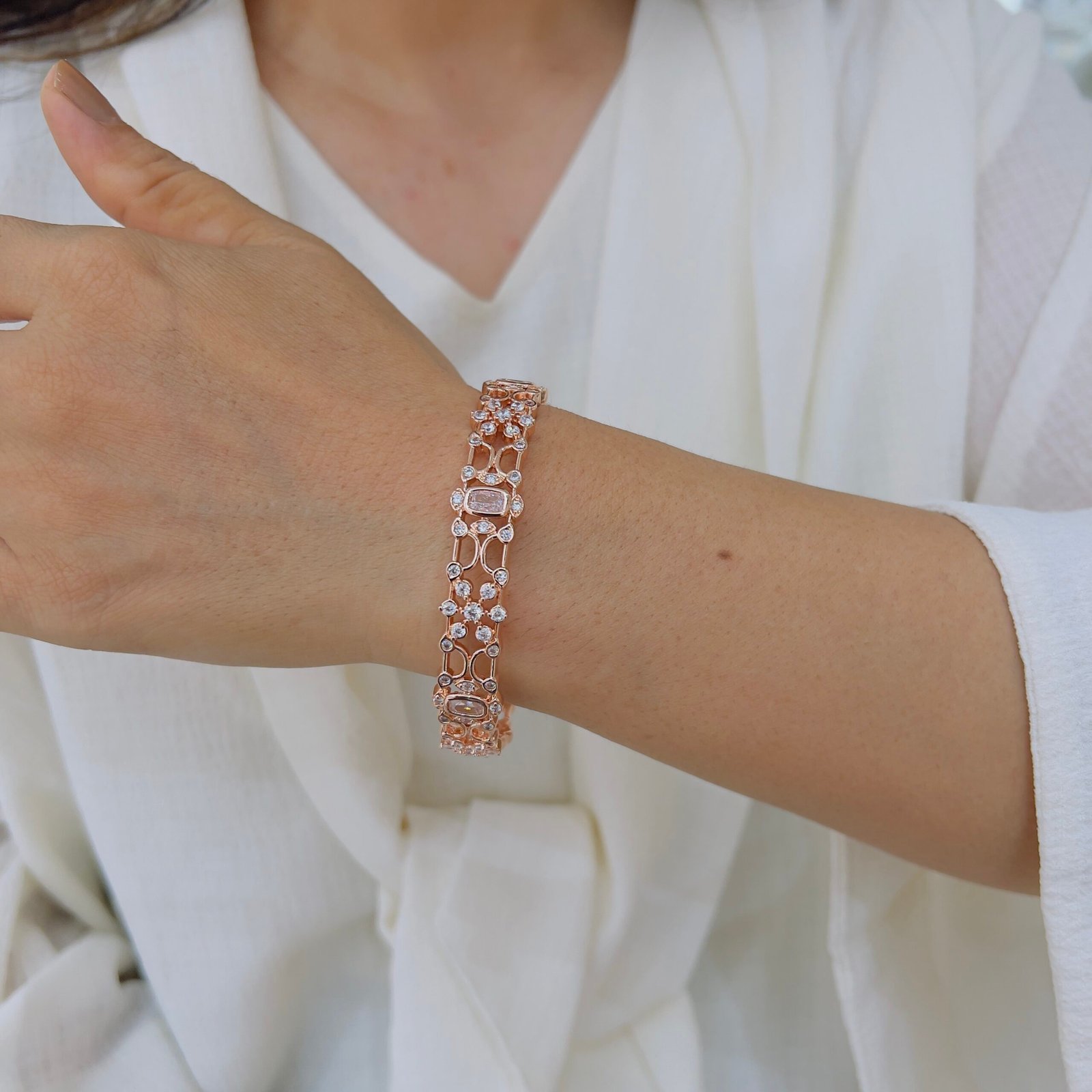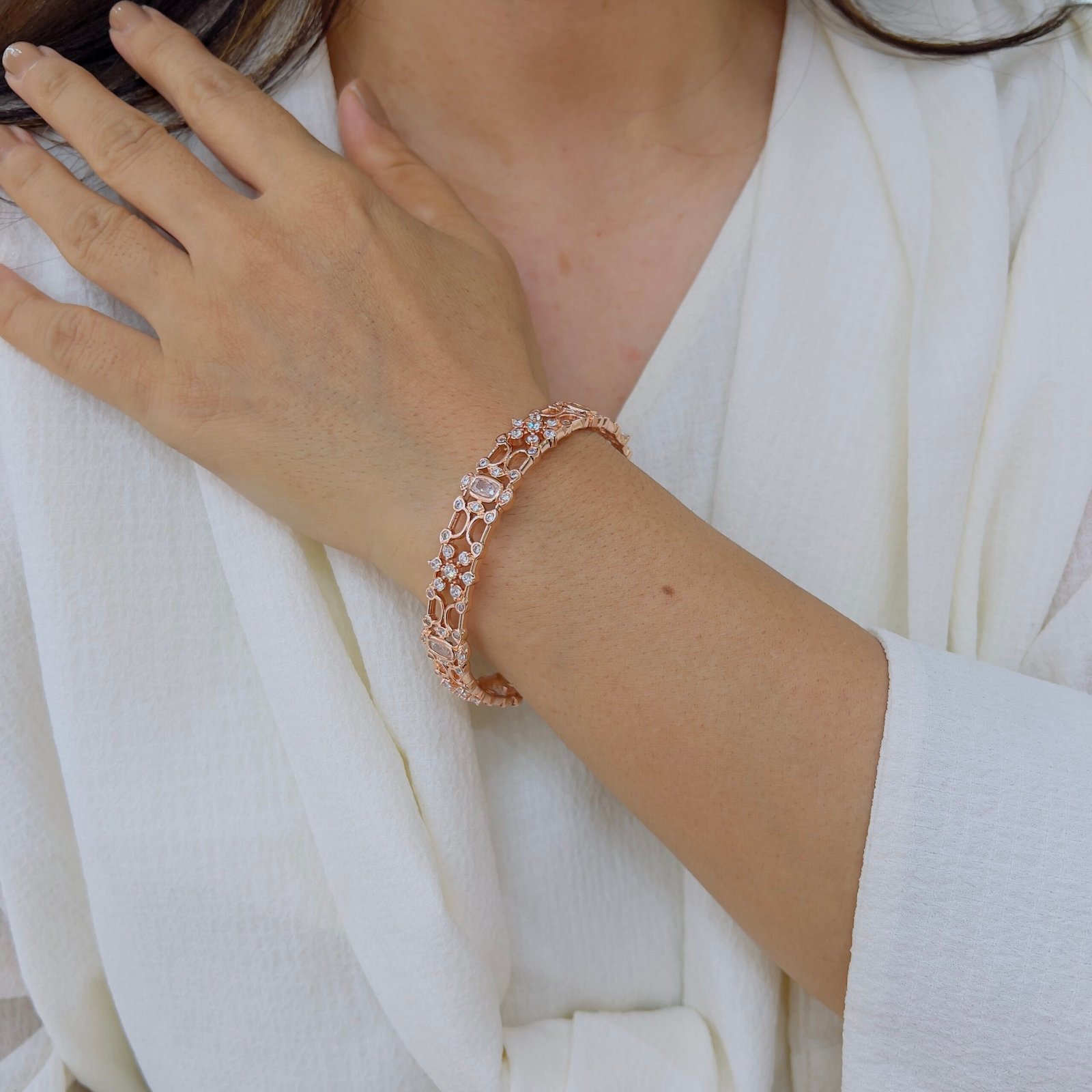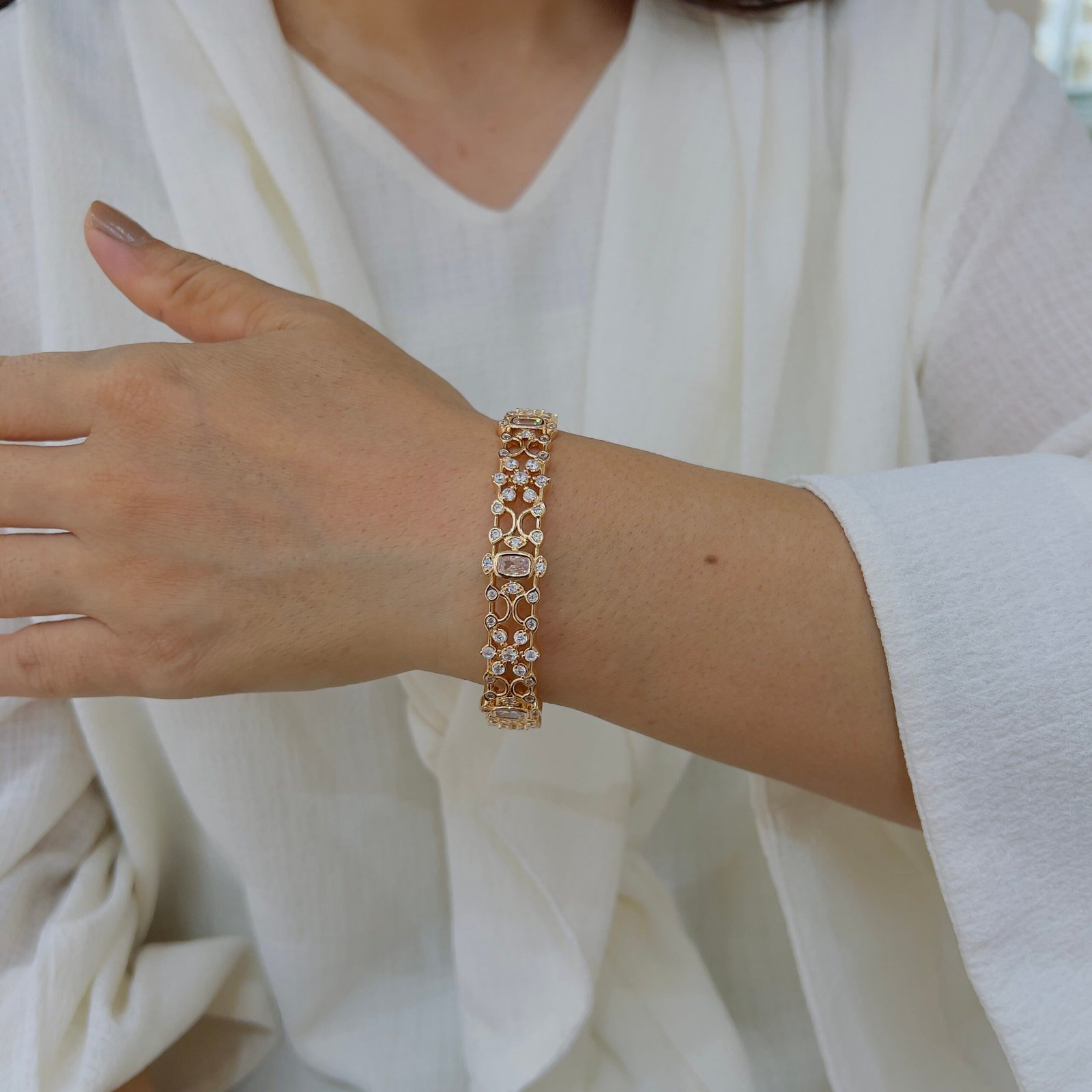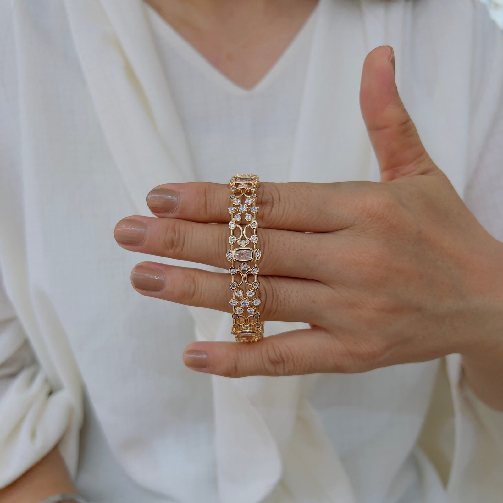 These 18k Gold-Plated Diamond Bangles feature shiny stones and are Anti-Tarnish with a strong build for rough use, Perfect for elegant daily wear and sophisticated professional looks.