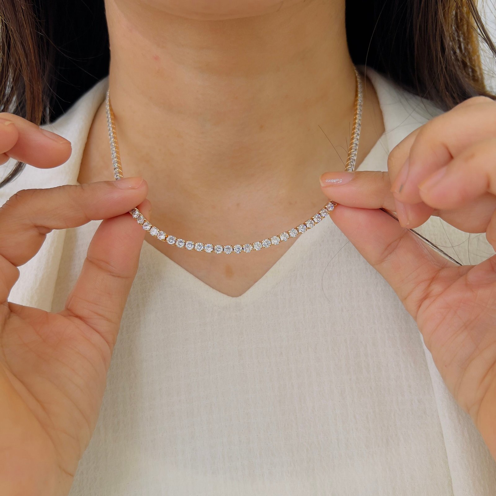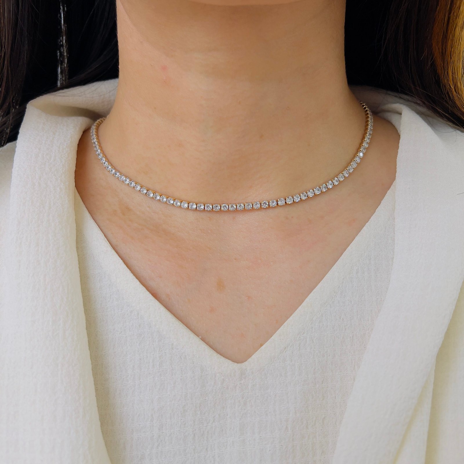 Designed for effortless elegance, this 18k gold plated, anti-tarnish necklace withstands rough use while keeping its shiny stones radiant. Ideal for daily wear, it adds a subtle yet luxurious charm to your office outfits.