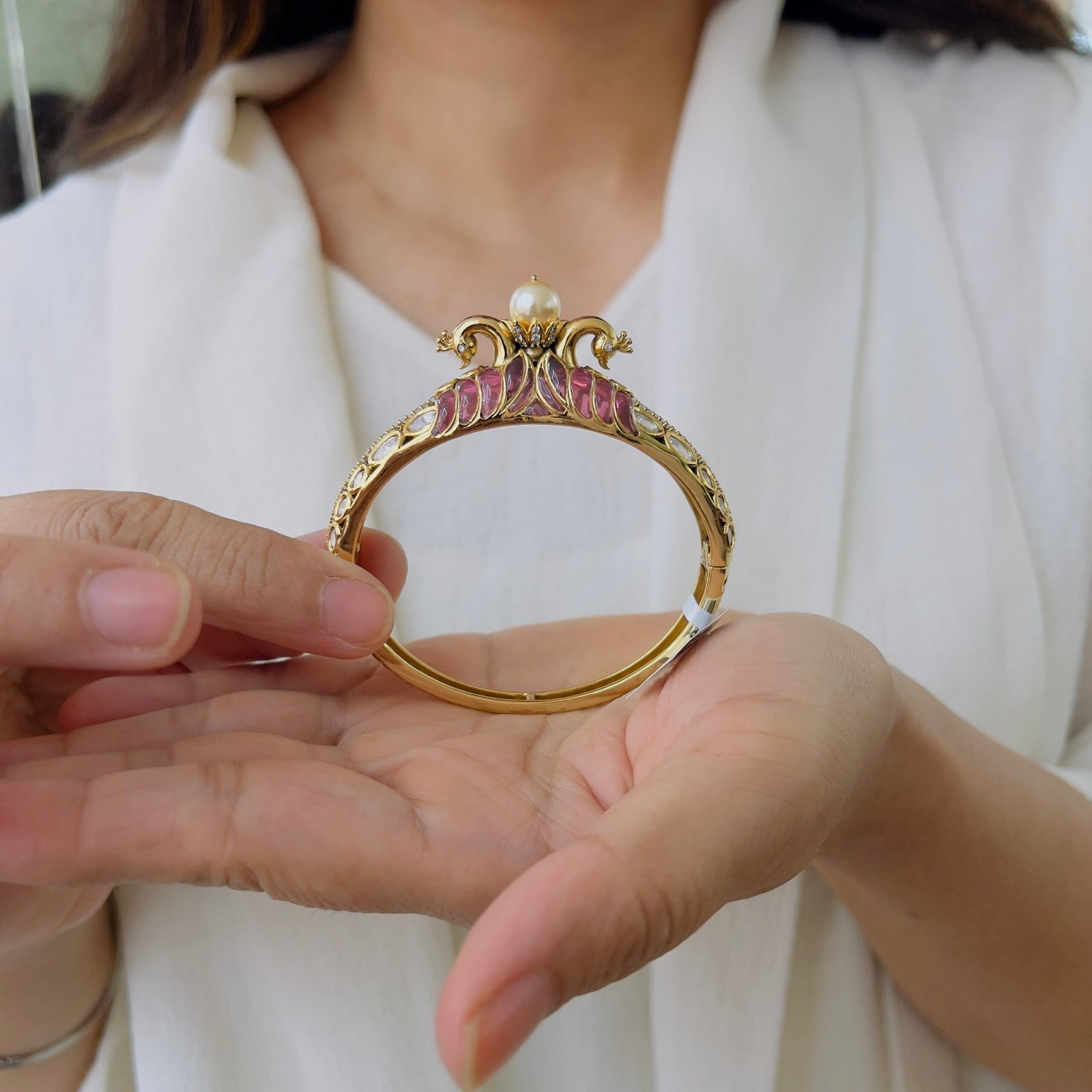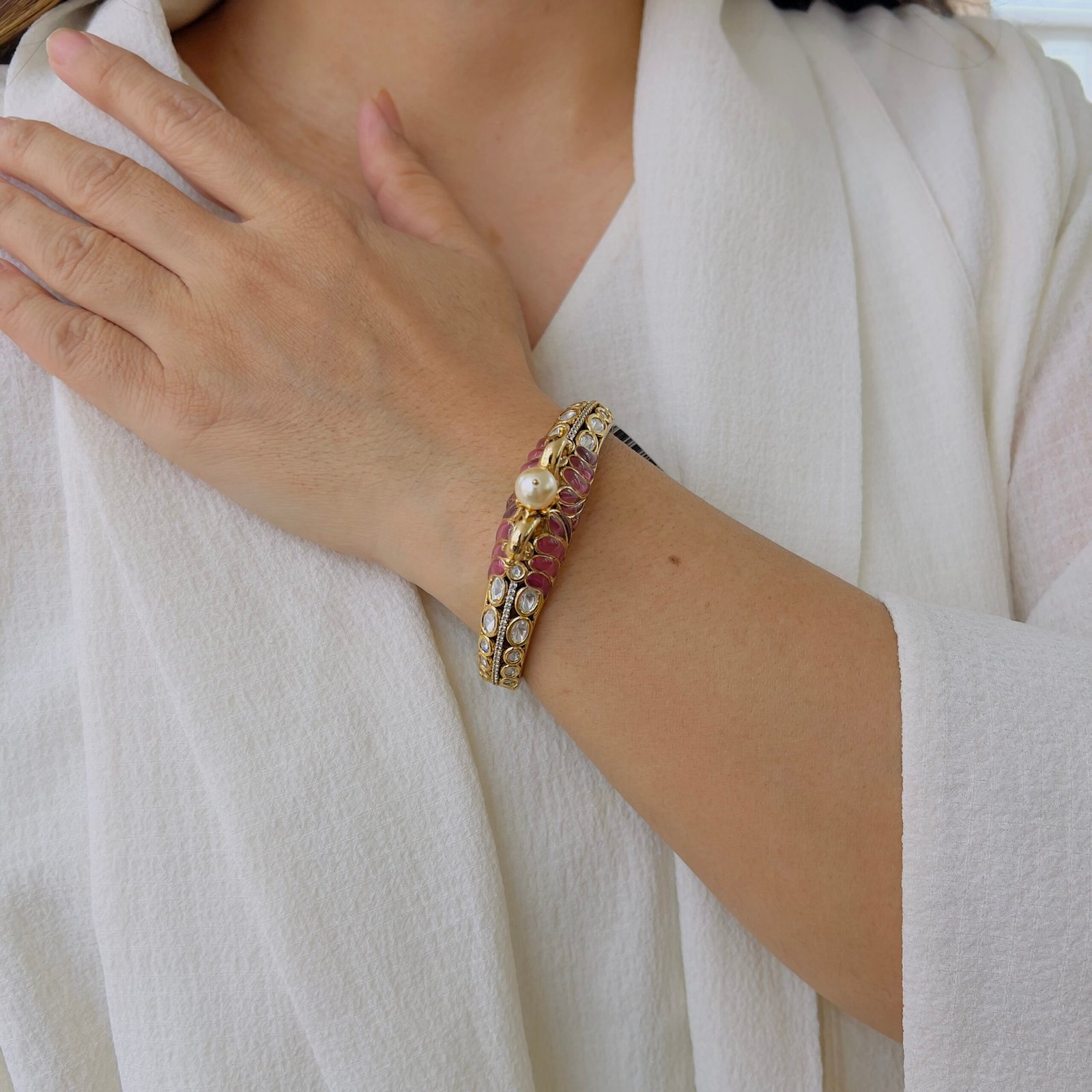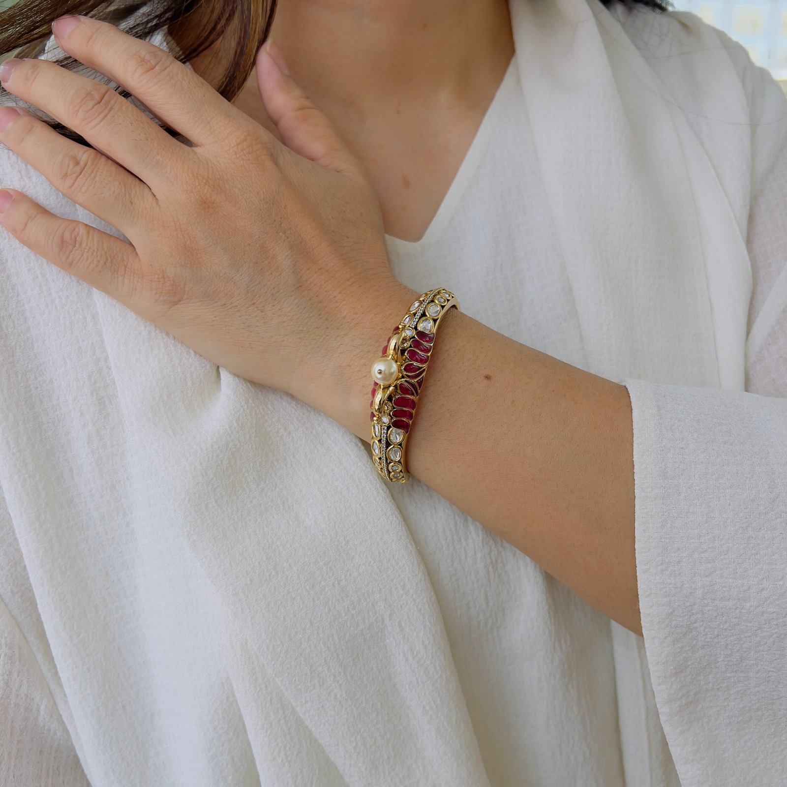 This elegant bracelet features rich ruby-tone stones beautifully set on a gold-finished base, highlighted with delicate pearl accents, Designed for timeless appeal, it adds a refined touch to festive wear, traditional outfits, and special occasions