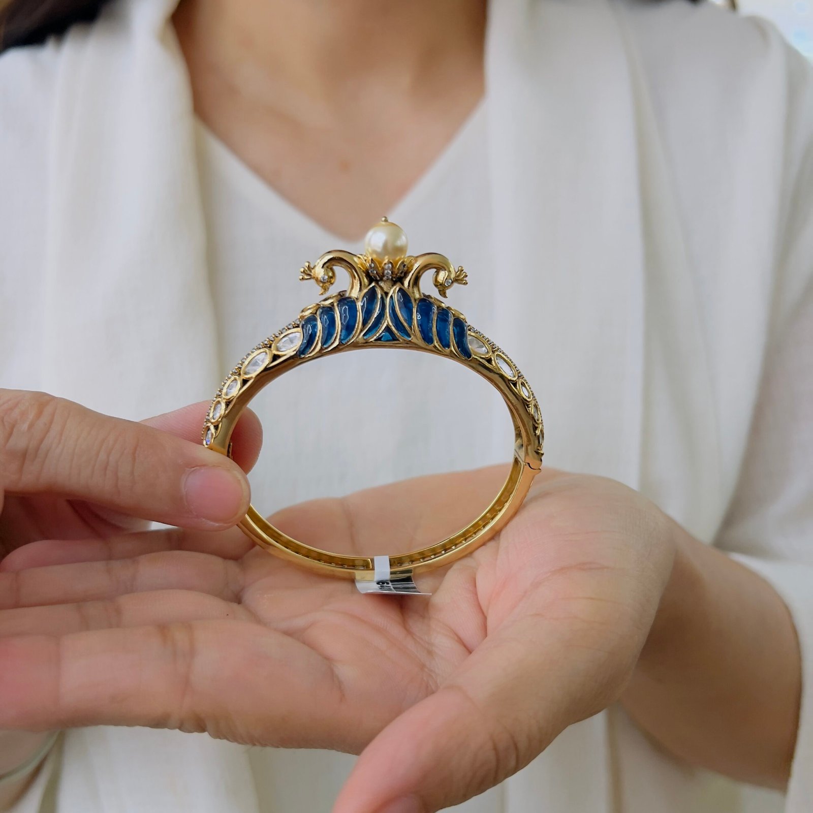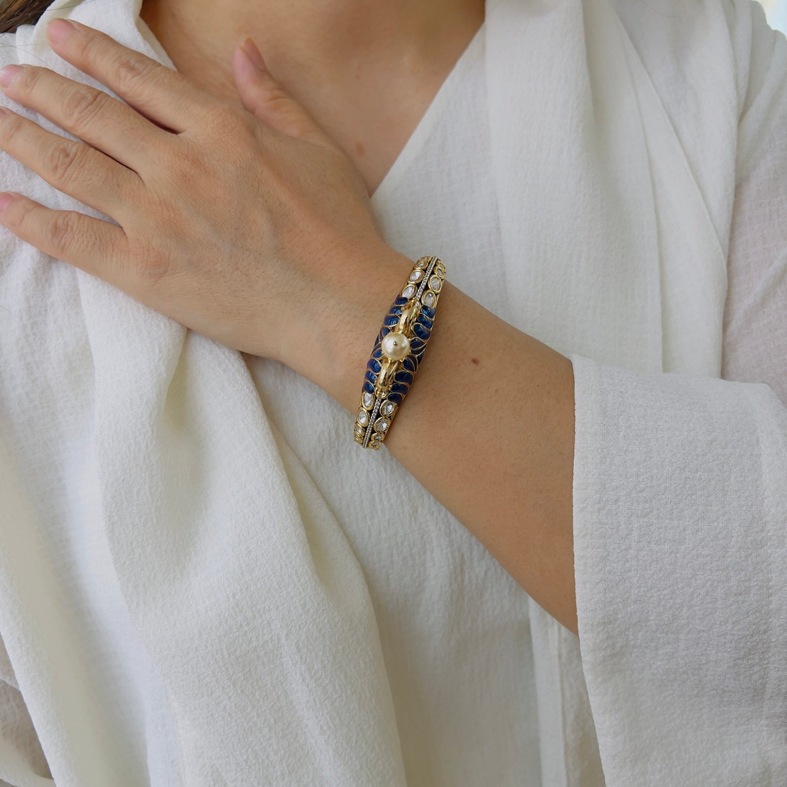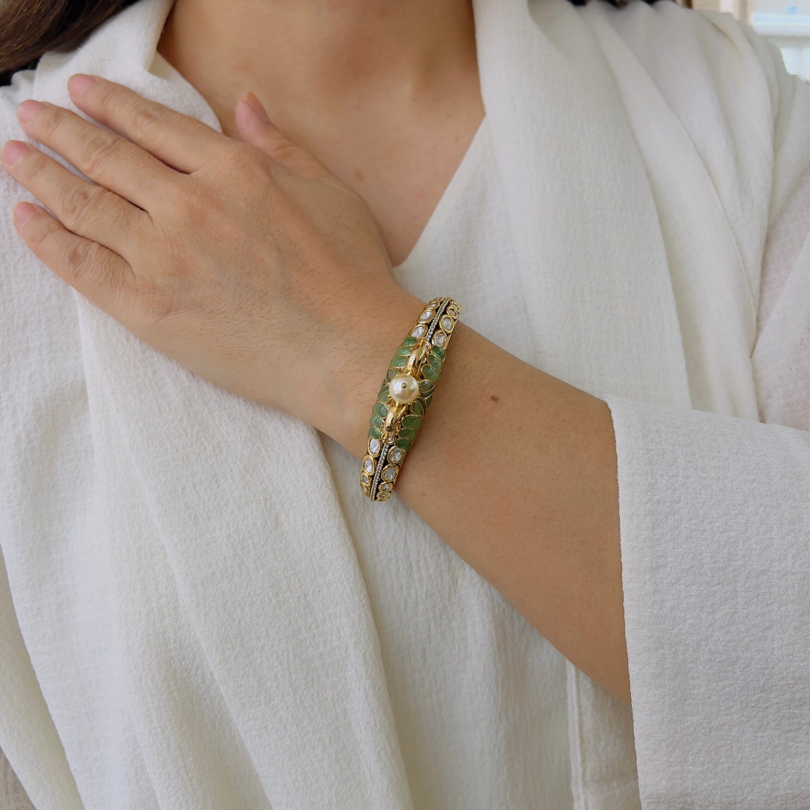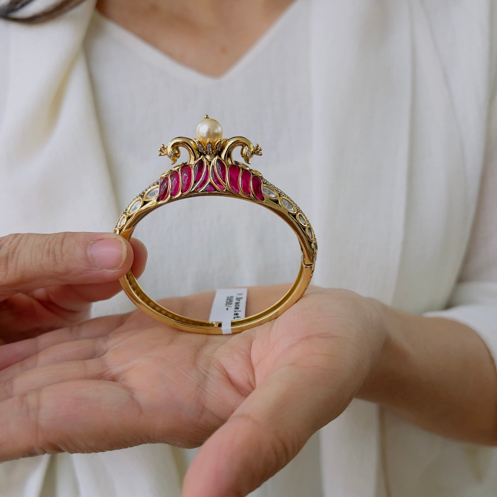 This elegant bracelet features rich ruby-tone stones beautifully set on a gold-finished base, highlighted with delicate pearl accents, Designed for timeless appeal, it adds a refined touch to festive wear, traditional outfits, and special occasions