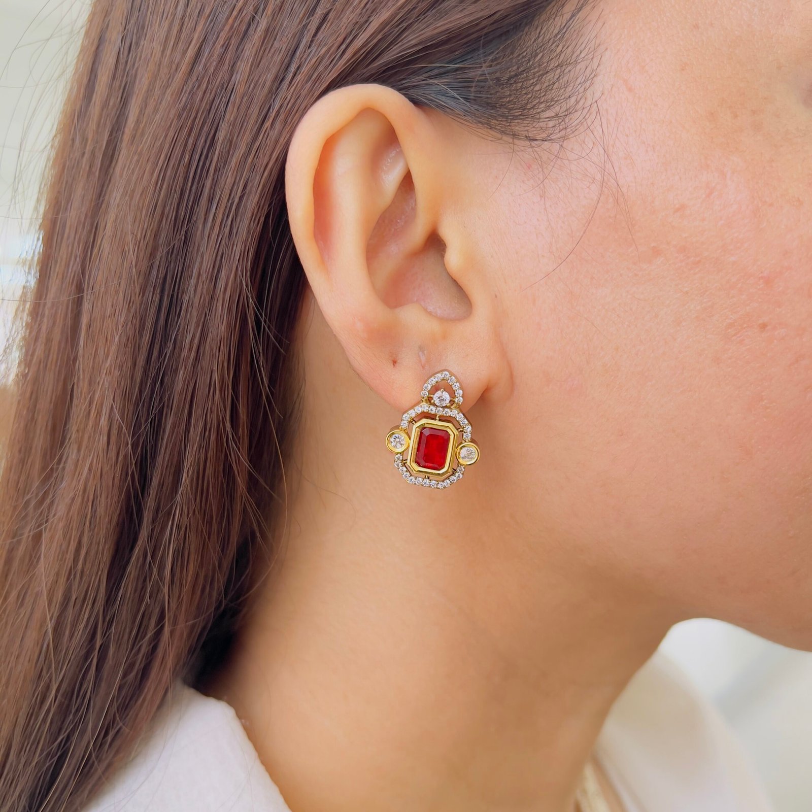 Make a bold, sophisticated statement with this stunning ruby-red necklace set. The centerpiece is a magnificent emerald-cut ruby stone, encased in a gold-toned frame accented with shimmering white crystals. Suspended from twelve delicate strands of creamy ivory seed pearls, this necklace offers a luxurious “drape” that feels like a second skin. Paired with matching minimalist studs, this set is the perfect choice for an elegant evening gala, a cocktail party, or a modern bridal reception.