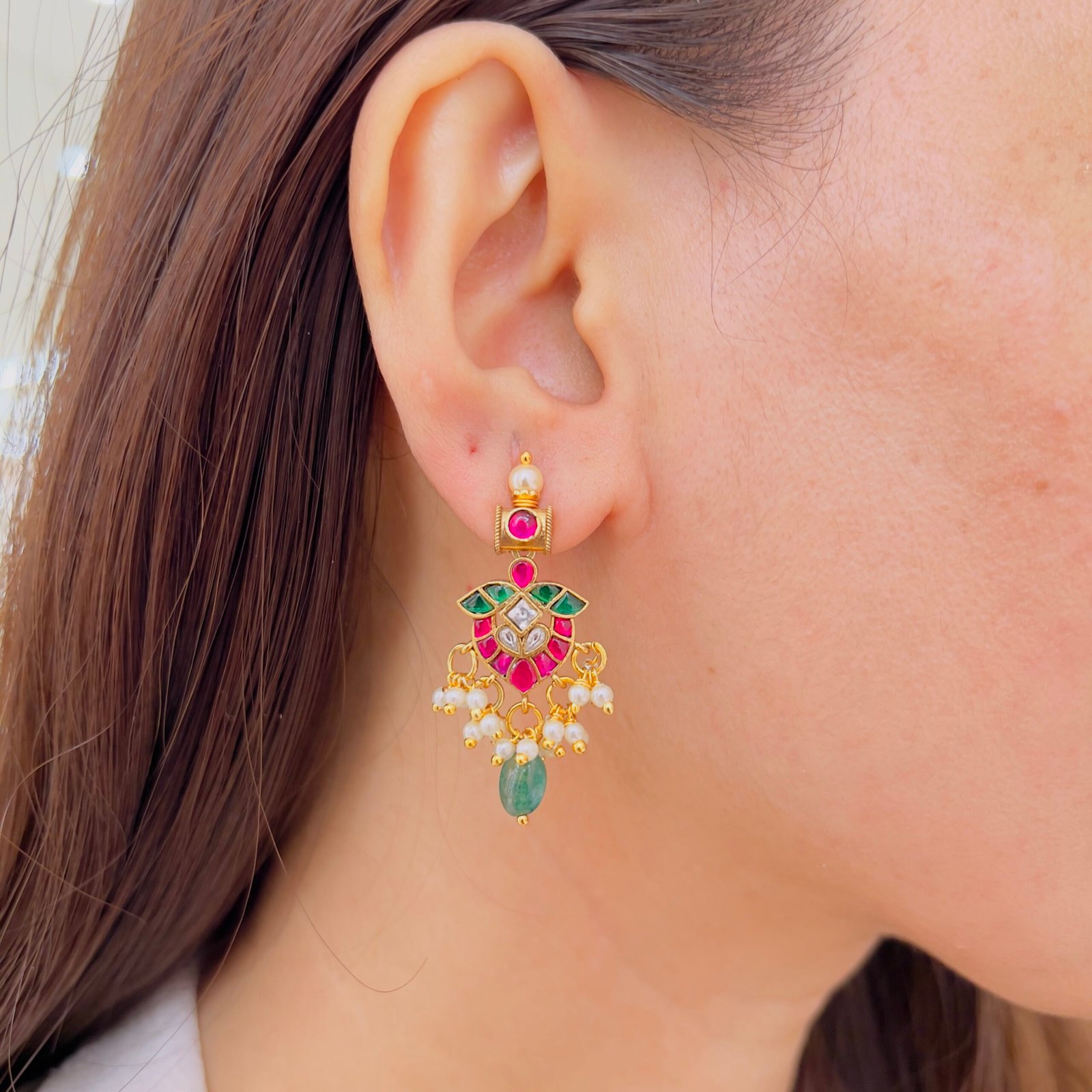 A graceful pair of Jadau earrings designed with intricate stone work and elegant bead drops, The perfect statement accessory for weddings, festive occasions, and traditional celebrations.