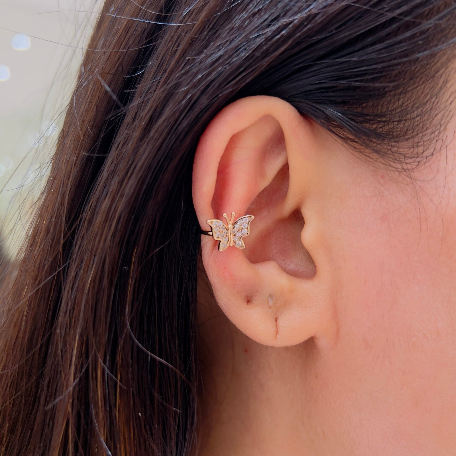 Embrace subtle elegance with this 18k gold plated butterfly ear cuff, featuring shiny stones and an anti tarnish finish. Designed for rough use, it’s perfect for daily wear and adds charm to your modern style.