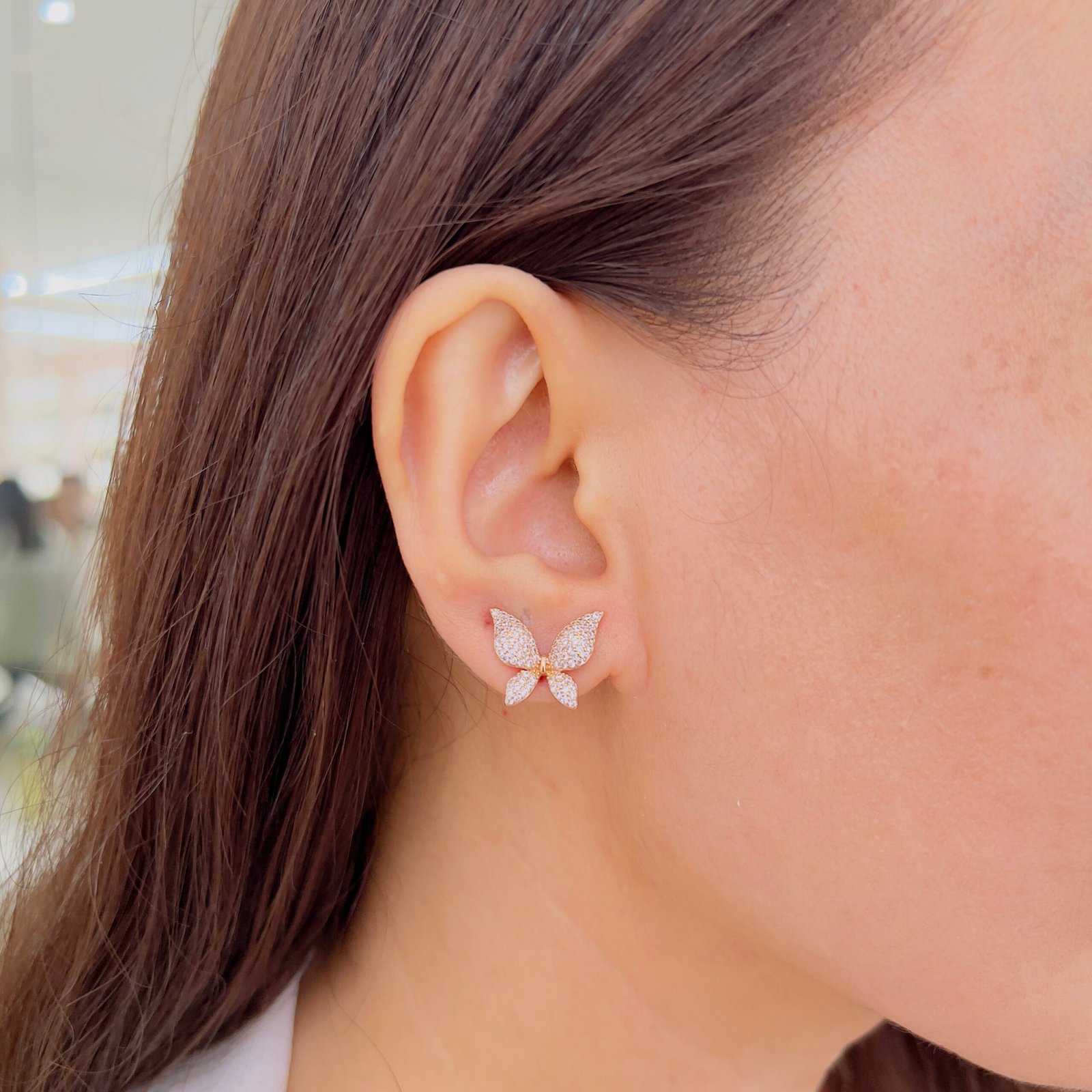 Delicate butterfly design studs crafted with an 18K gold-plated finish, anti-tarnish coating, and shiny stones. Lightweight and durable, perfect for daily use, rough wear, and elegant office styling.