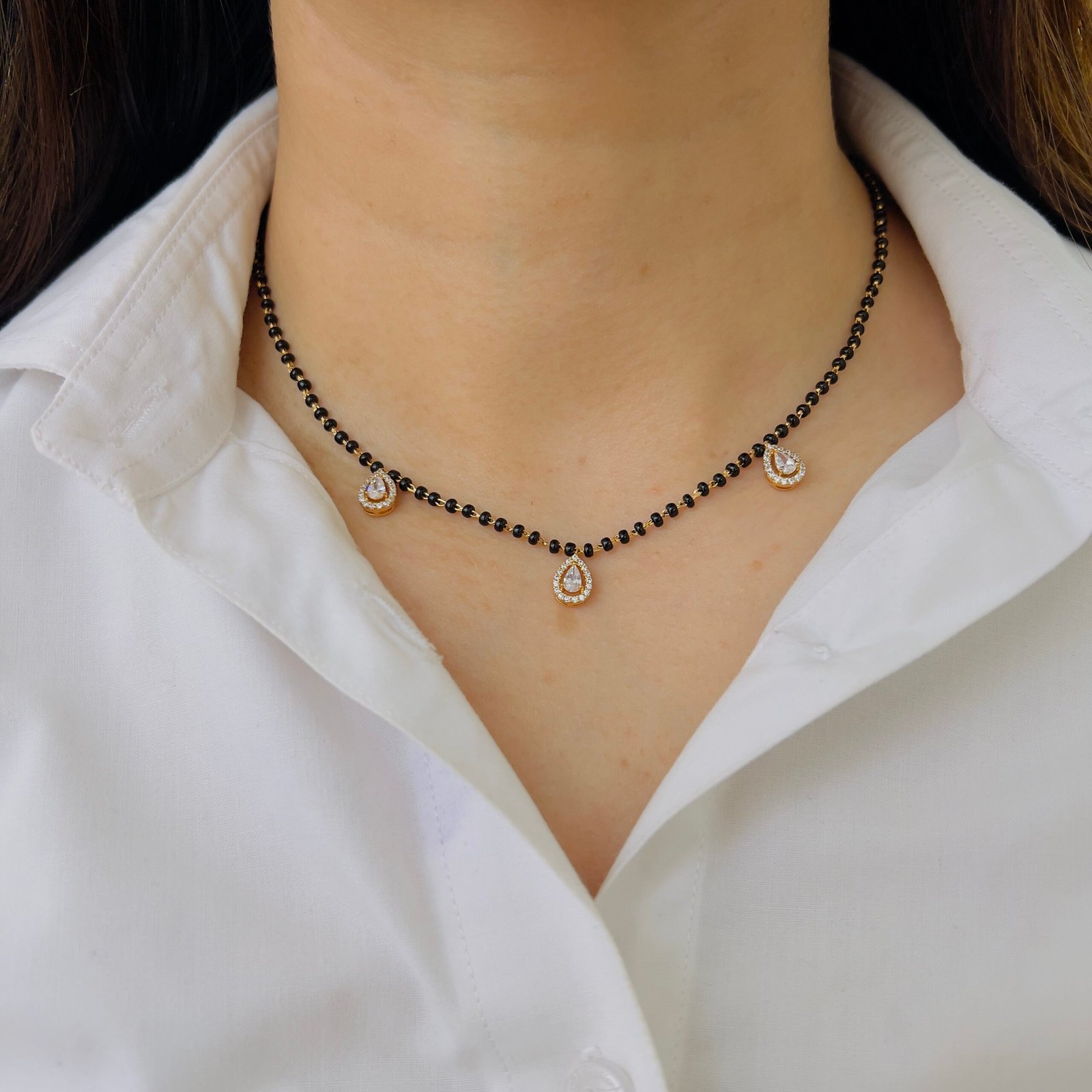 This daily wear mangalsutra features a sleek, modern design crafted with 18K gold plating and anti-tarnish shine, Lightweight, comfortable, and suitable for rough use, it adds a classy everyday touch with its shiny stones and durable finish—perfect for office and daily wear.