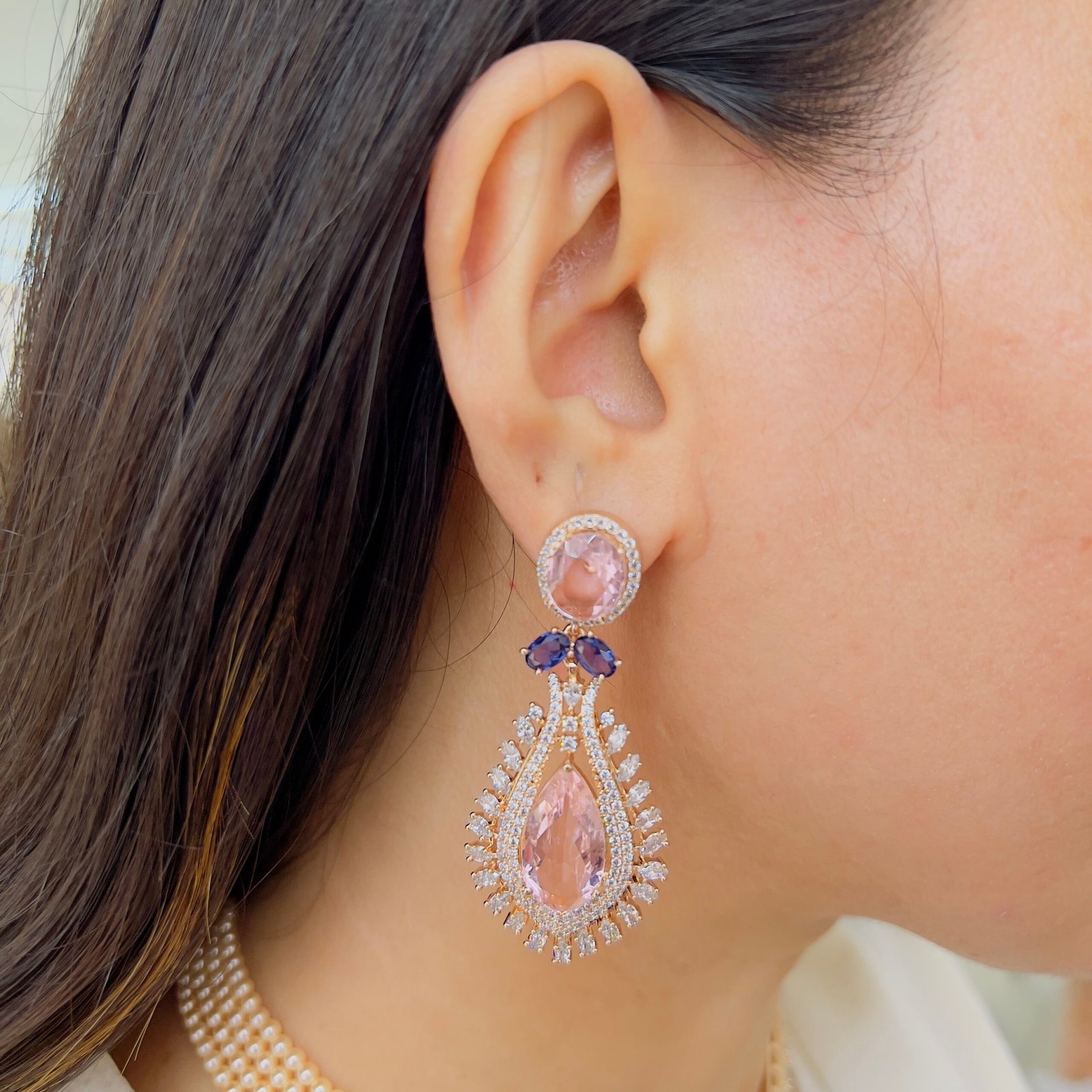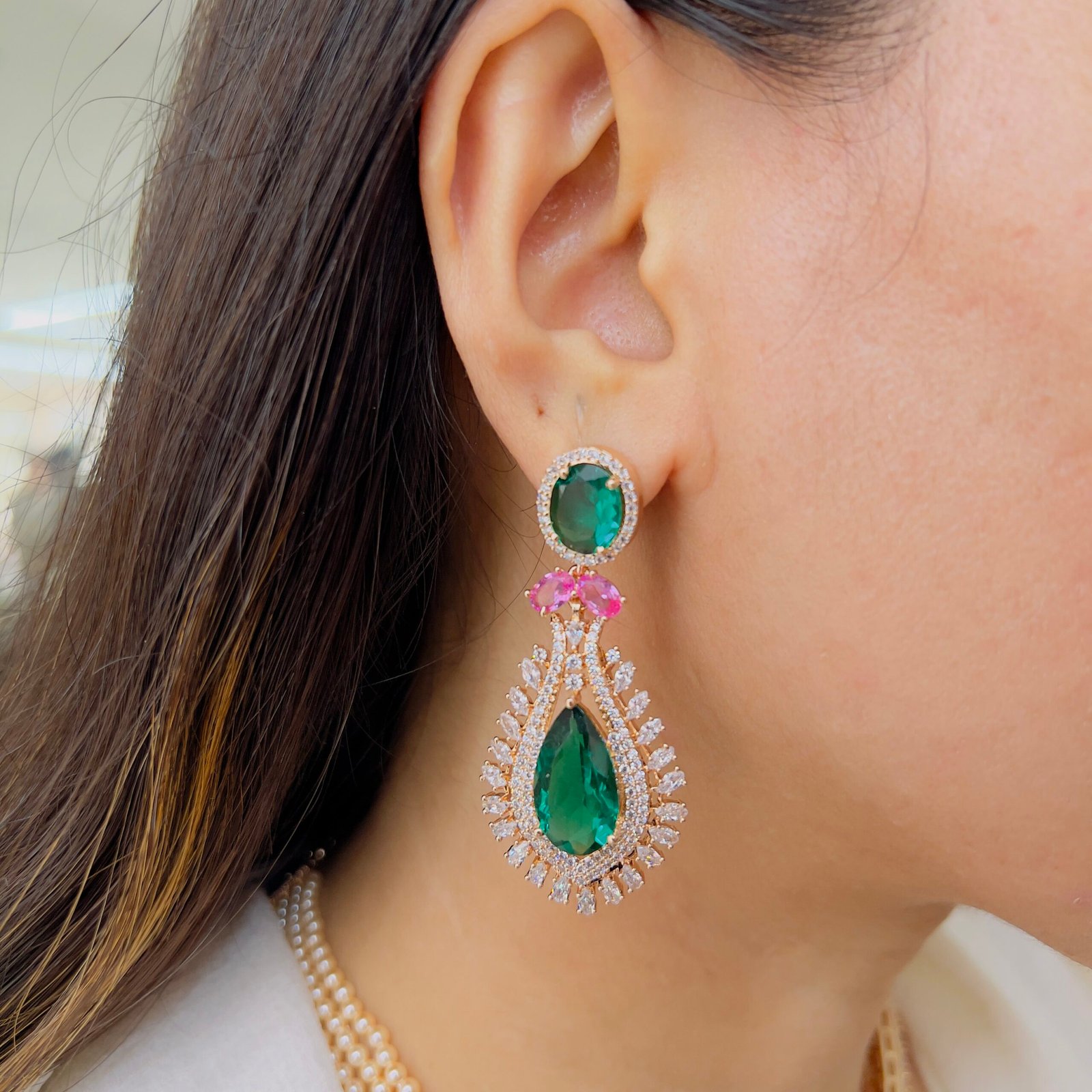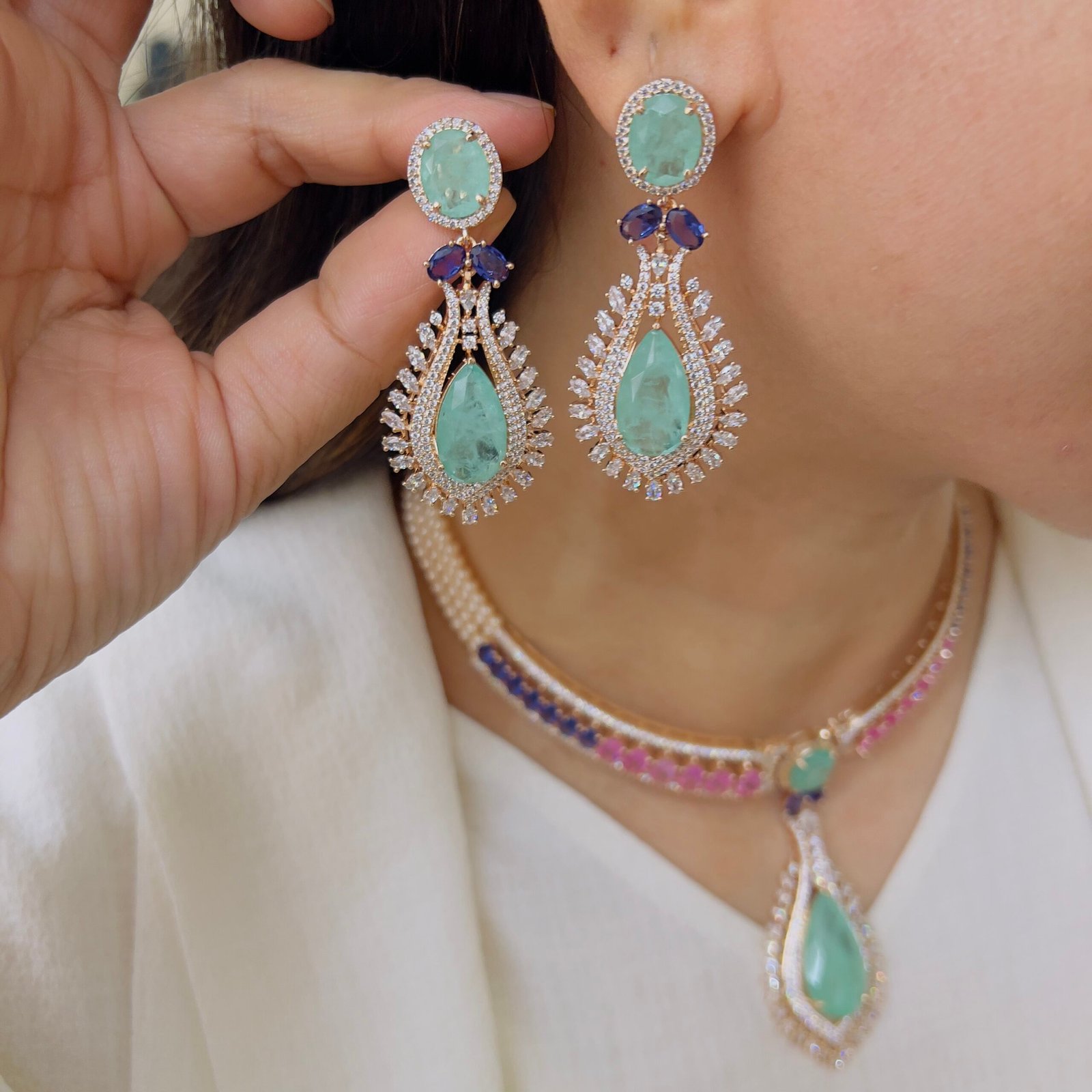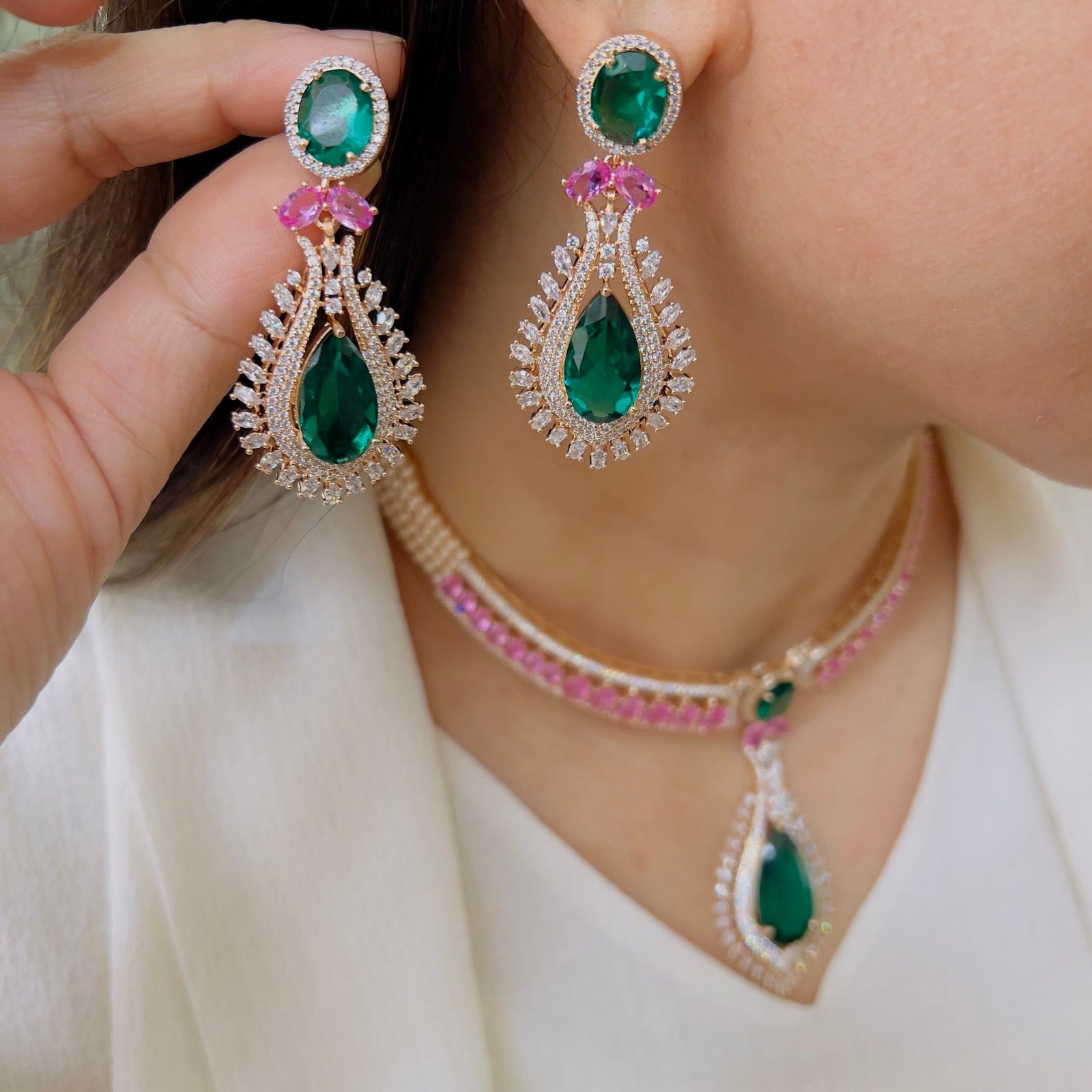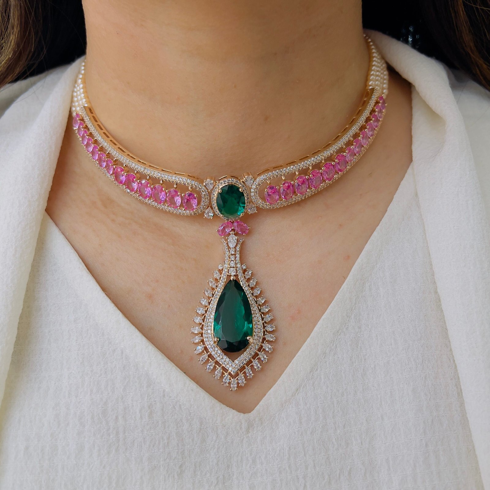 This gorgeous necklace set features a beautifully crafted center drop pendant surrounded by sparkling detailing, With its refined design and vibrant stones, it’s perfect for festive occasions, weddings, and statement traditional looks.
