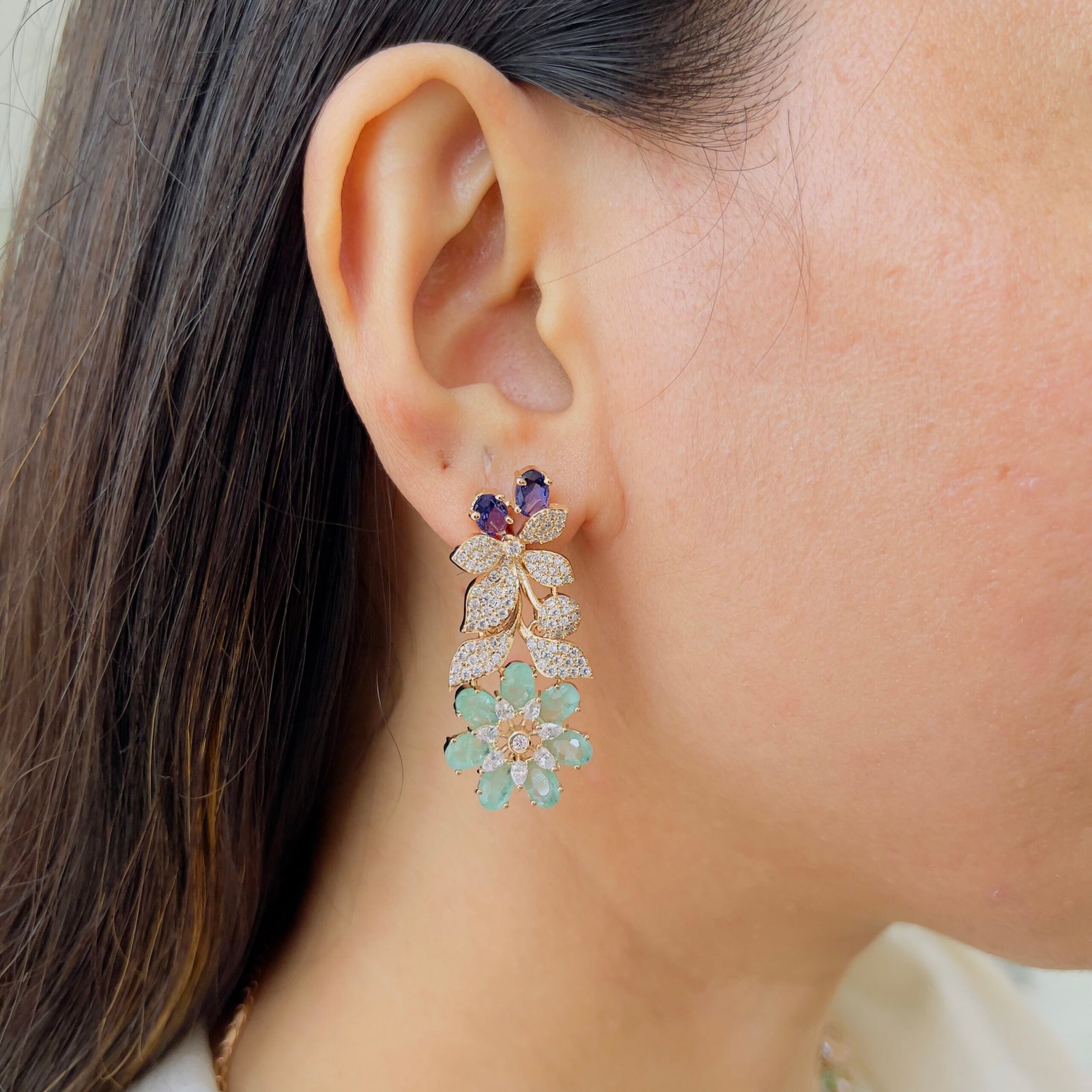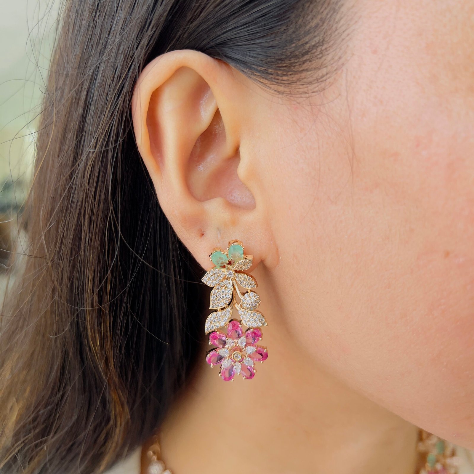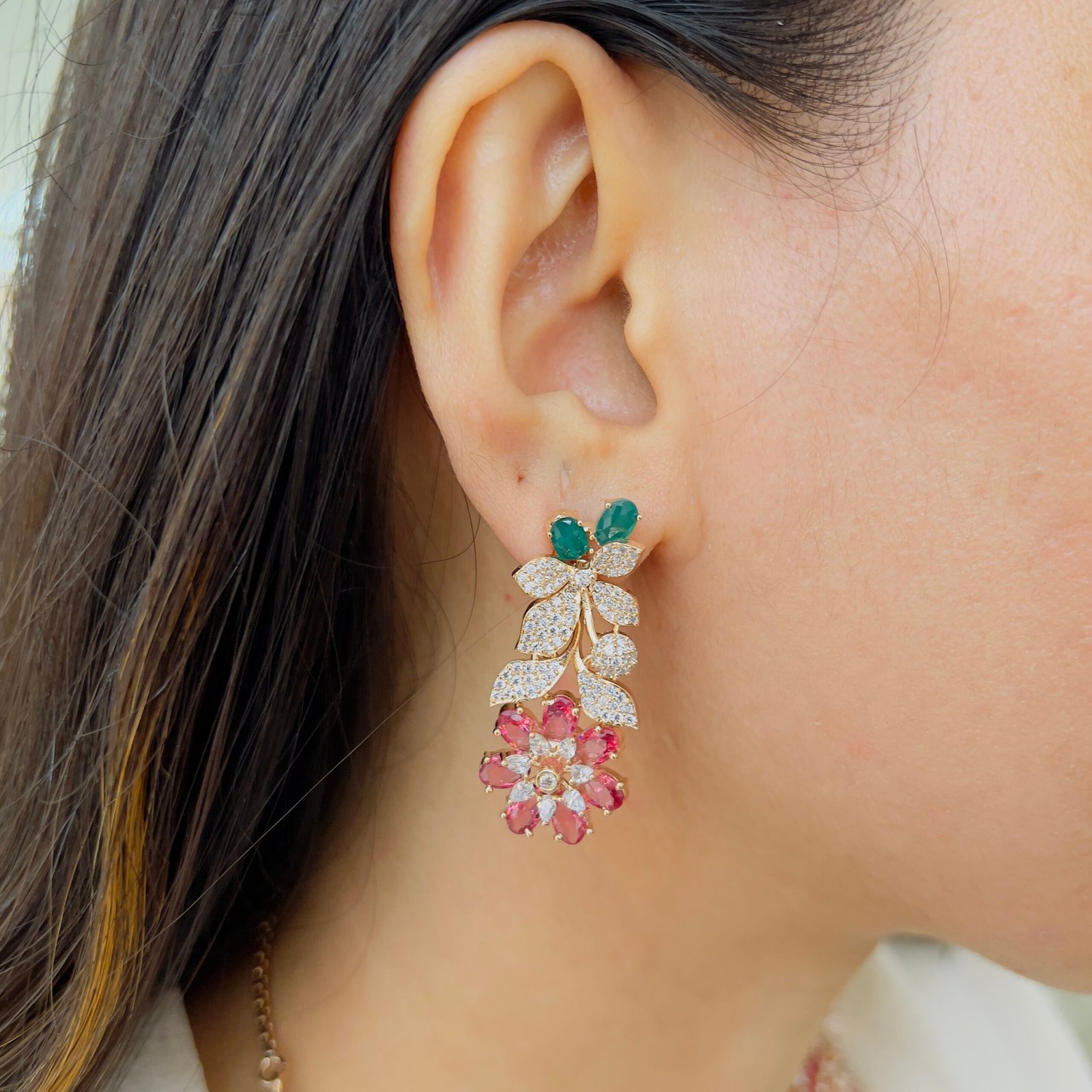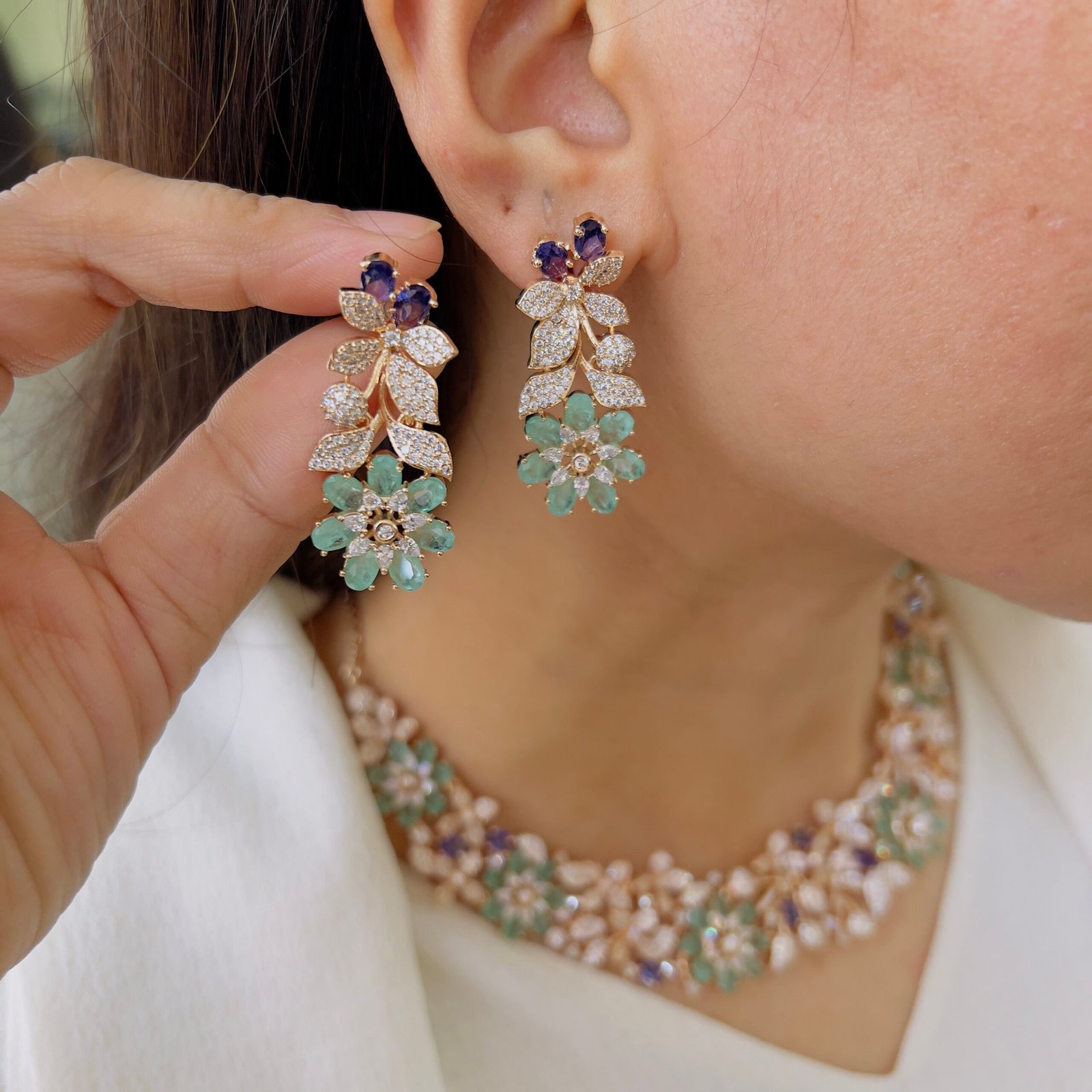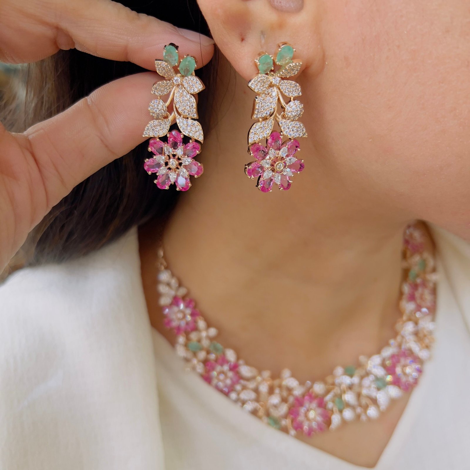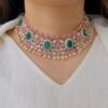 This beautifully crafted necklace set features intricate floral detailing that adds a graceful charm to any outfit, Its sparkling elements create a luxurious look, perfect for festive occasions, weddings, and grand events.