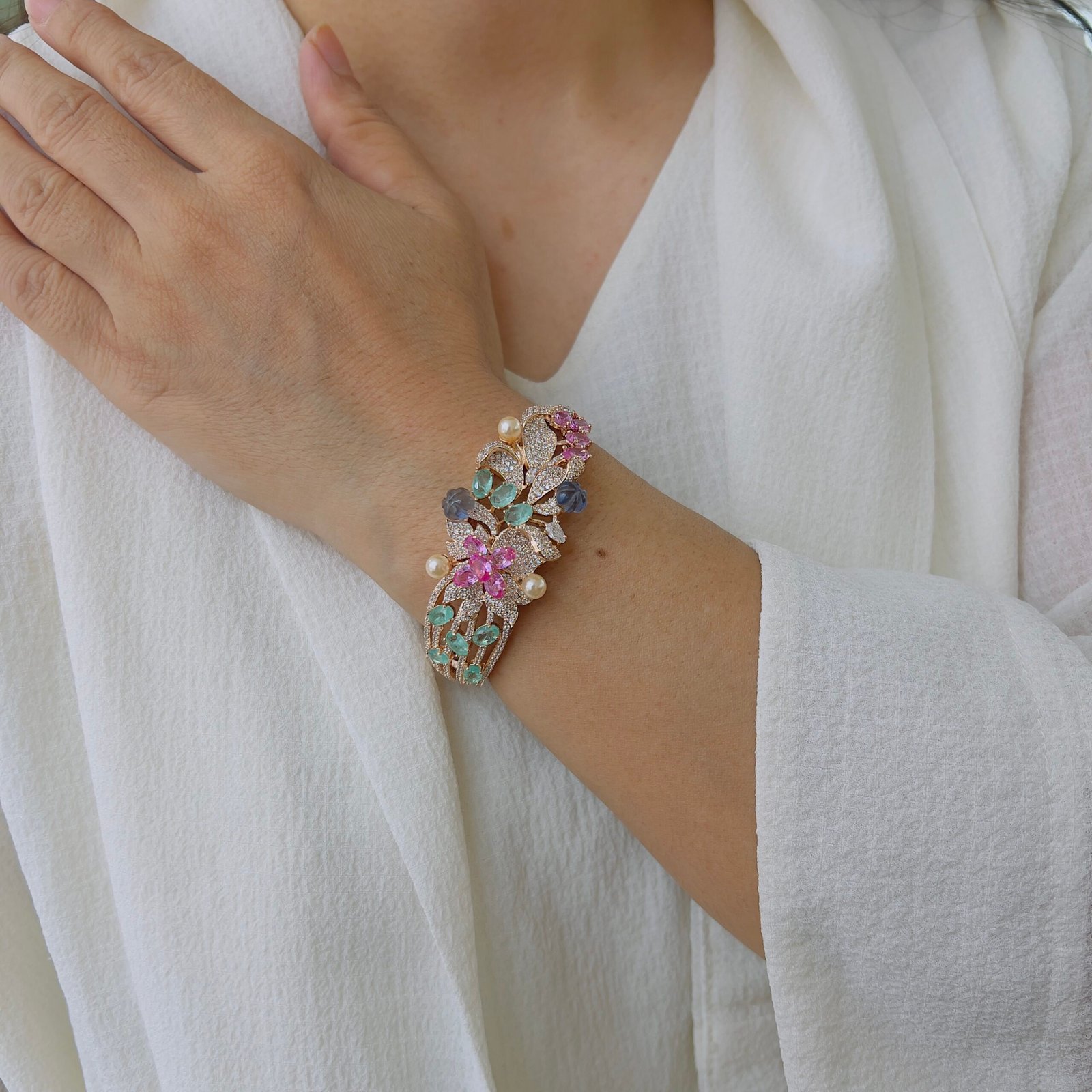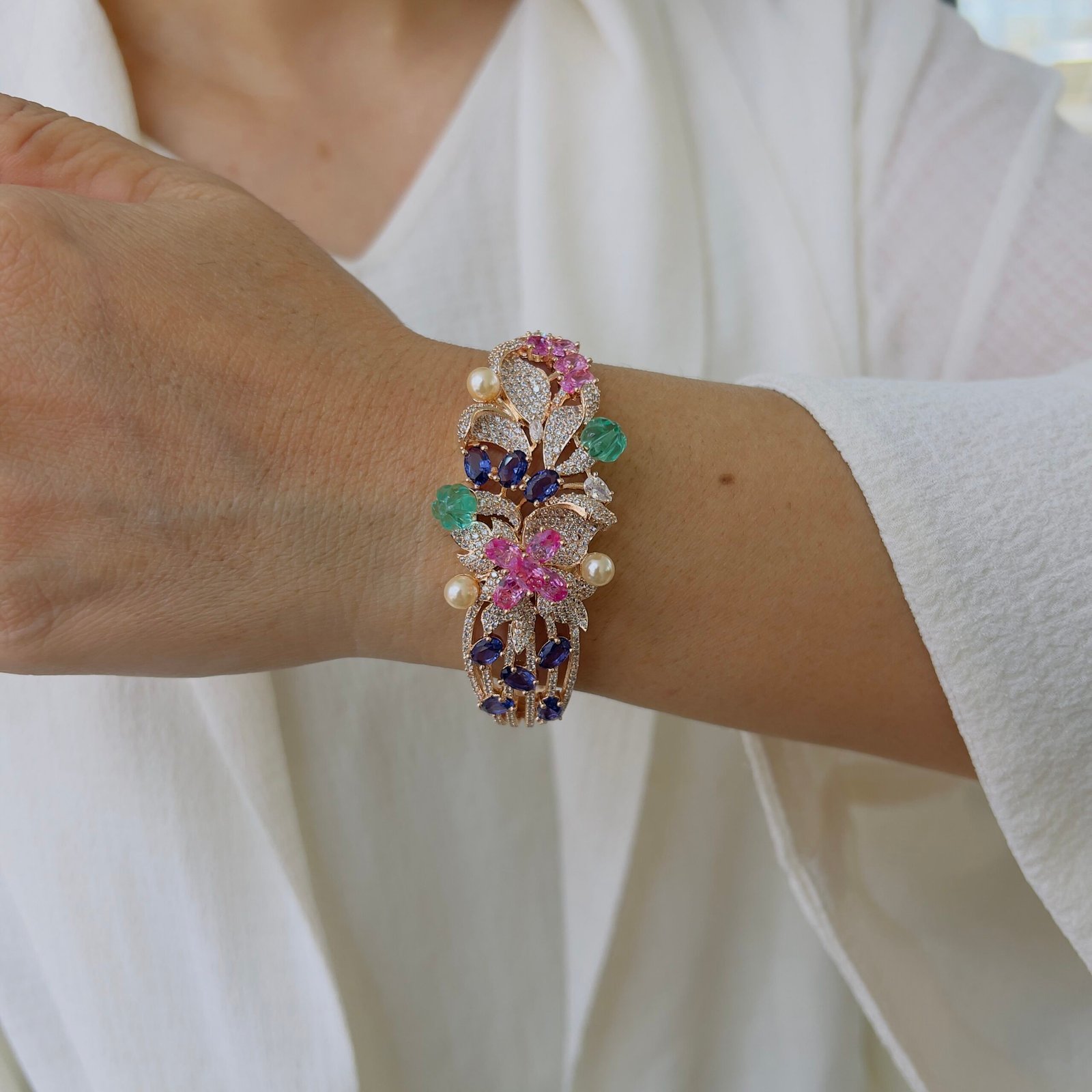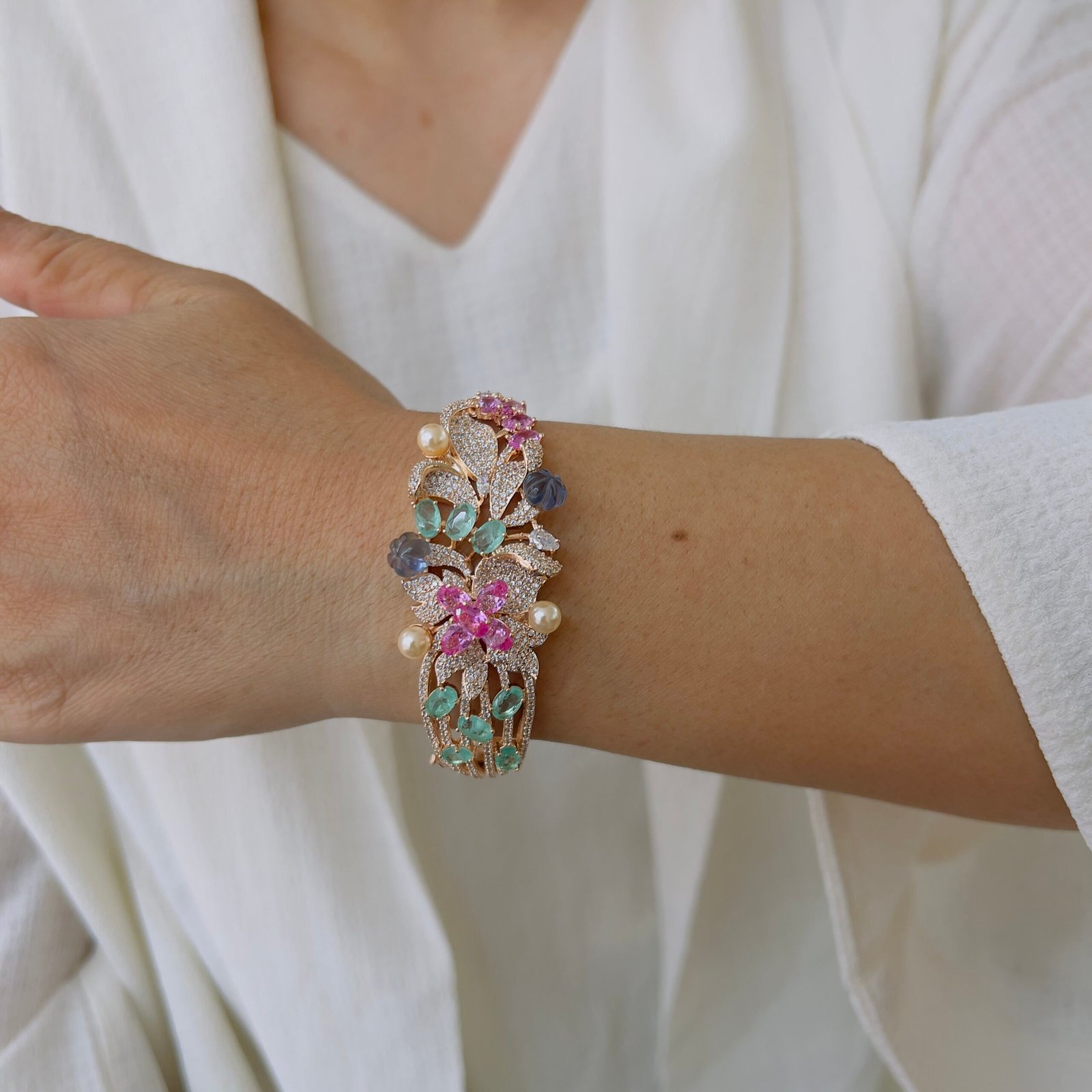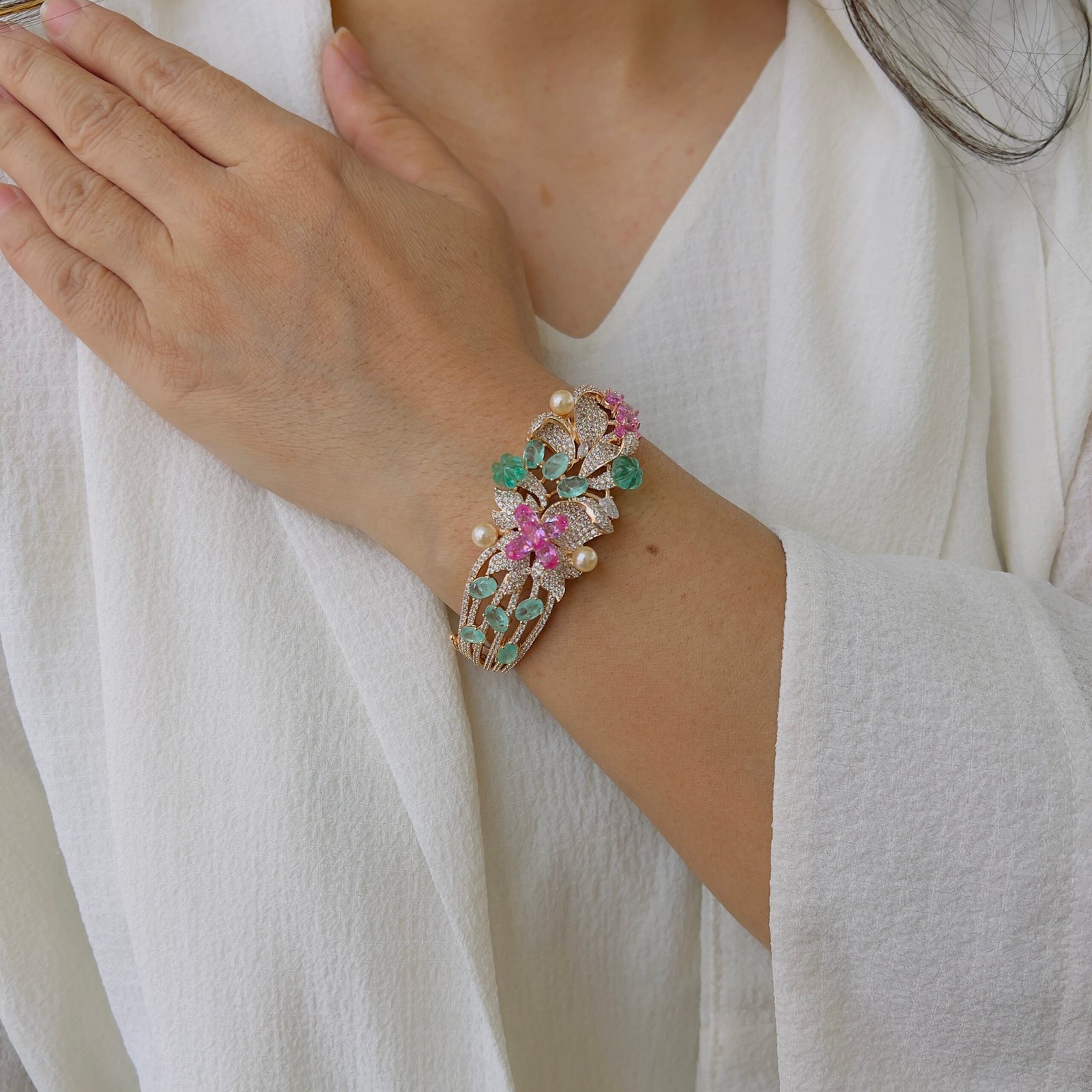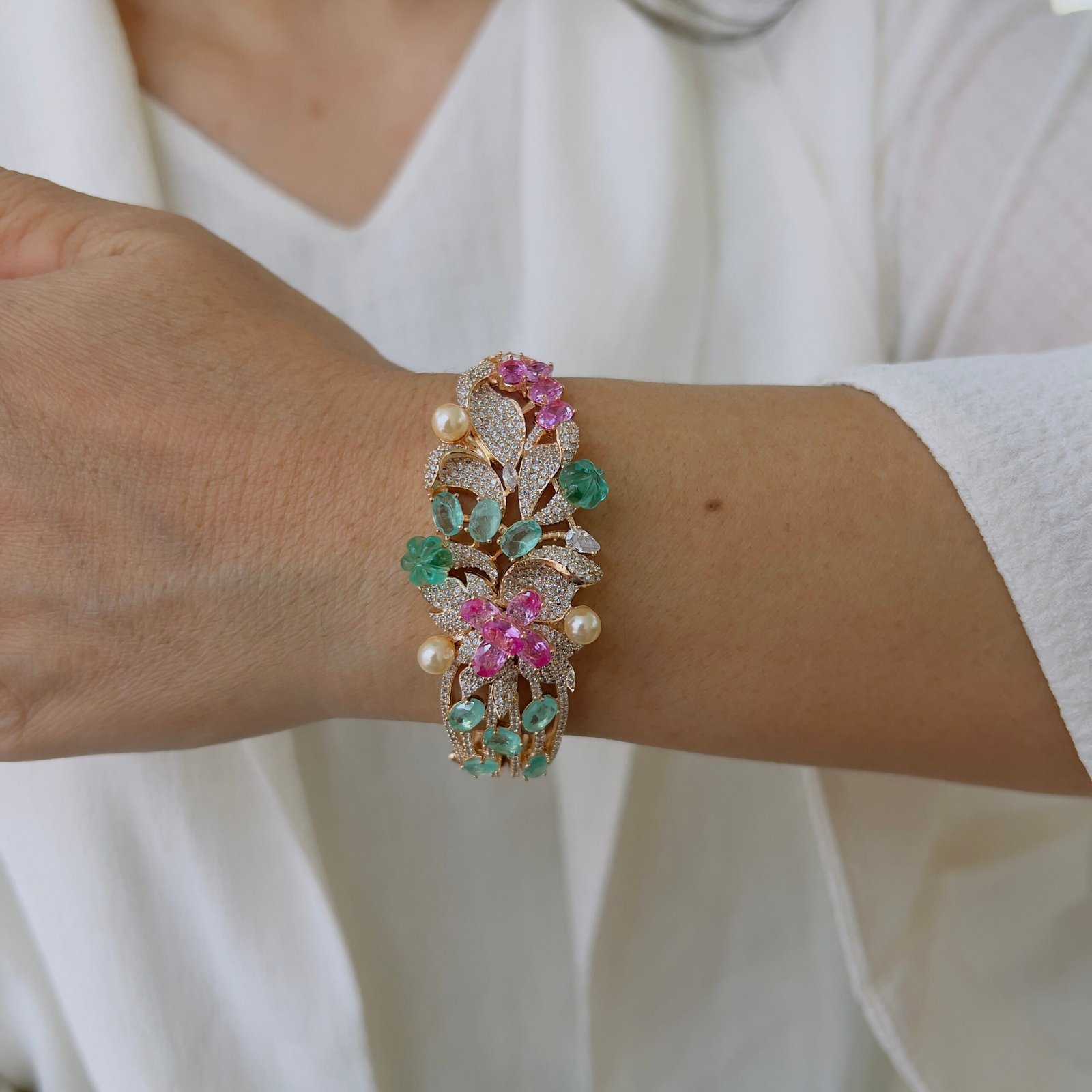 This beautifully crafted bracelet features an intricate floral design with finely set stones and delicate detailing, Its graceful structure and rich finish add a luxurious touch, making it perfect for festive occasions, celebrations, and elegant evening looks.