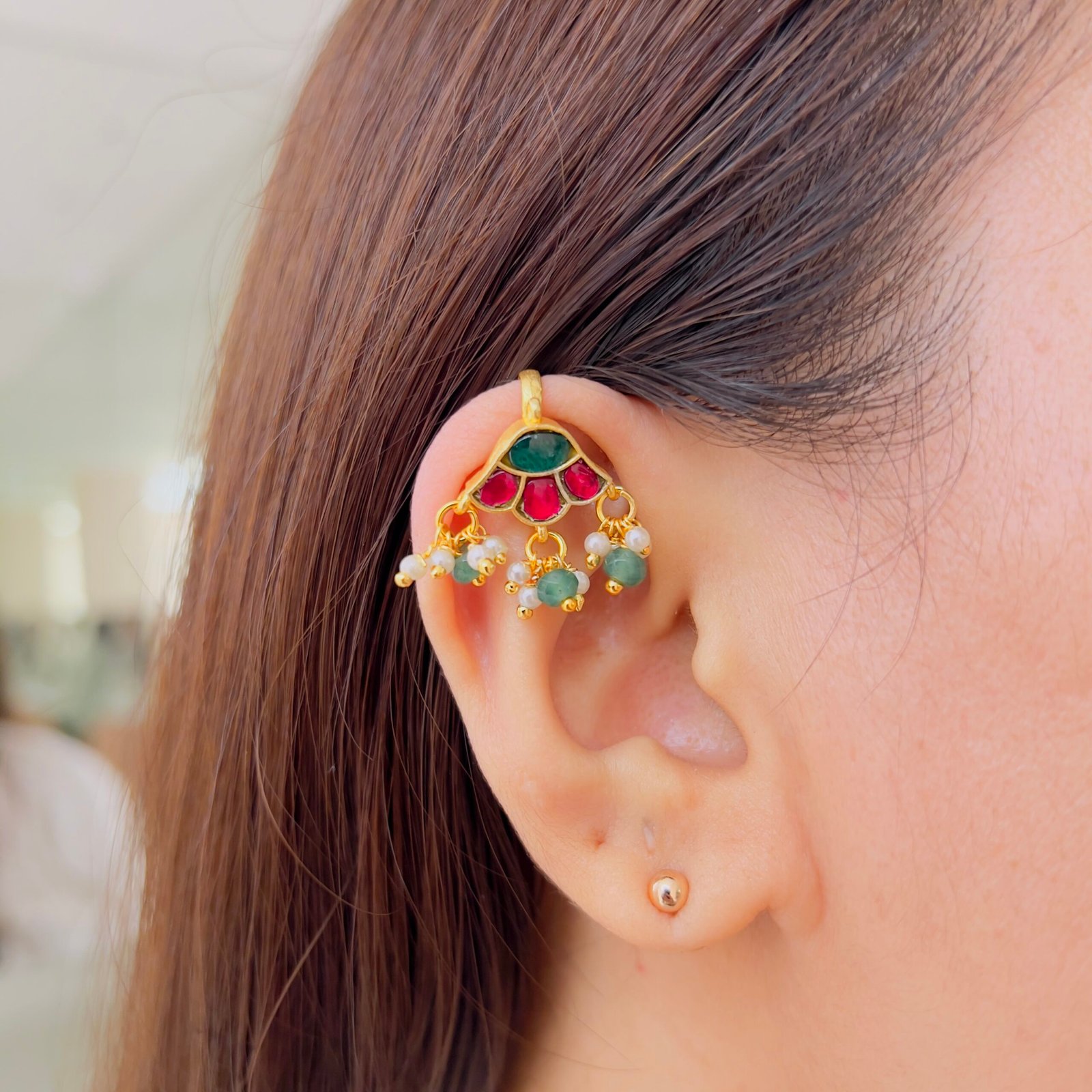 Add a touch of vintage luxury with this intricately detailed Jadau buggadi. Its unique design and antique finish make it a standout piece for special occasions.