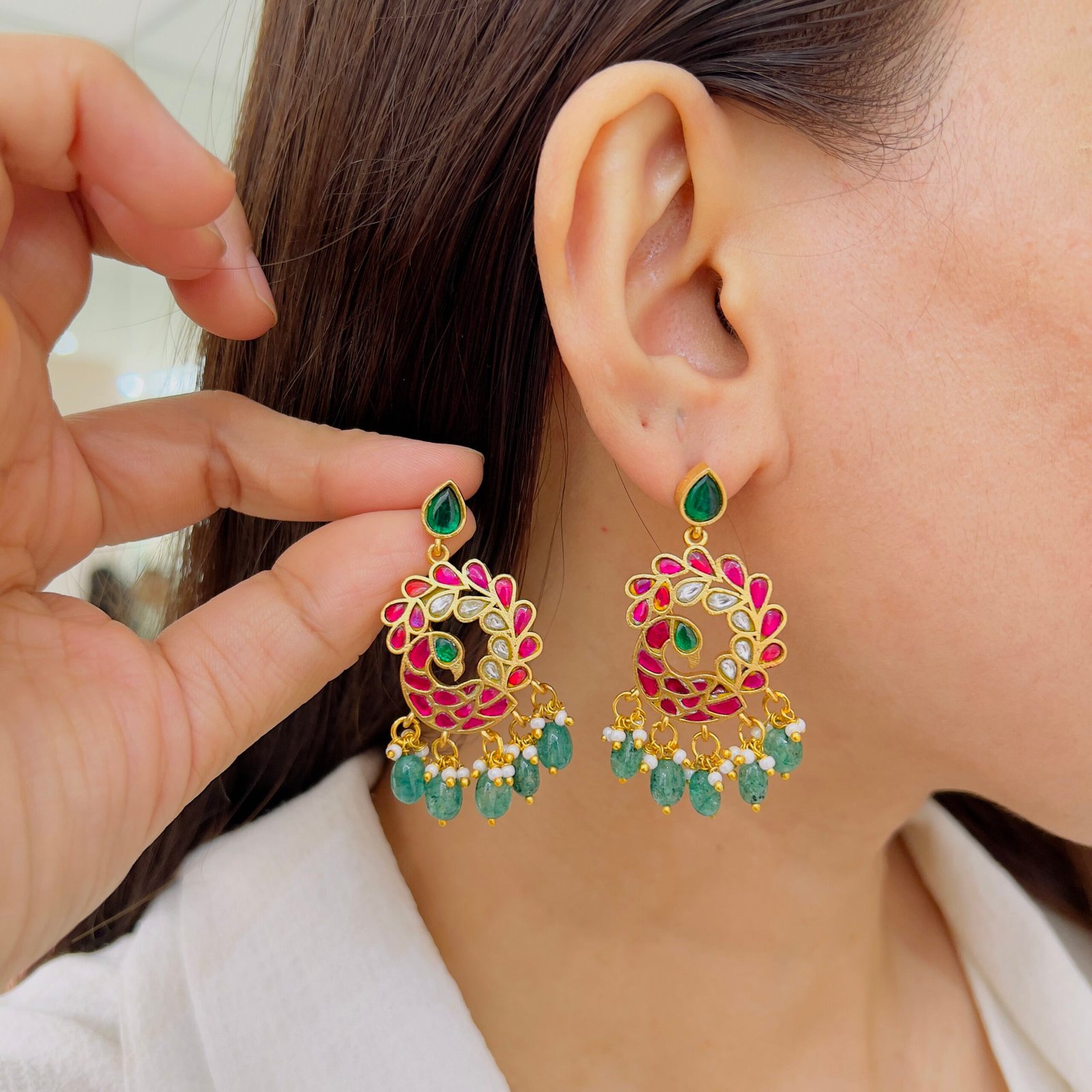 These graceful jadau earrings feature a peacock-inspired motif adorned with pink and white kundan stones, finished with a green teardrop stud and delicate green bead drops. Perfect for festive wear, weddings, and ethnic celebrations.