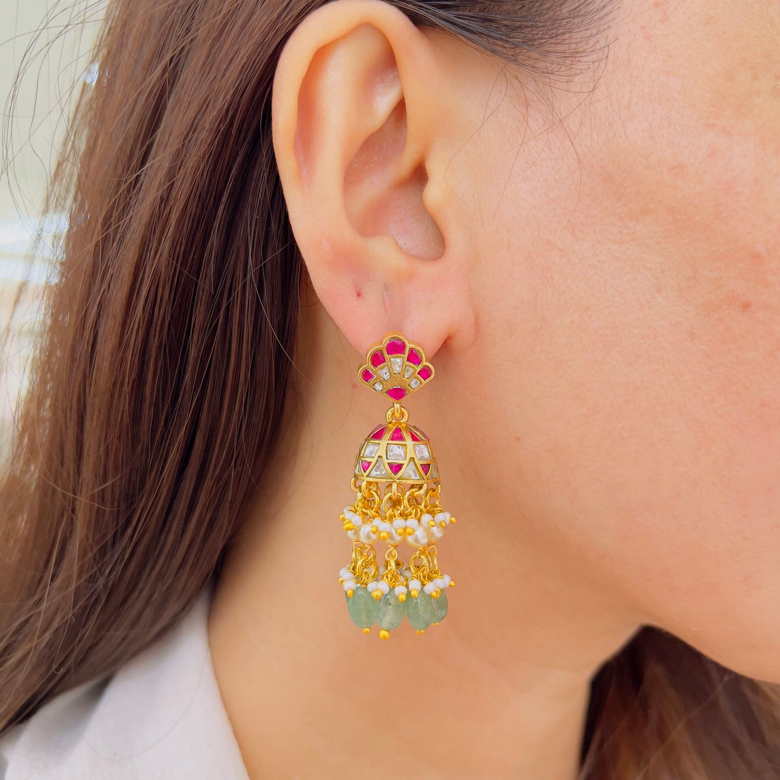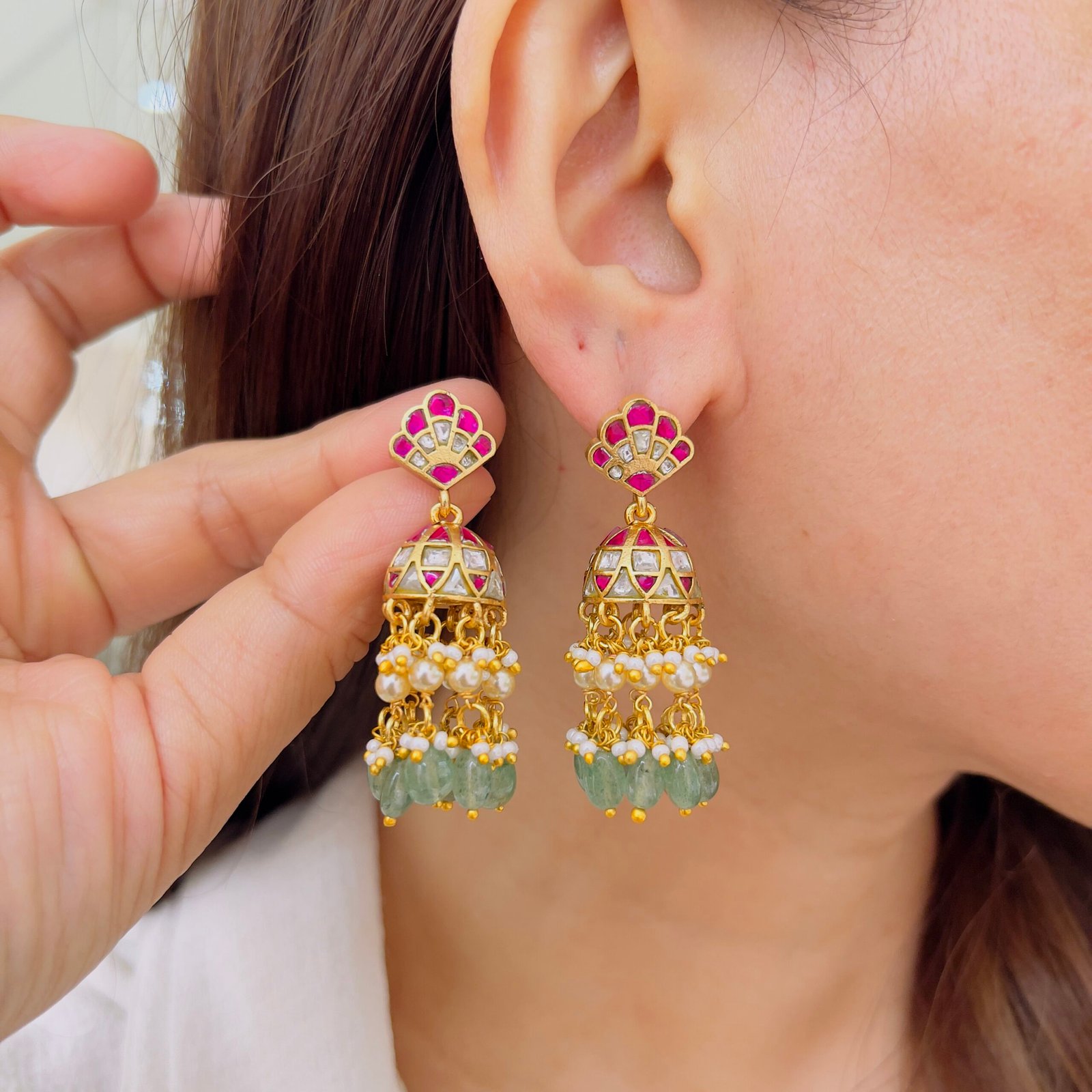 Inspired by classic Indian motifs, these Jadau earrings feature vibrant stones and detailed craftsmanship with hanging jhumkas, Perfect for weddings, festive occasions, and grand traditional styling.