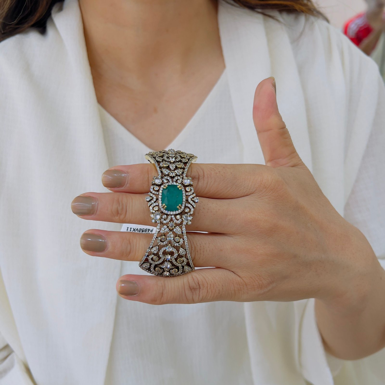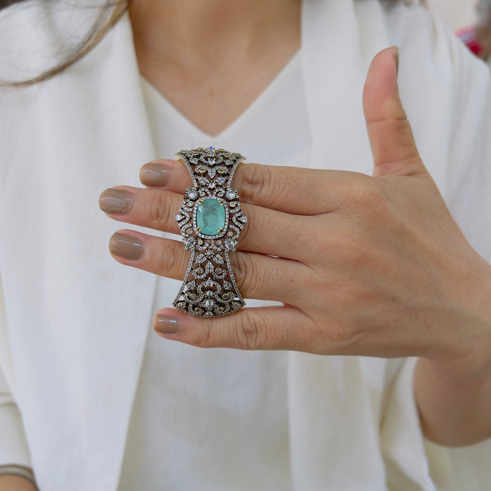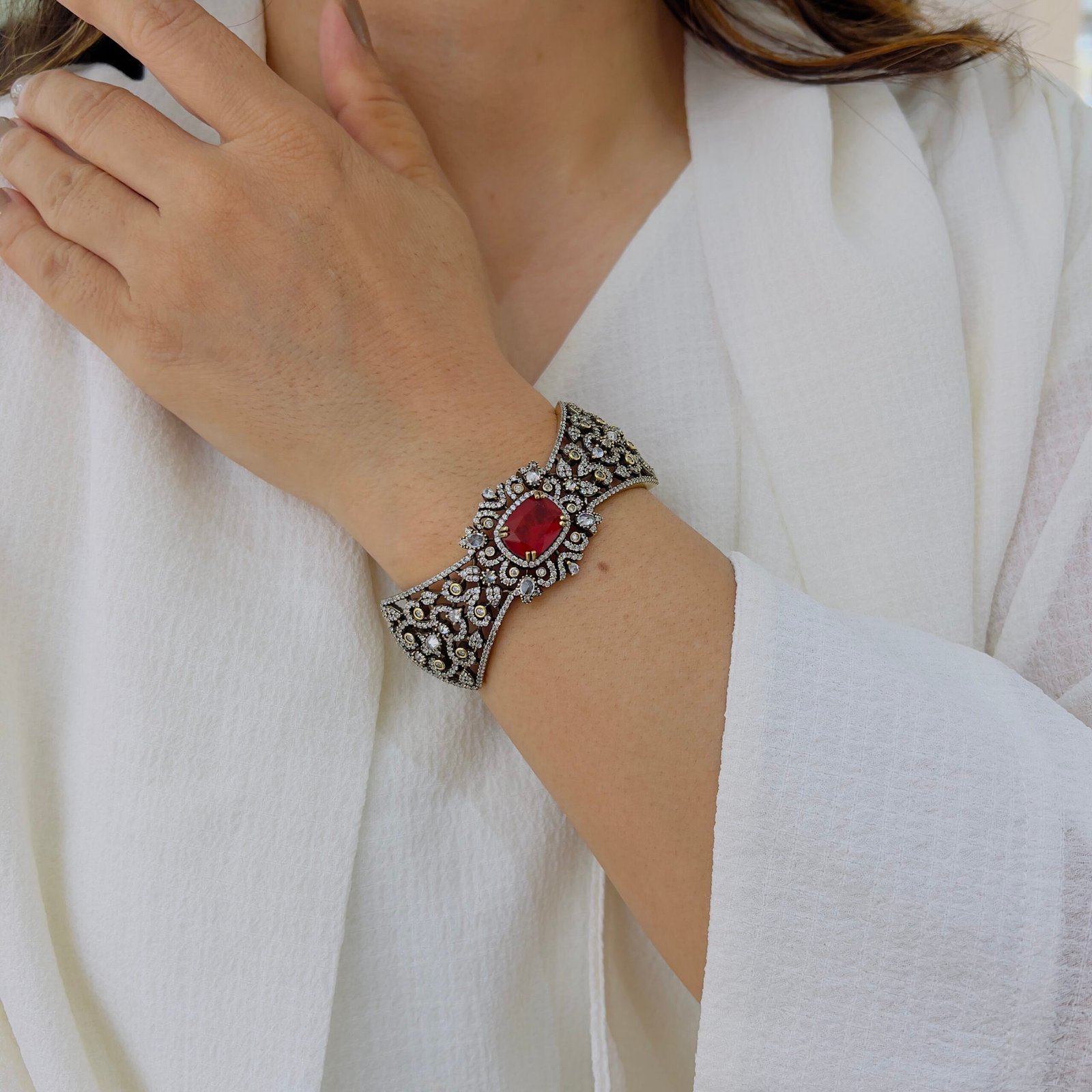 This 18k Gold-Plated Victorian Kada Bracelet features shiny color stones, is Anti-Tarnish, and made for roughly wear, Perfect for daily and office wear with royal elegance.