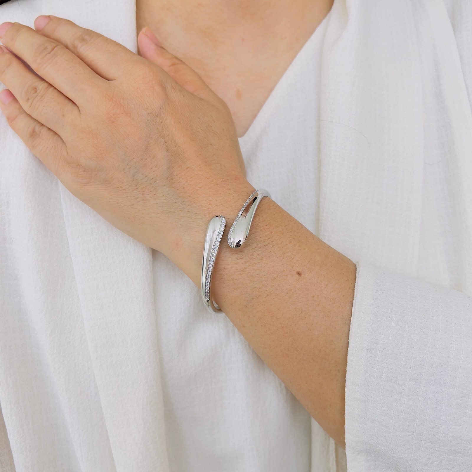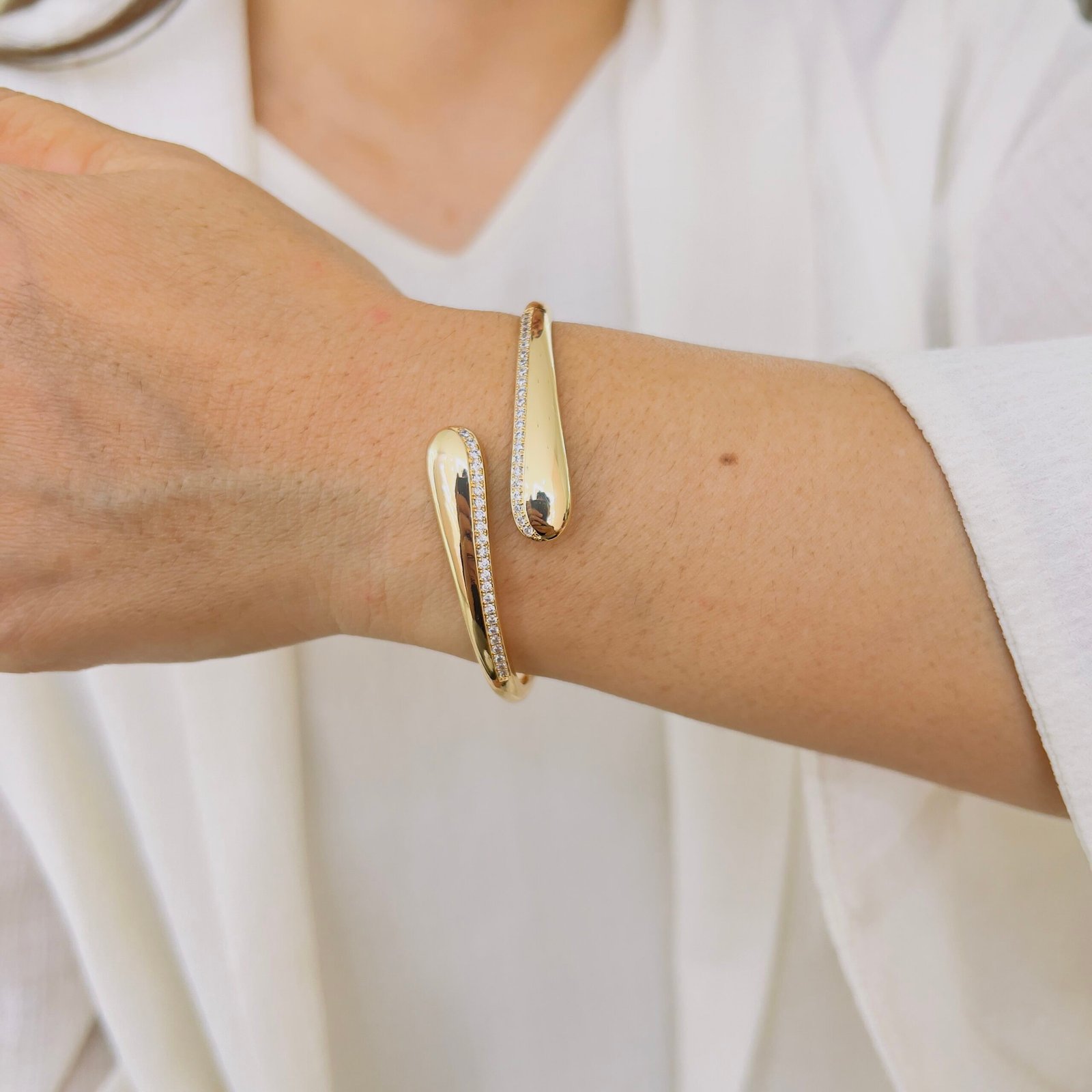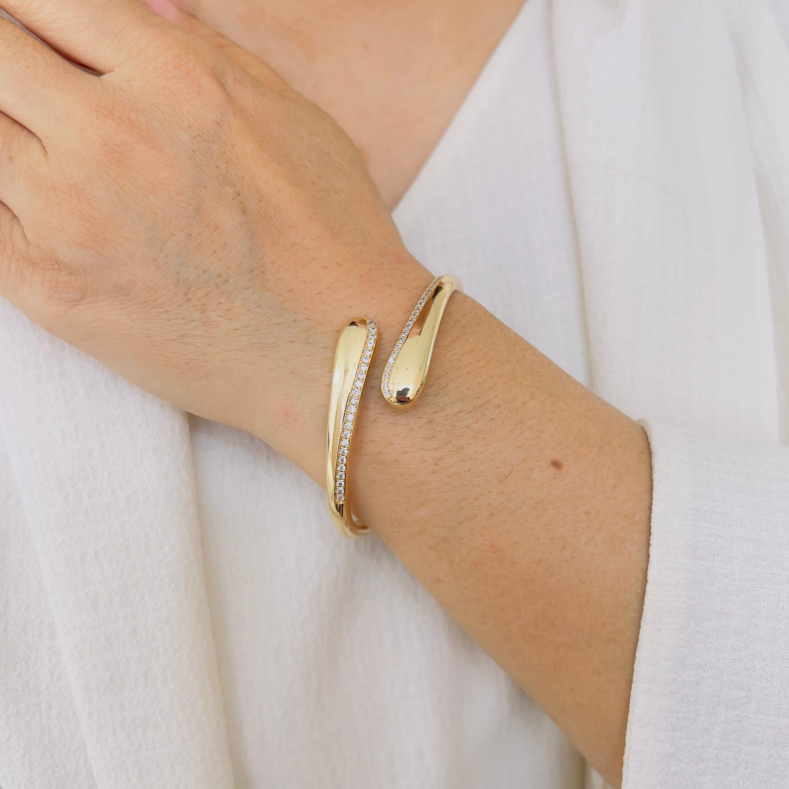 A sleek wave-inspired open-cuff bracelet designed for daily office wear, featuring a smooth anti-tarnish finish and durable quality that comfortably handles rough usage while adding a refined, modern shine.