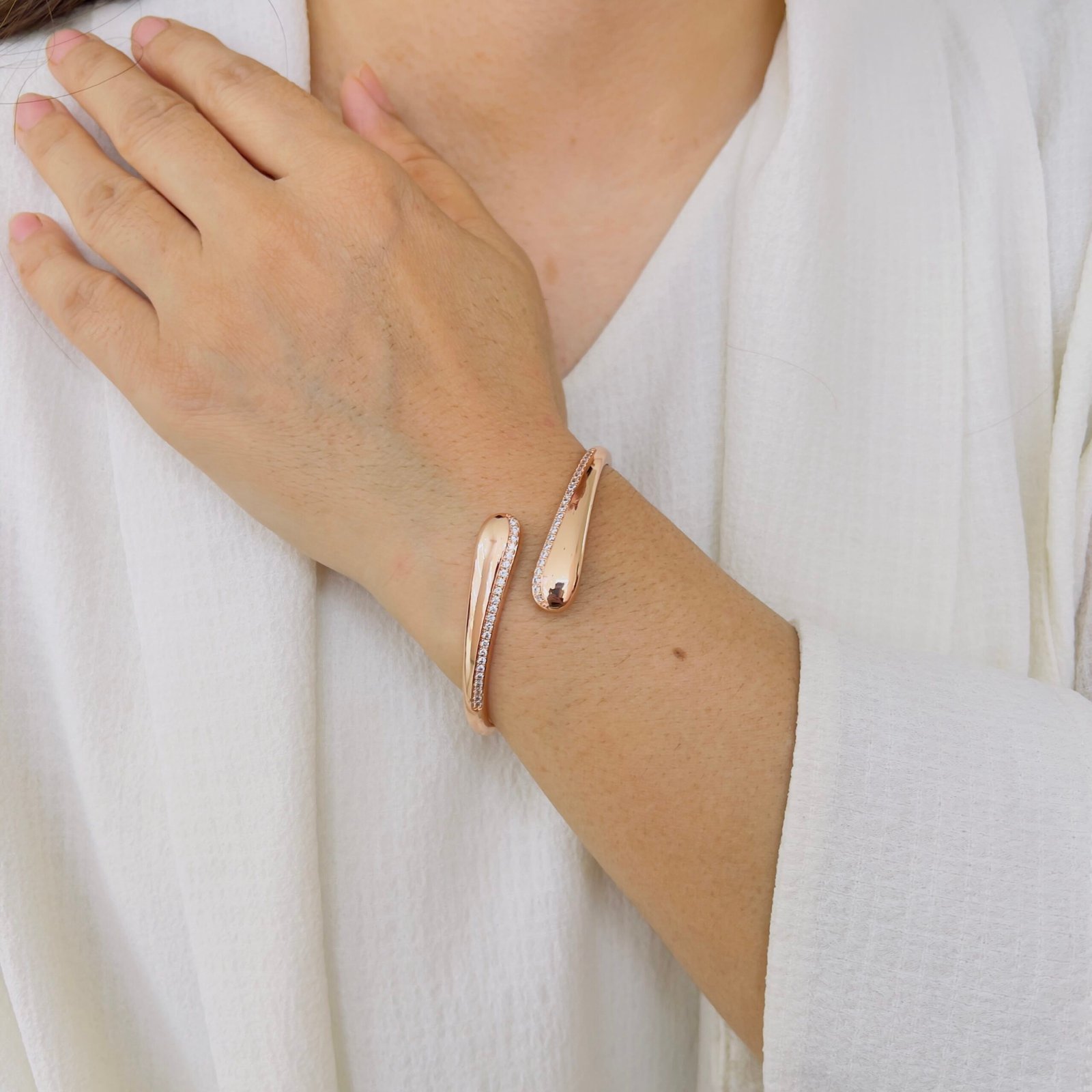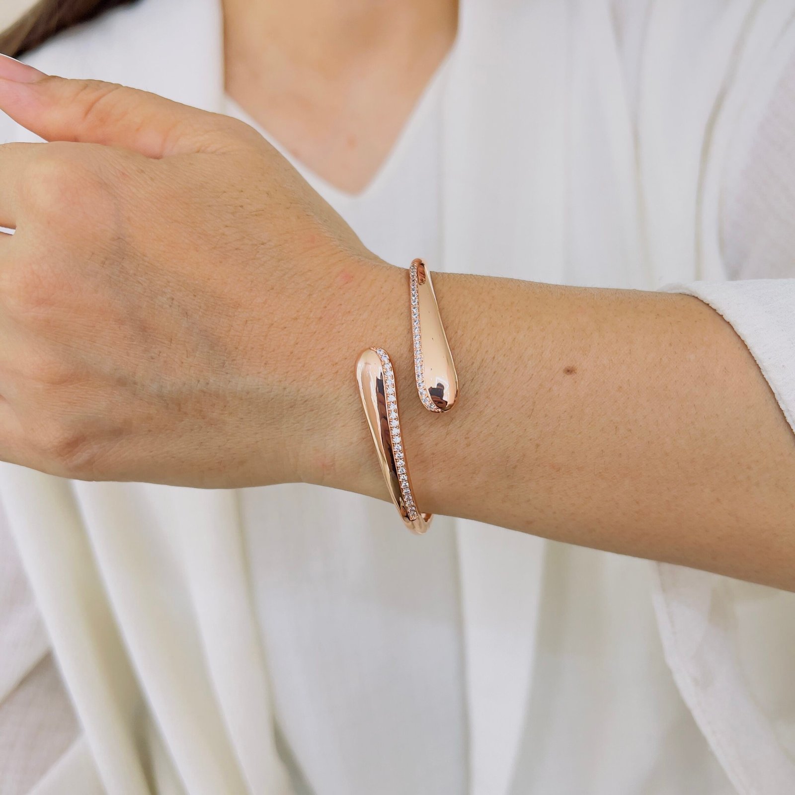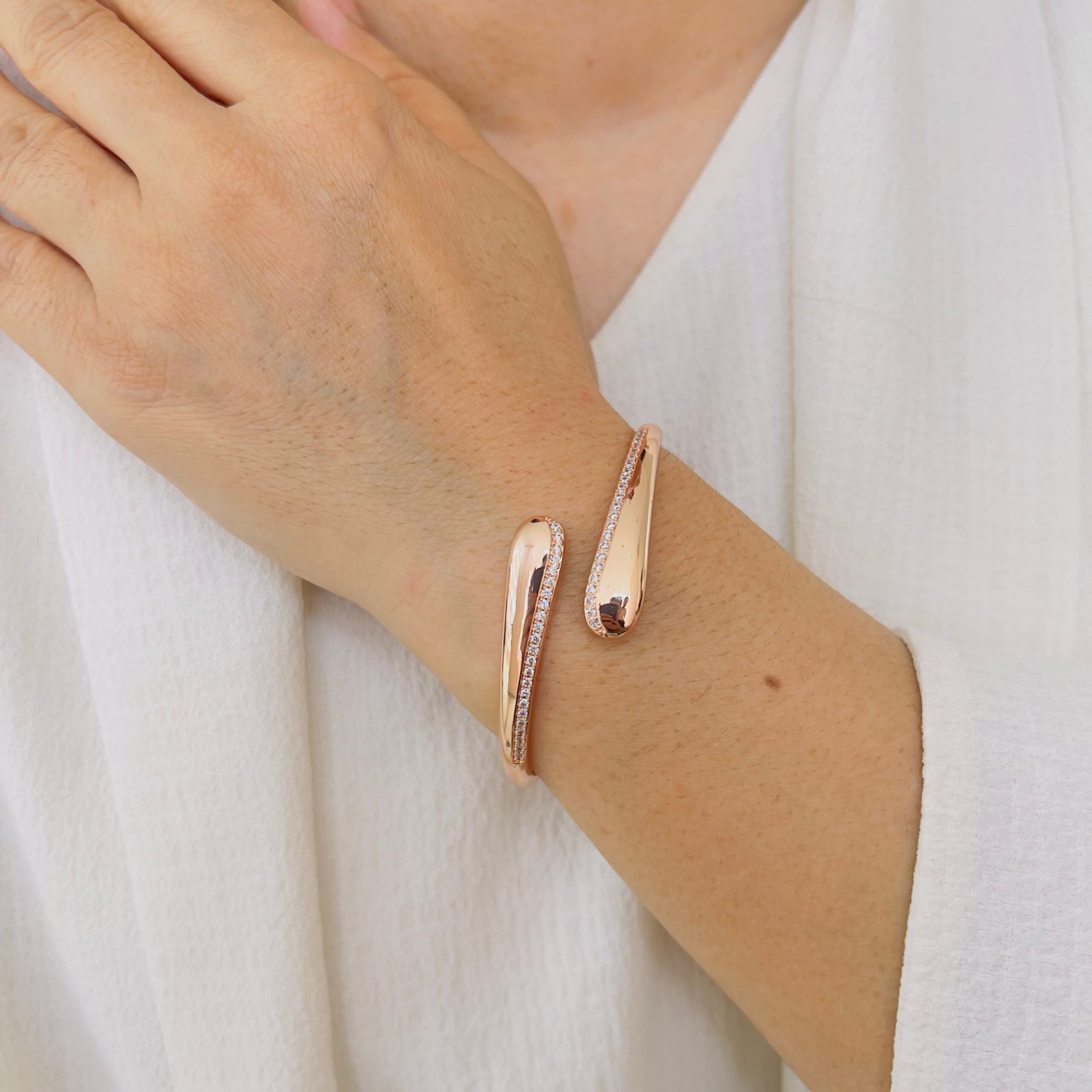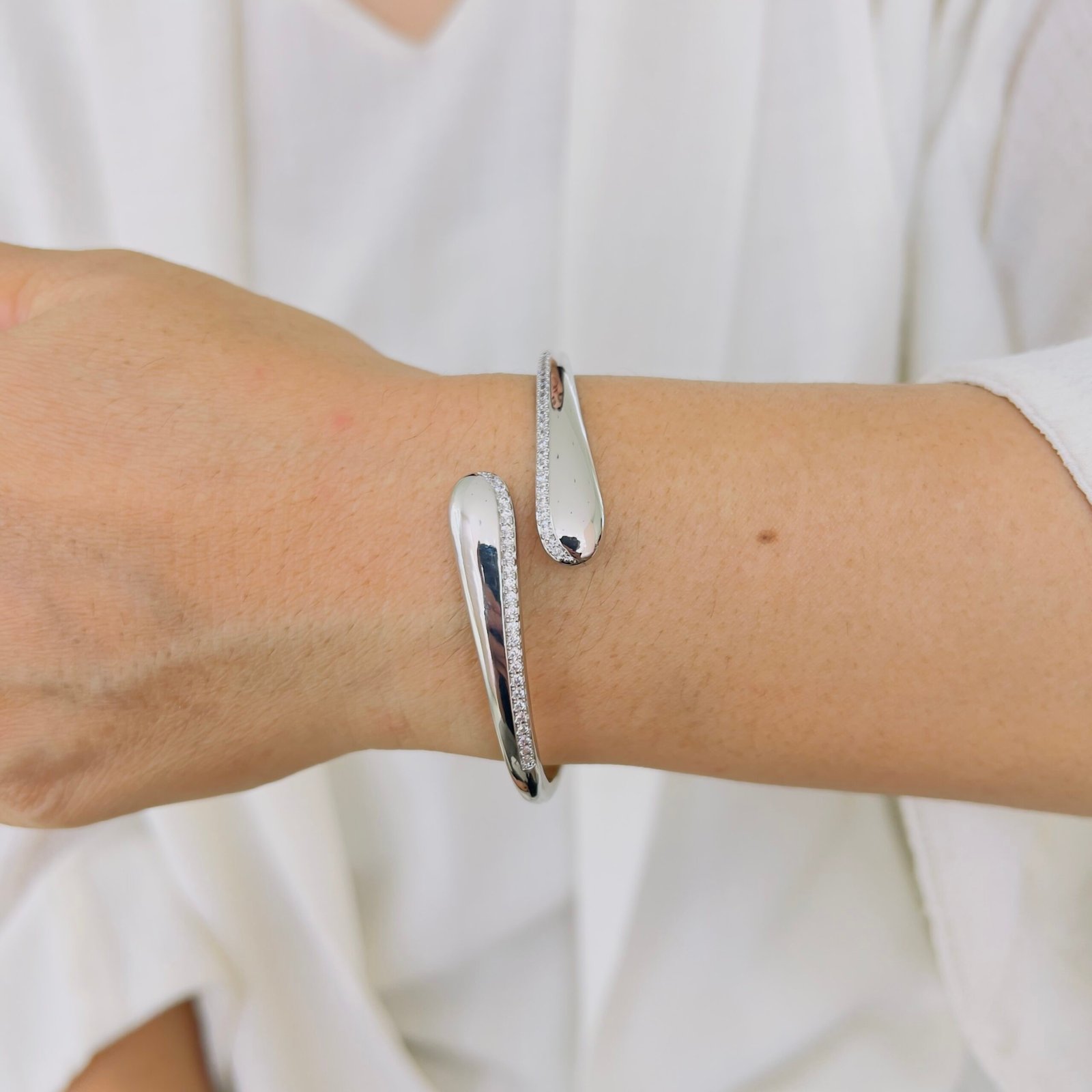 A sleek wave-inspired open-cuff bracelet designed for daily office wear, featuring a smooth anti-tarnish finish and durable quality that comfortably handles rough usage while adding a refined, modern shine.