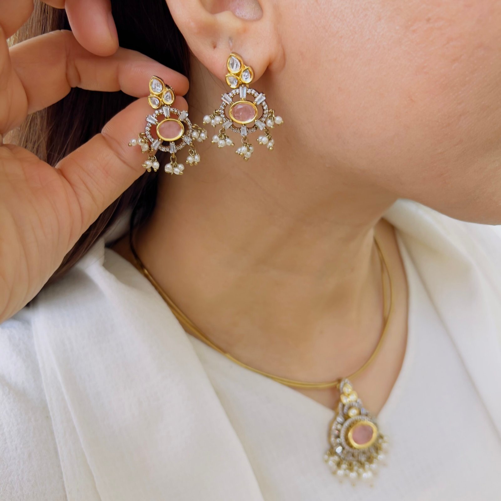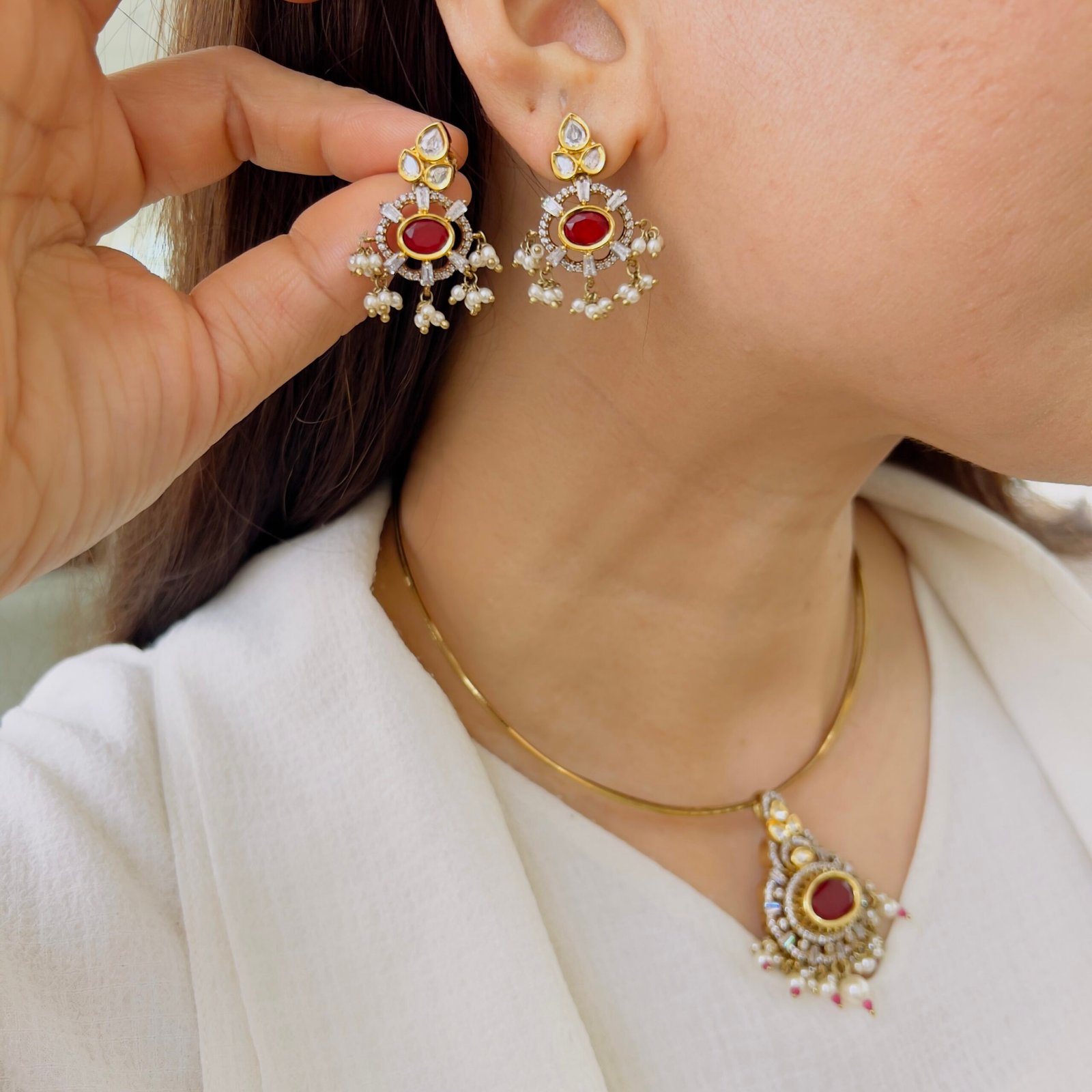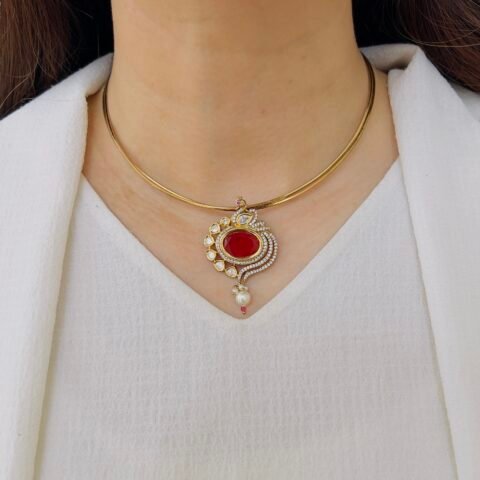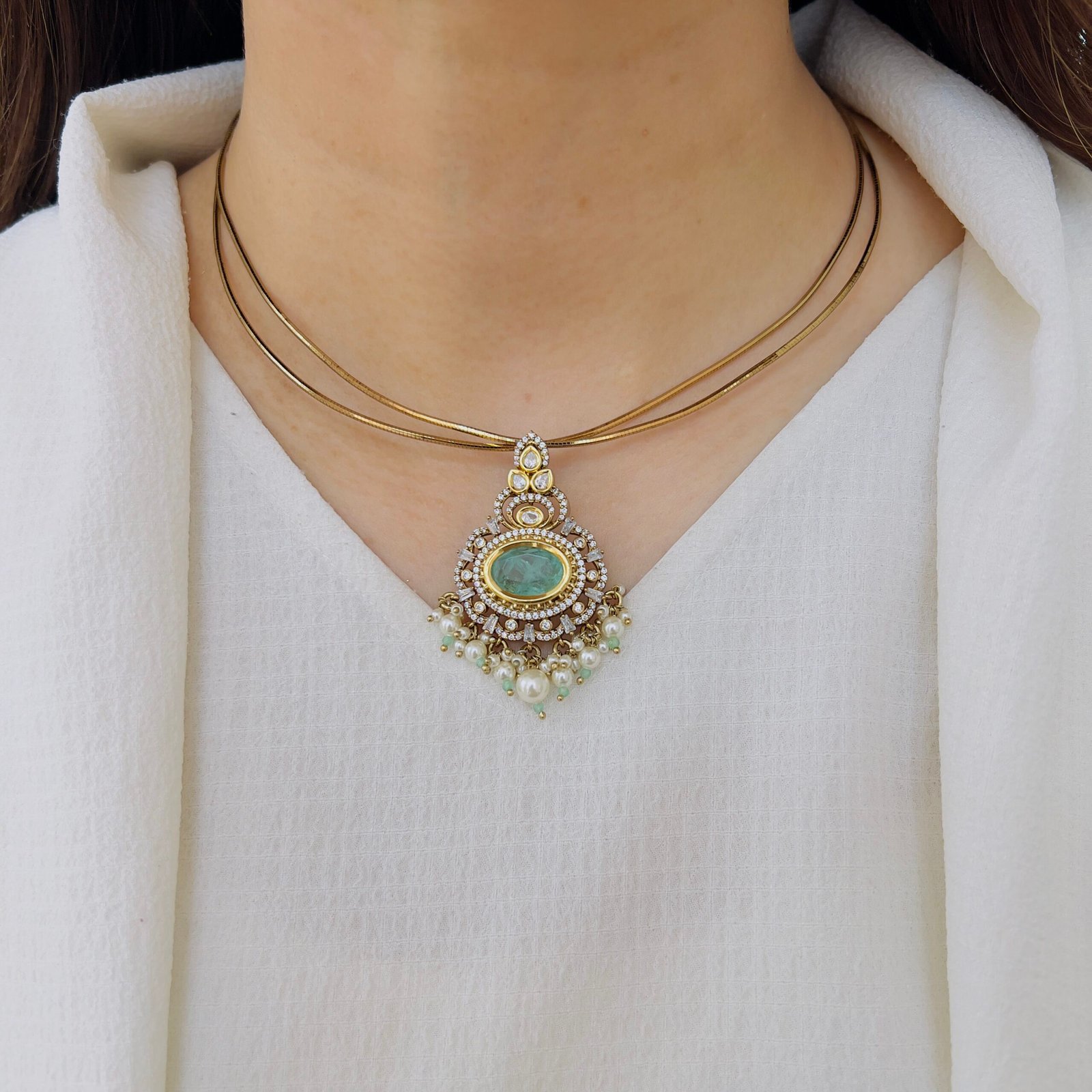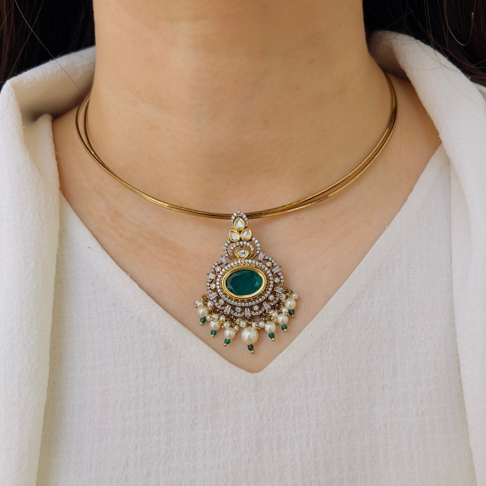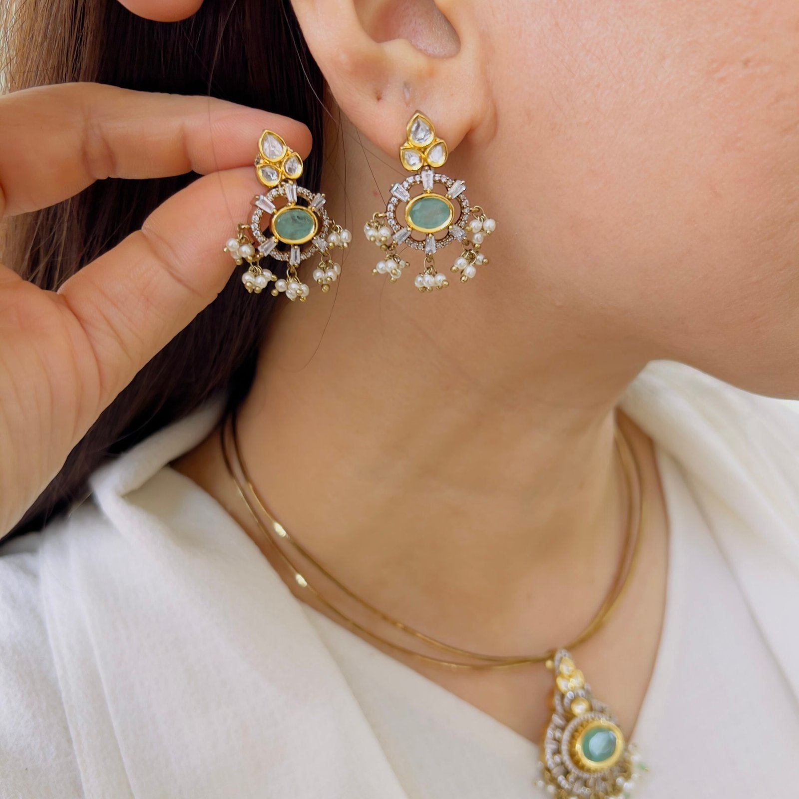 Featuring a rich green center stone surrounded by sparkling accents, this pendant set exudes timeless elegance. Paired with matching earrings and delicate pearl drops, it’s perfect for adding a graceful charm to both festive and occasion wear.