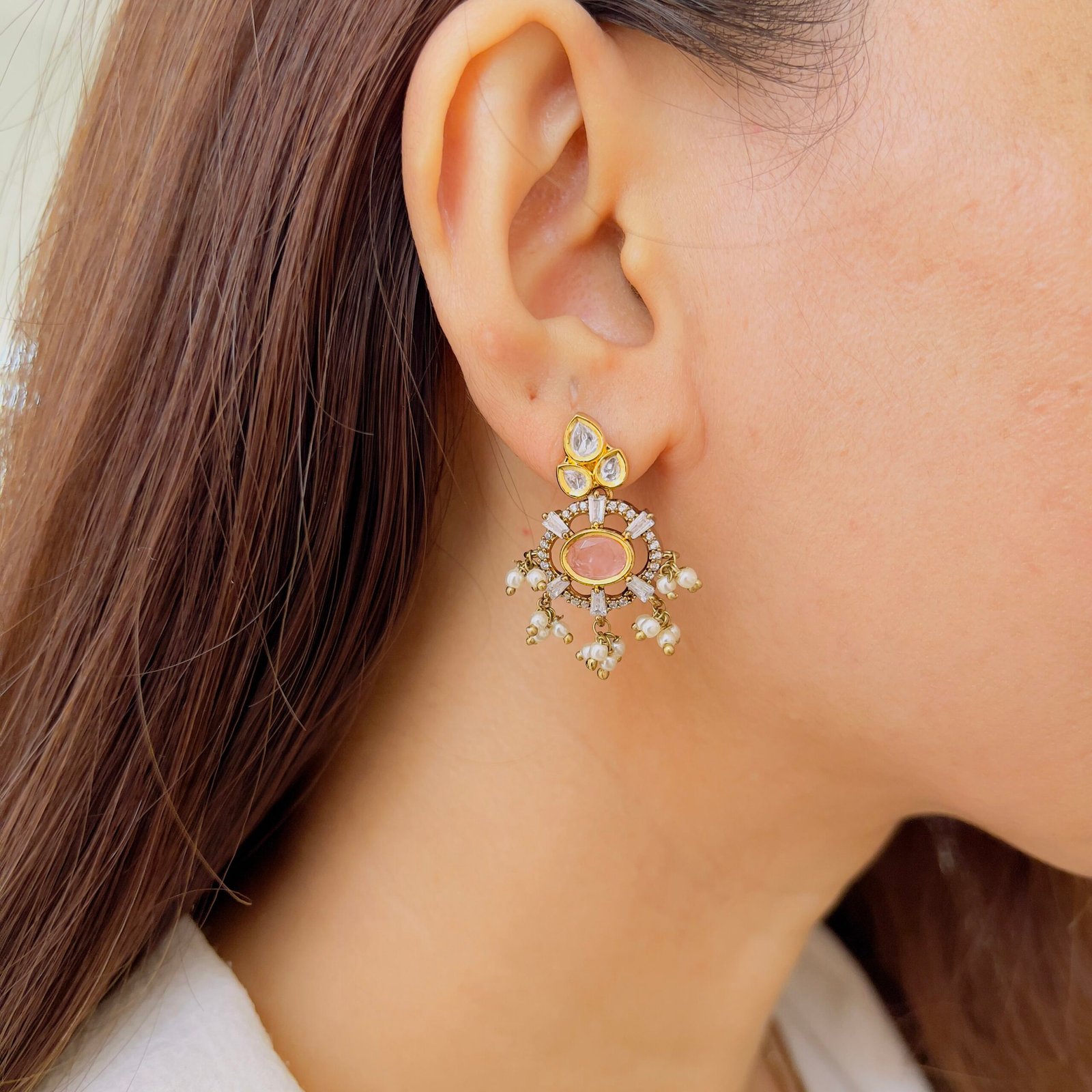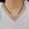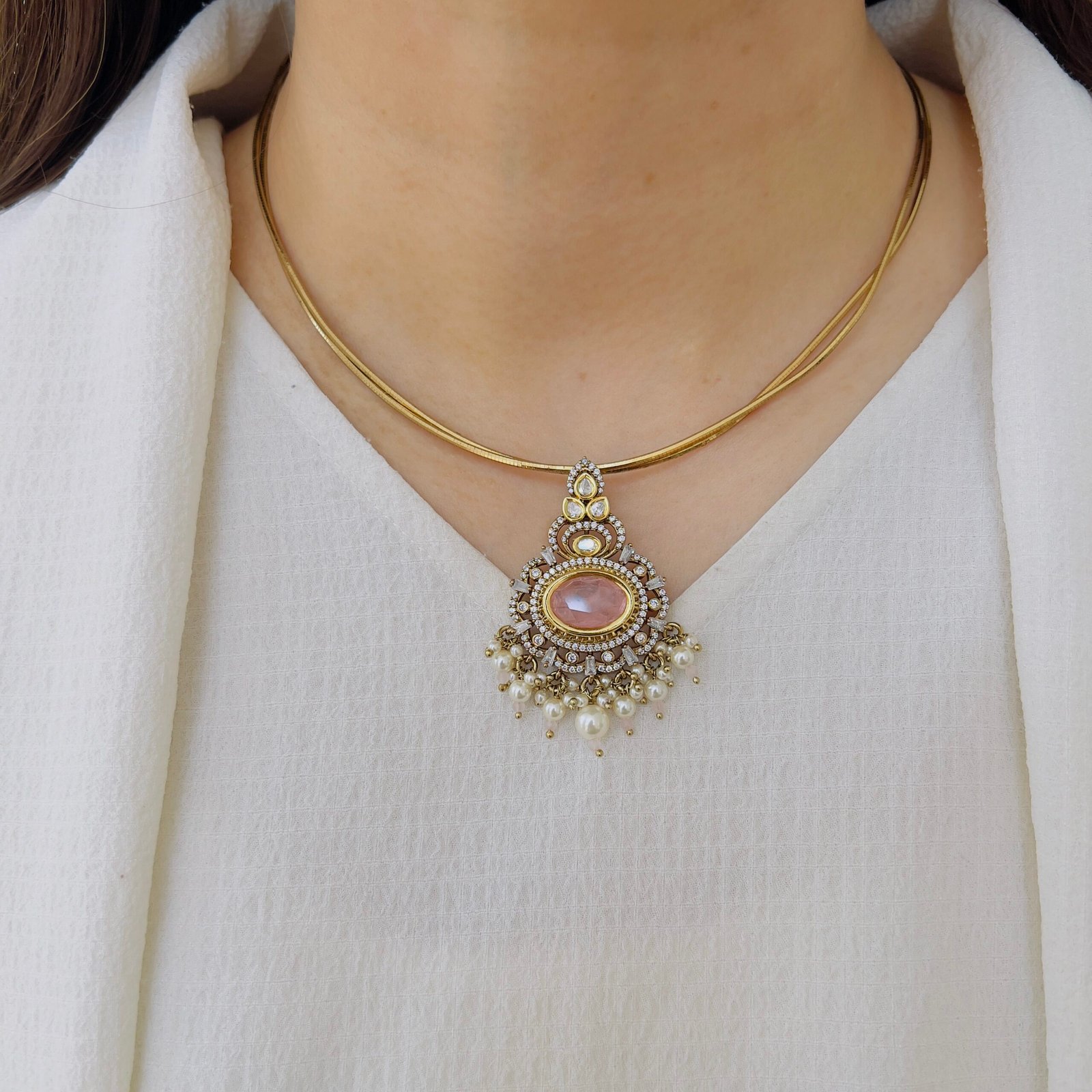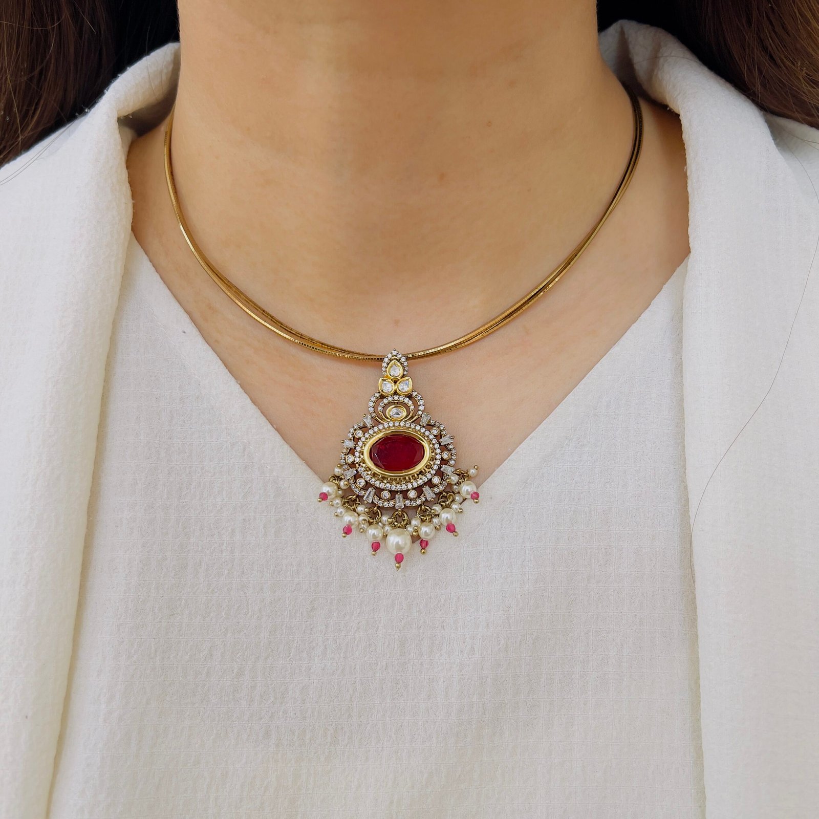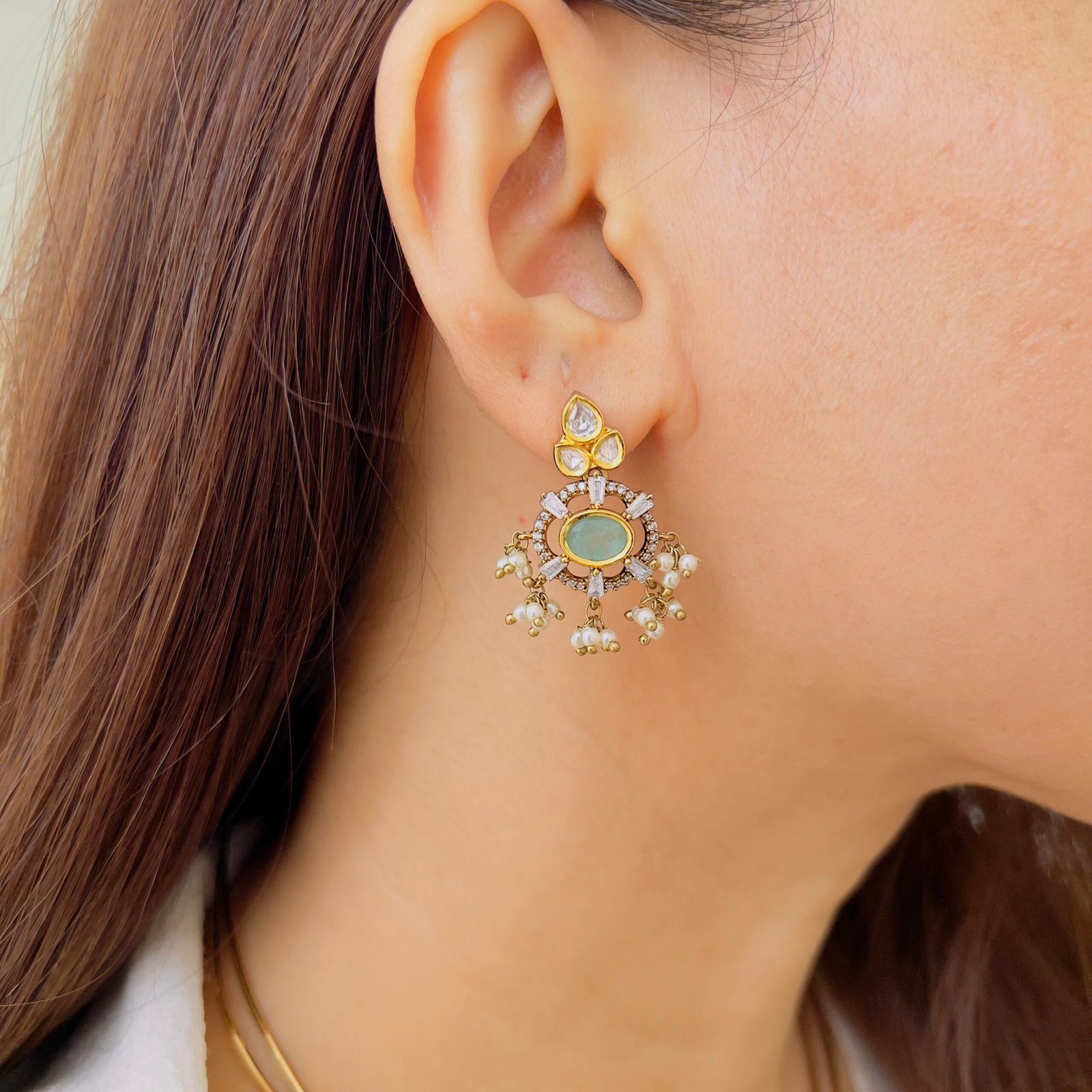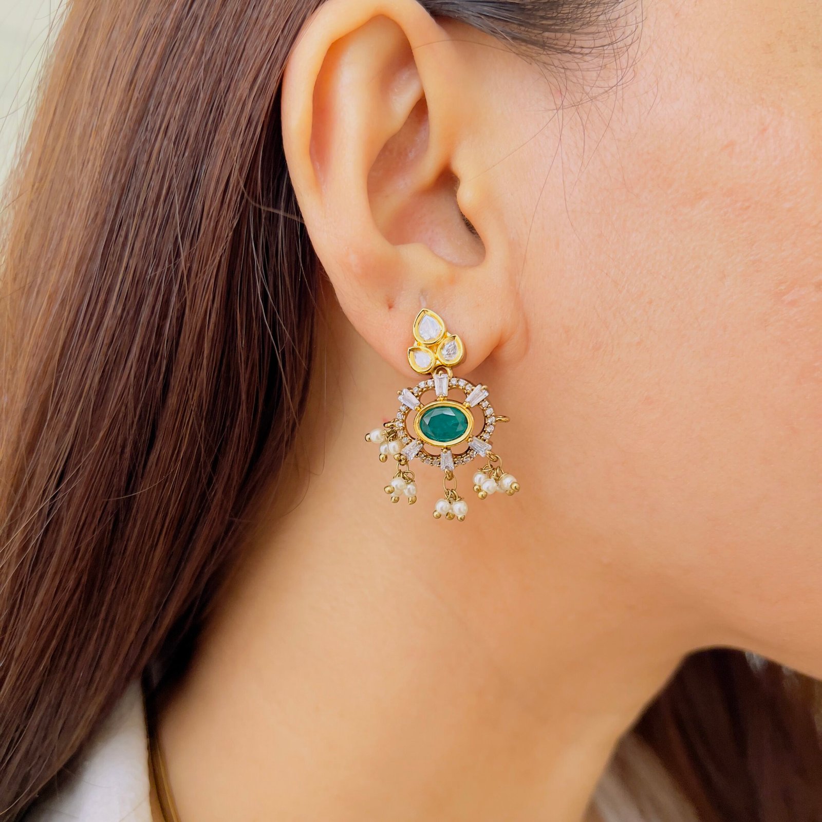 Featuring a rich green center stone surrounded by sparkling accents, this pendant set exudes timeless elegance. Paired with matching earrings and delicate pearl drops, it’s perfect for adding a graceful charm to both festive and occasion wear.