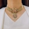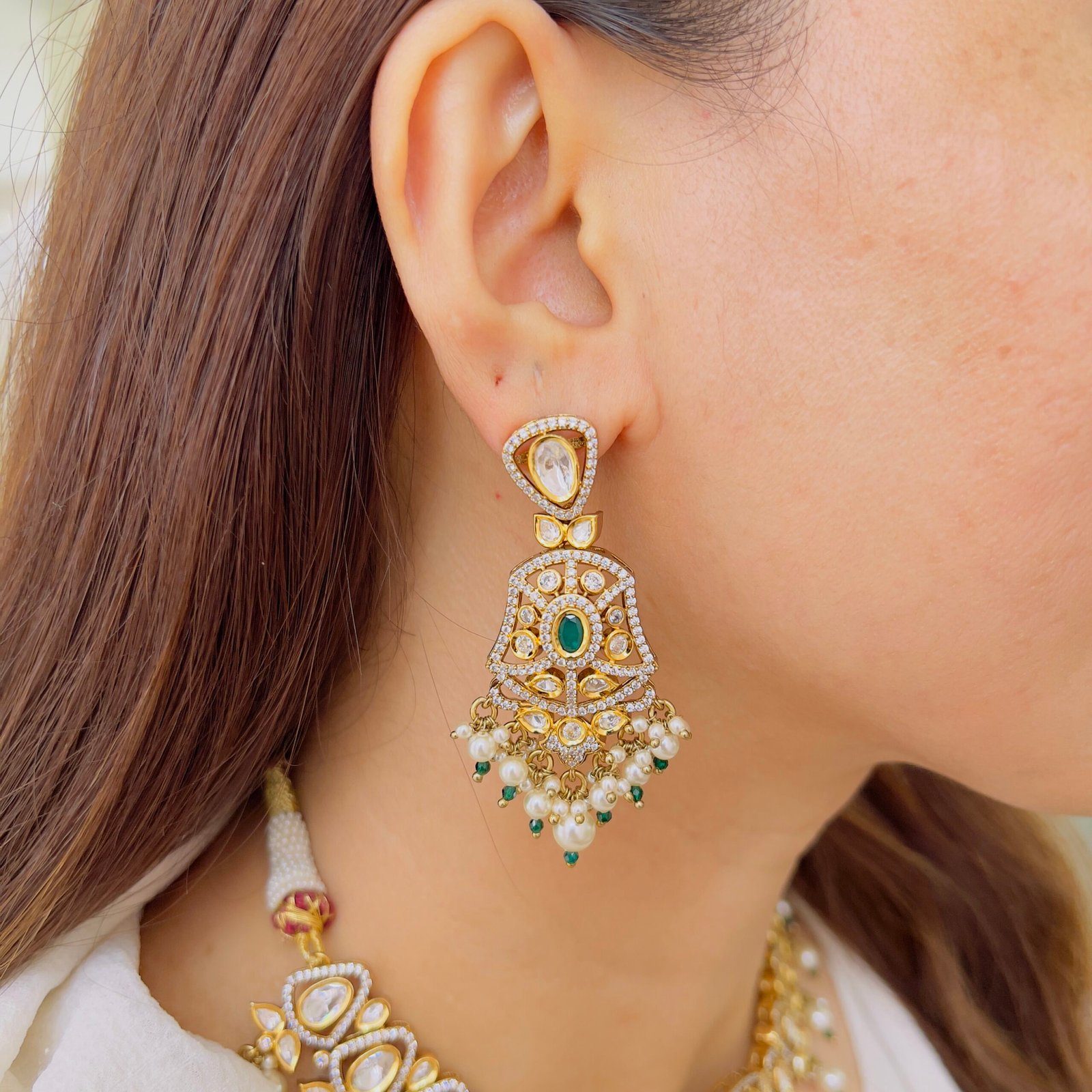 A triumph of structural beauty. This set is defined by its architectural pendant, featuring a robust gold-toned frame that mimics the intricate carvings of temple jewelry. At its heart lies a deep emerald-green stone, flanked by vibrant ruby-pink floral accents and hand-set Polki stones. The pendant’s weight is perfectly balanced by five strands of faceted forest-green beads, creating a silhouette that is both grounded and grand. This piece is a tribute to the symmetry and strength found in classic Indian design.