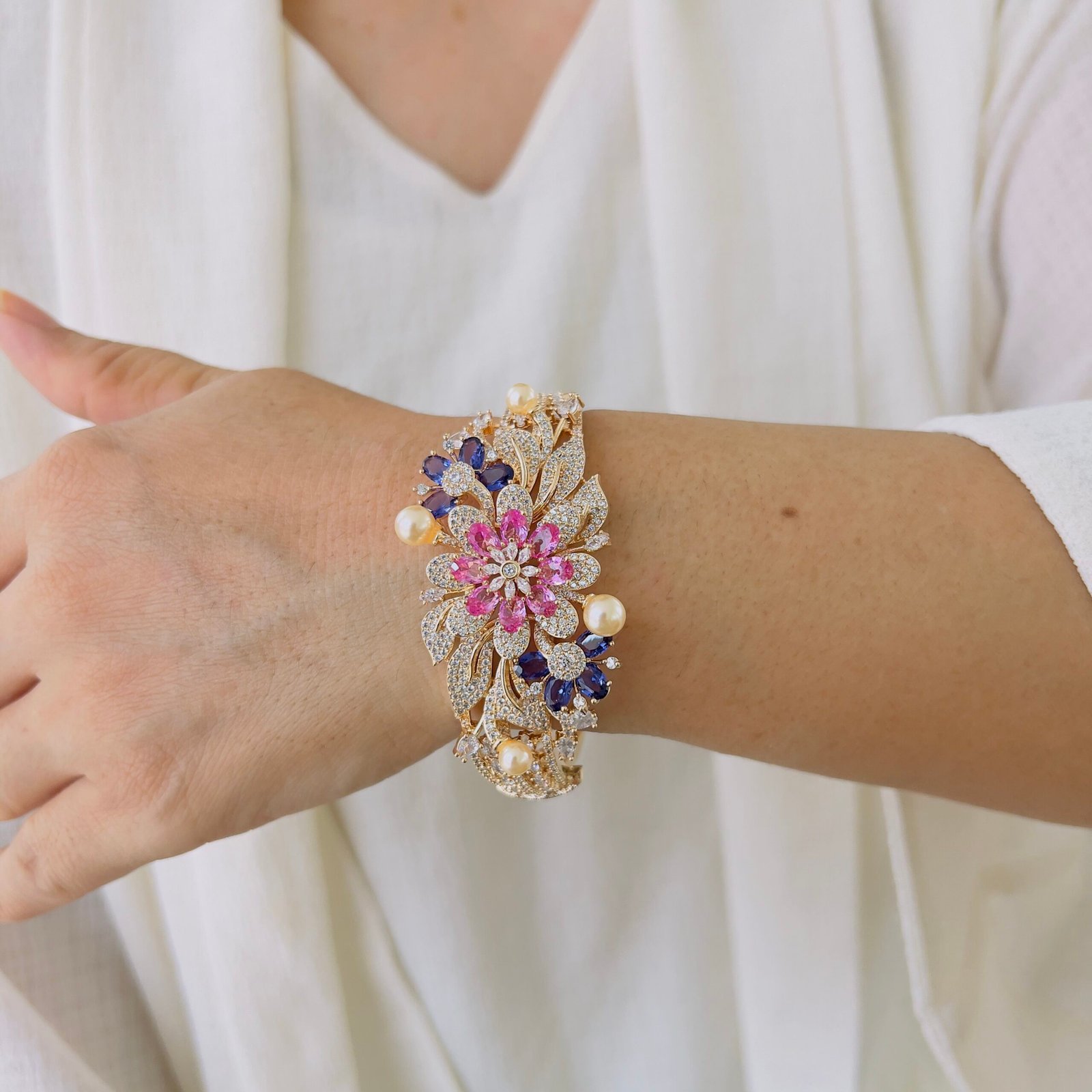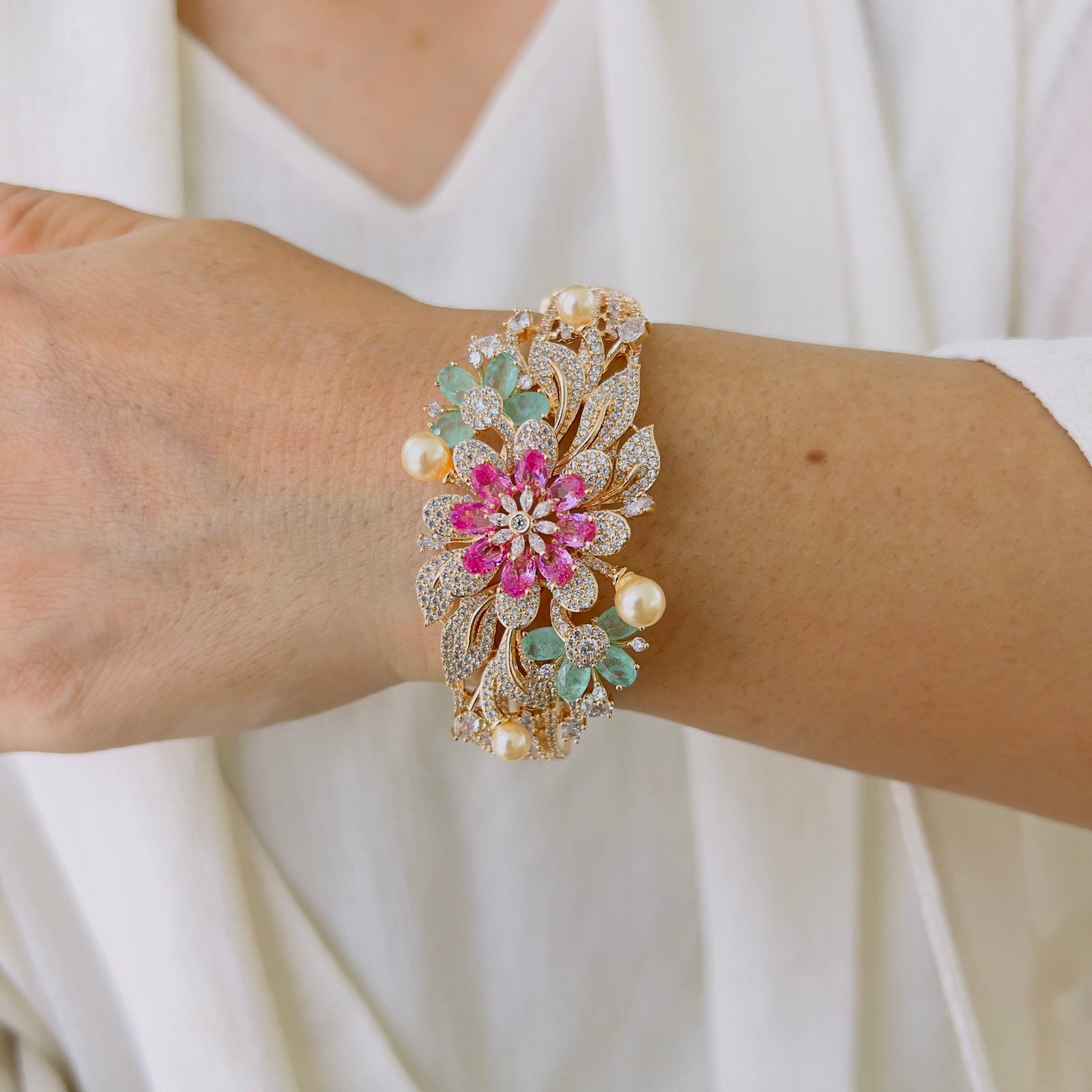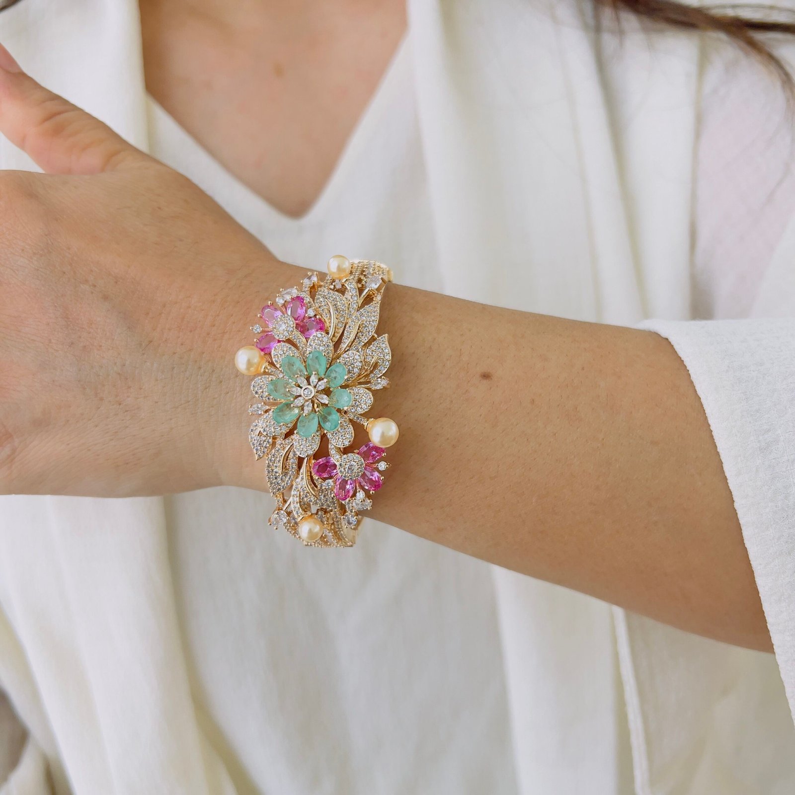 This stunning statement bracelet features a beautifully crafted floral design highlighted with fine detailing and a graceful finish, Designed to stand out, it adds a touch of luxury to festive occasions and special events, Comfortable to wear and thoughtfully made, it reflects timeless elegance.