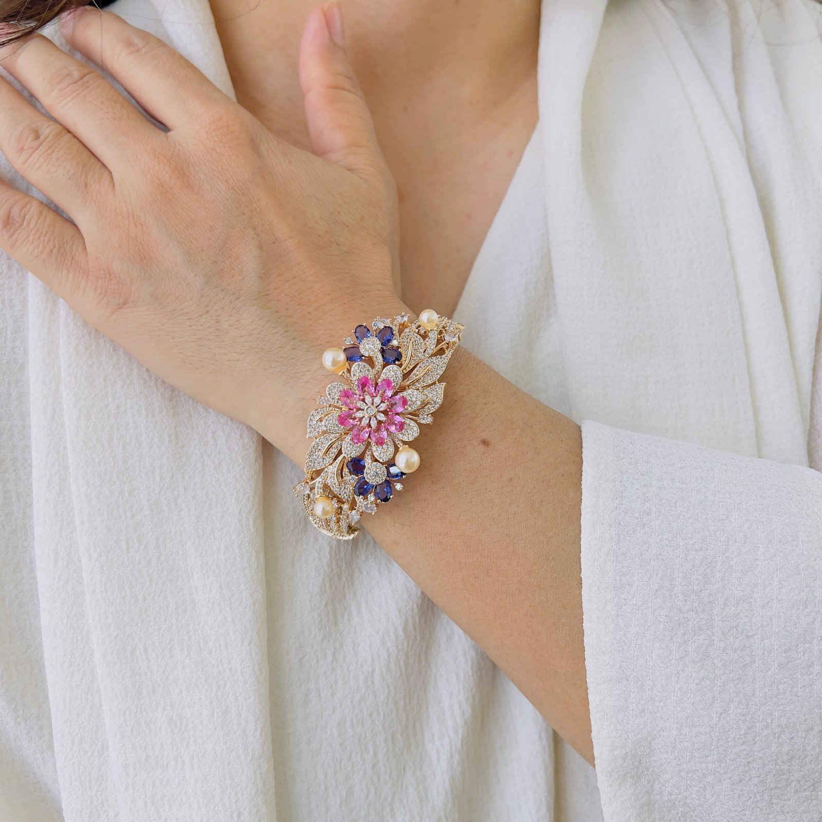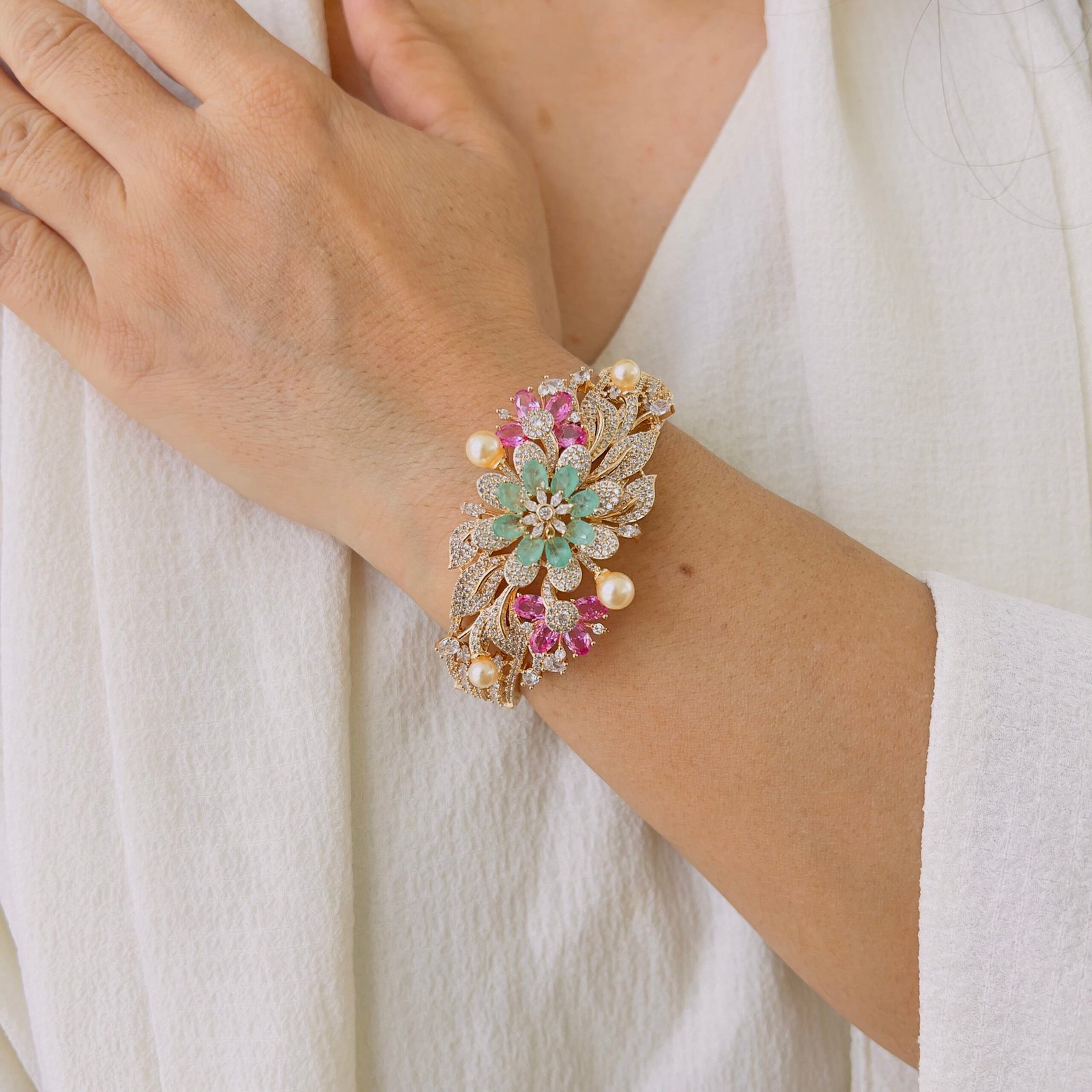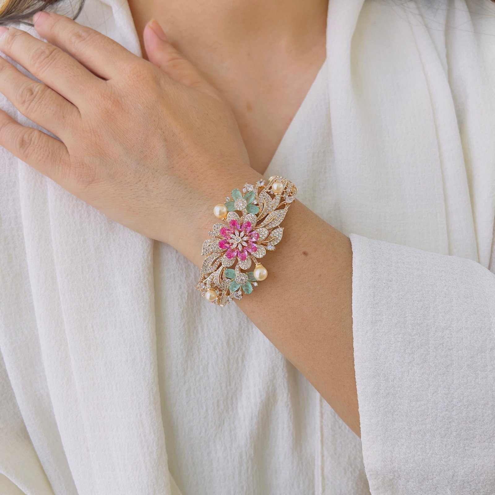 This stunning statement bracelet features a beautifully crafted floral design highlighted with fine detailing and a graceful finish, Designed to stand out, it adds a touch of luxury to festive occasions and special events, Comfortable to wear and thoughtfully made, it reflects timeless elegance.