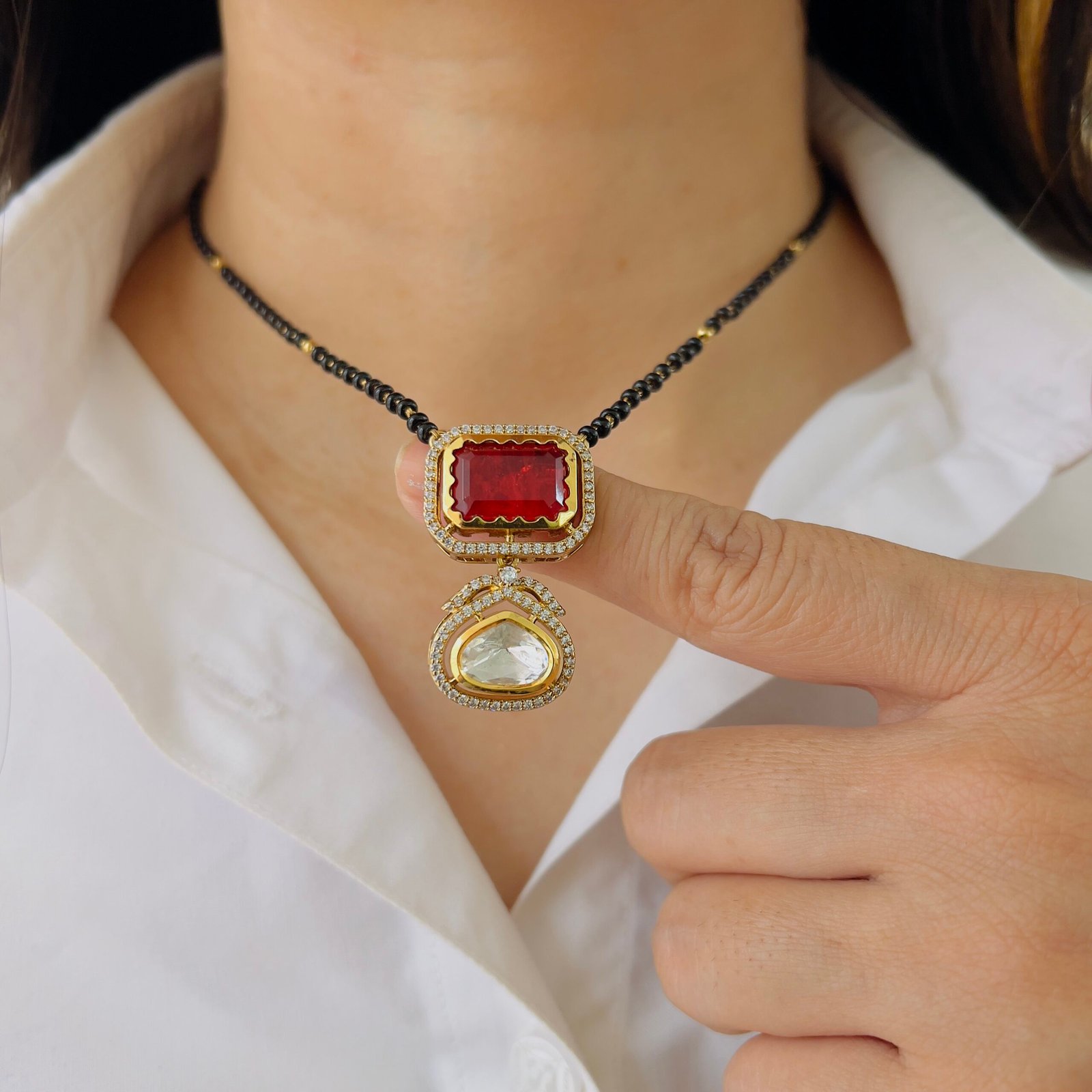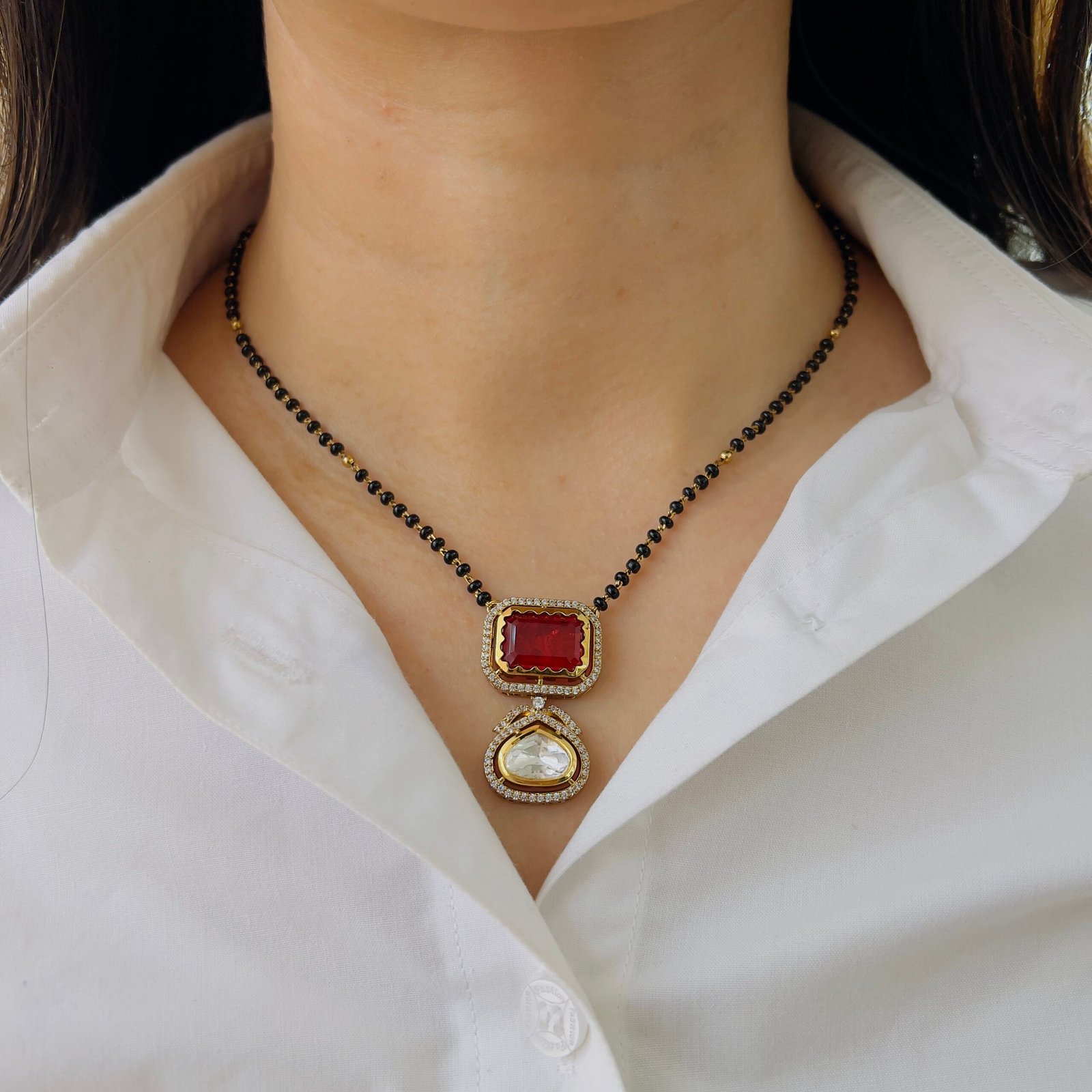 Crafted with 18K gold plating, this mangalsutra shines with brilliant stones, Anti-tarnish and perfect for rough use, it brings timeless grace and durability for everyday wear.