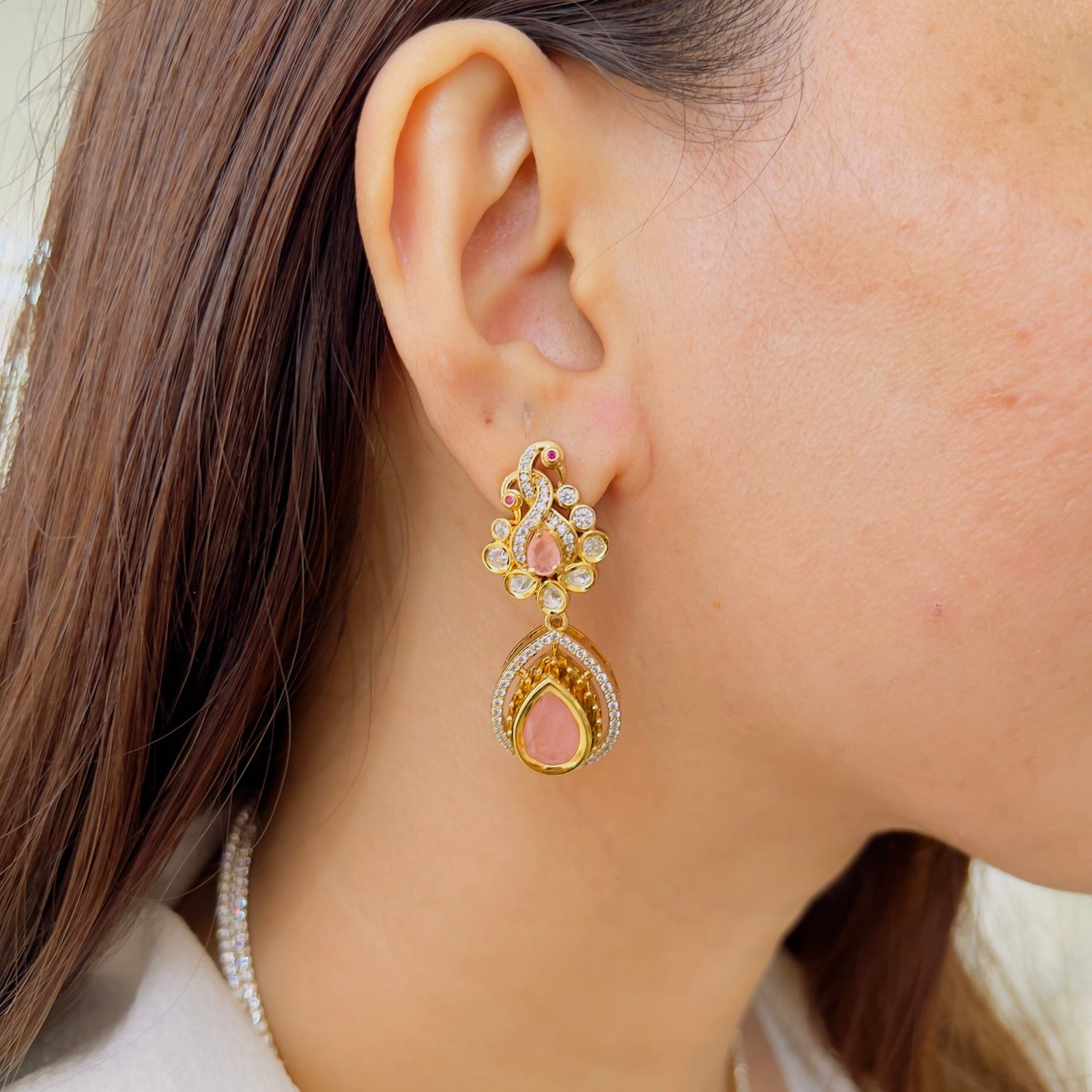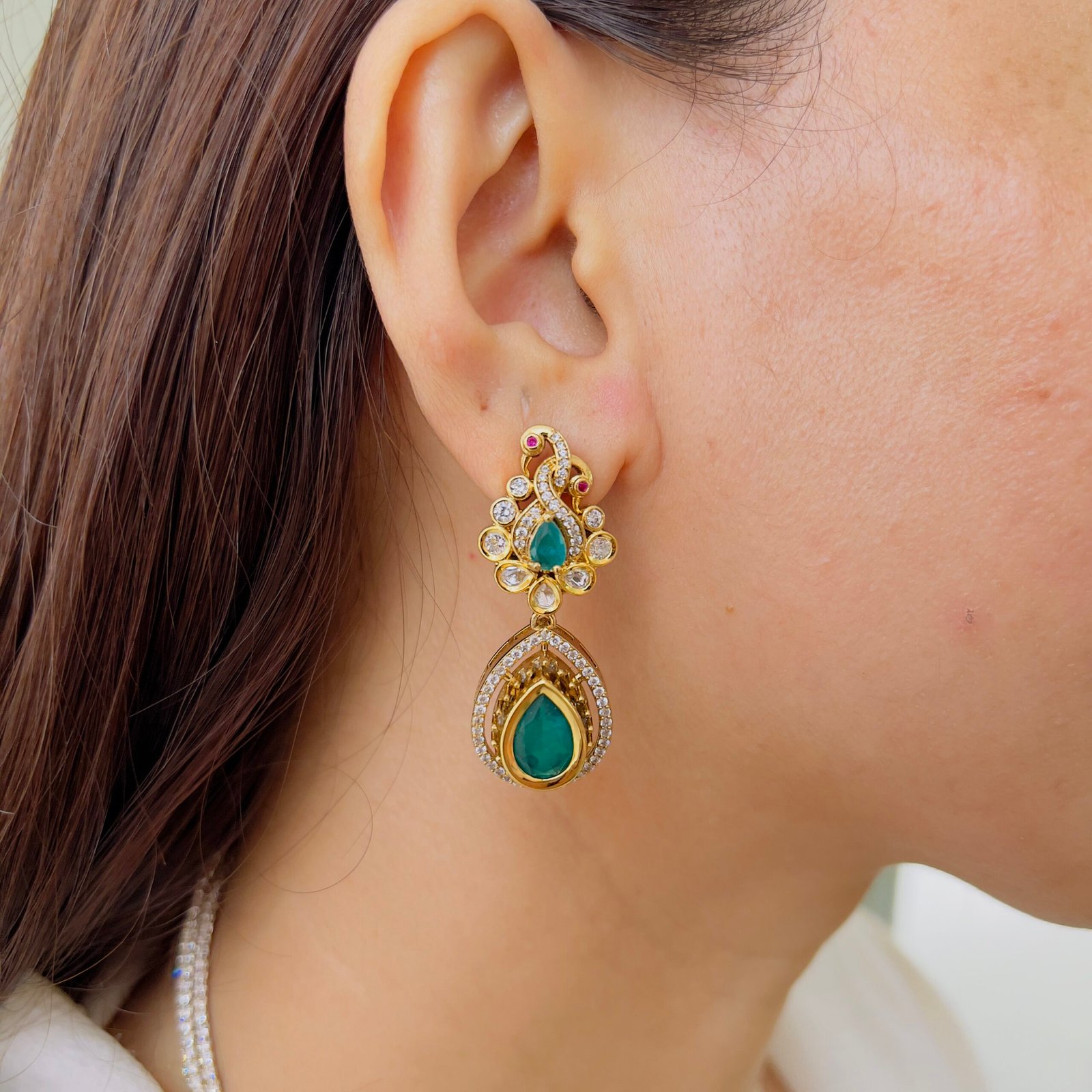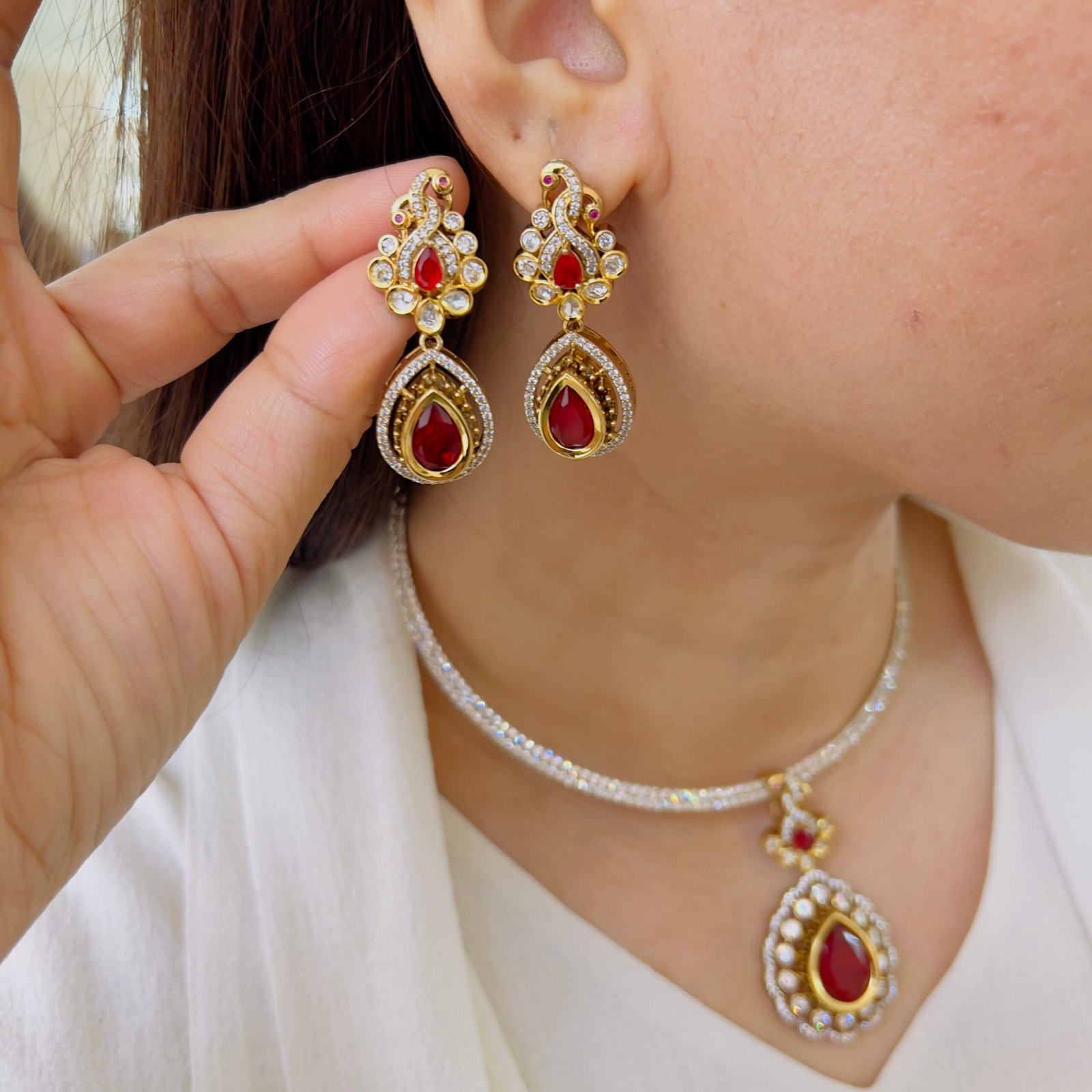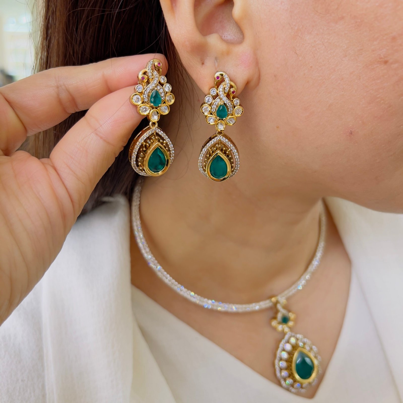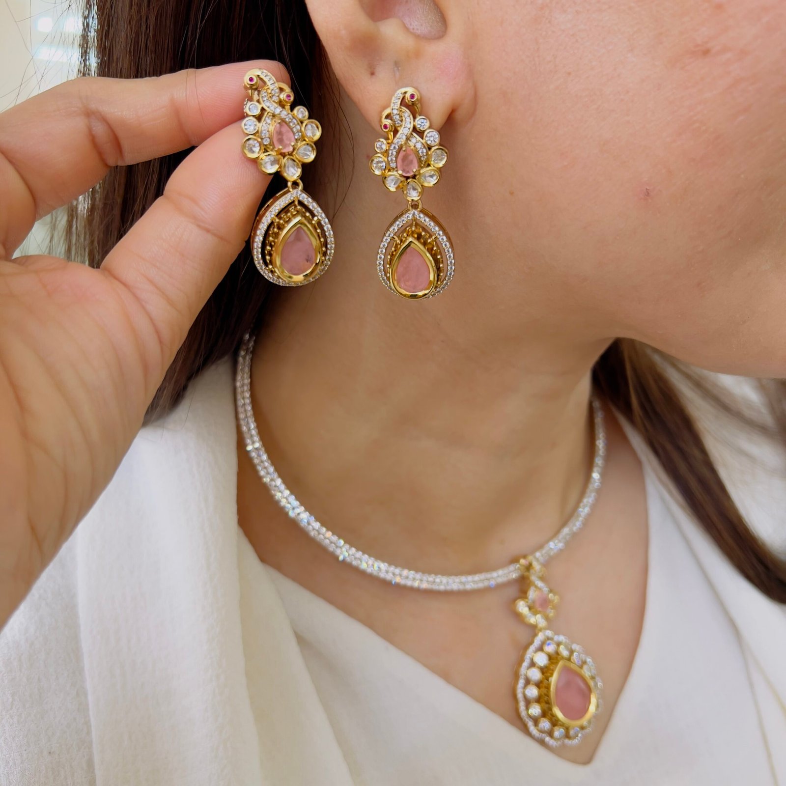 A perfect blend of classic design and modern elegance, this pendant set features intricate stone work and a refined drop style, The coordinated earrings enhance the overall look, making it a stylish and graceful addition to any jewelry collection.
