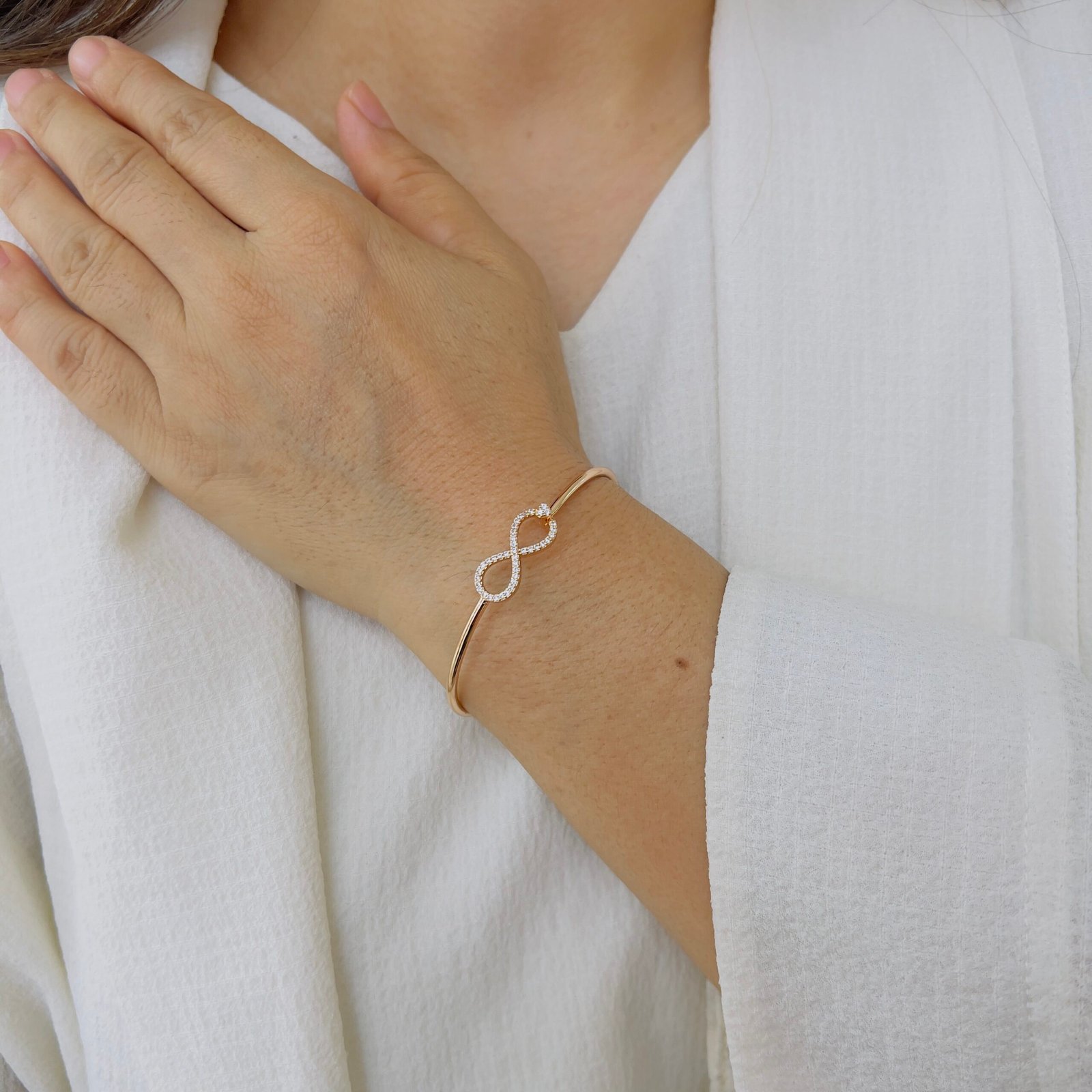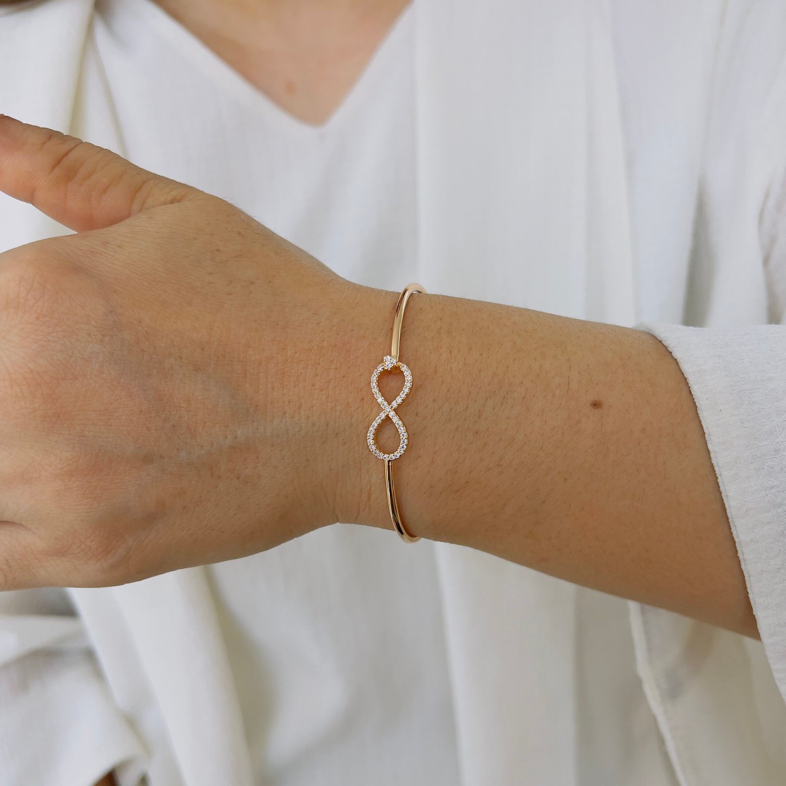 This bracelet combines a delicate infinity design with an openable structure, ensuring a perfect fit while adding a subtle and meaningful elegance to your look.