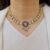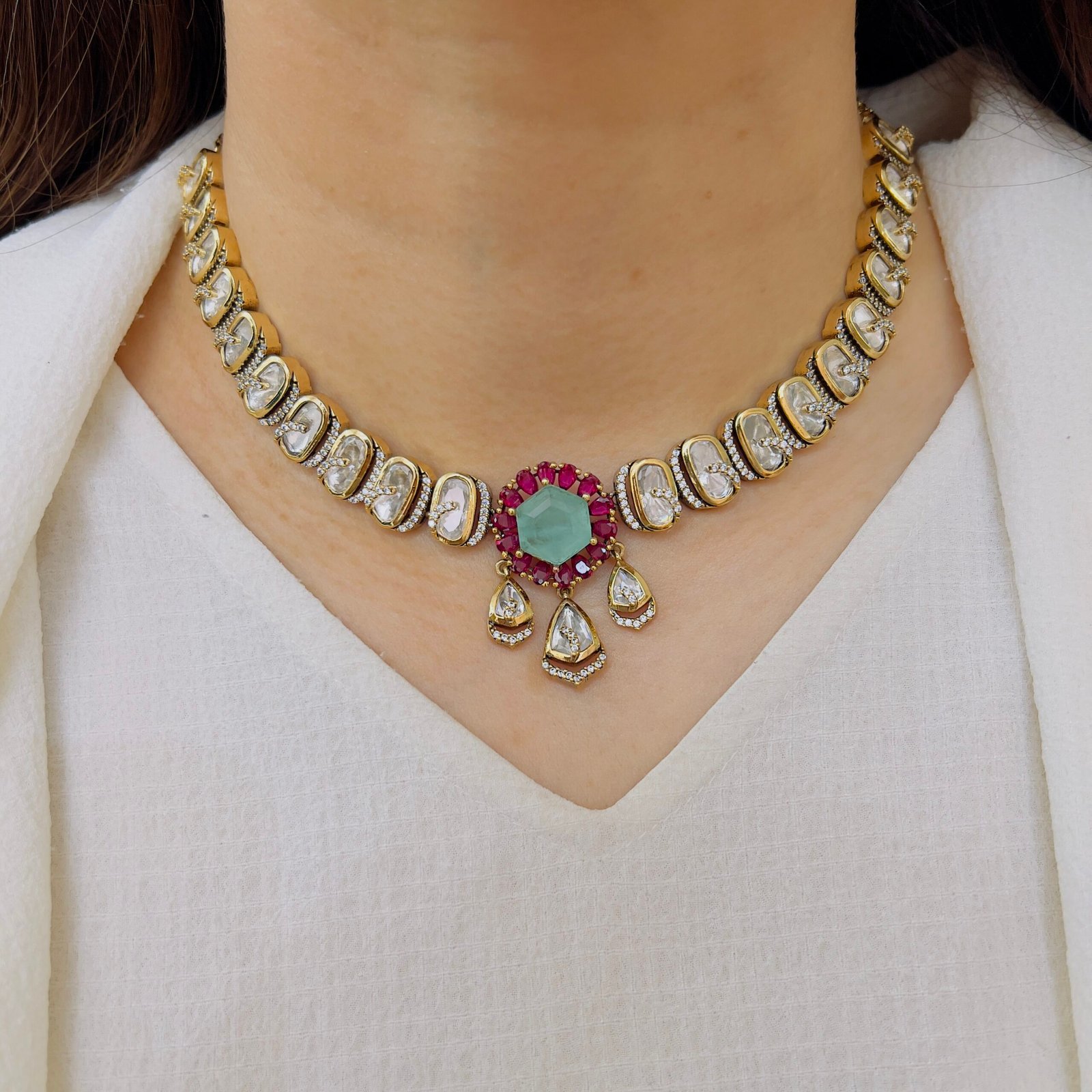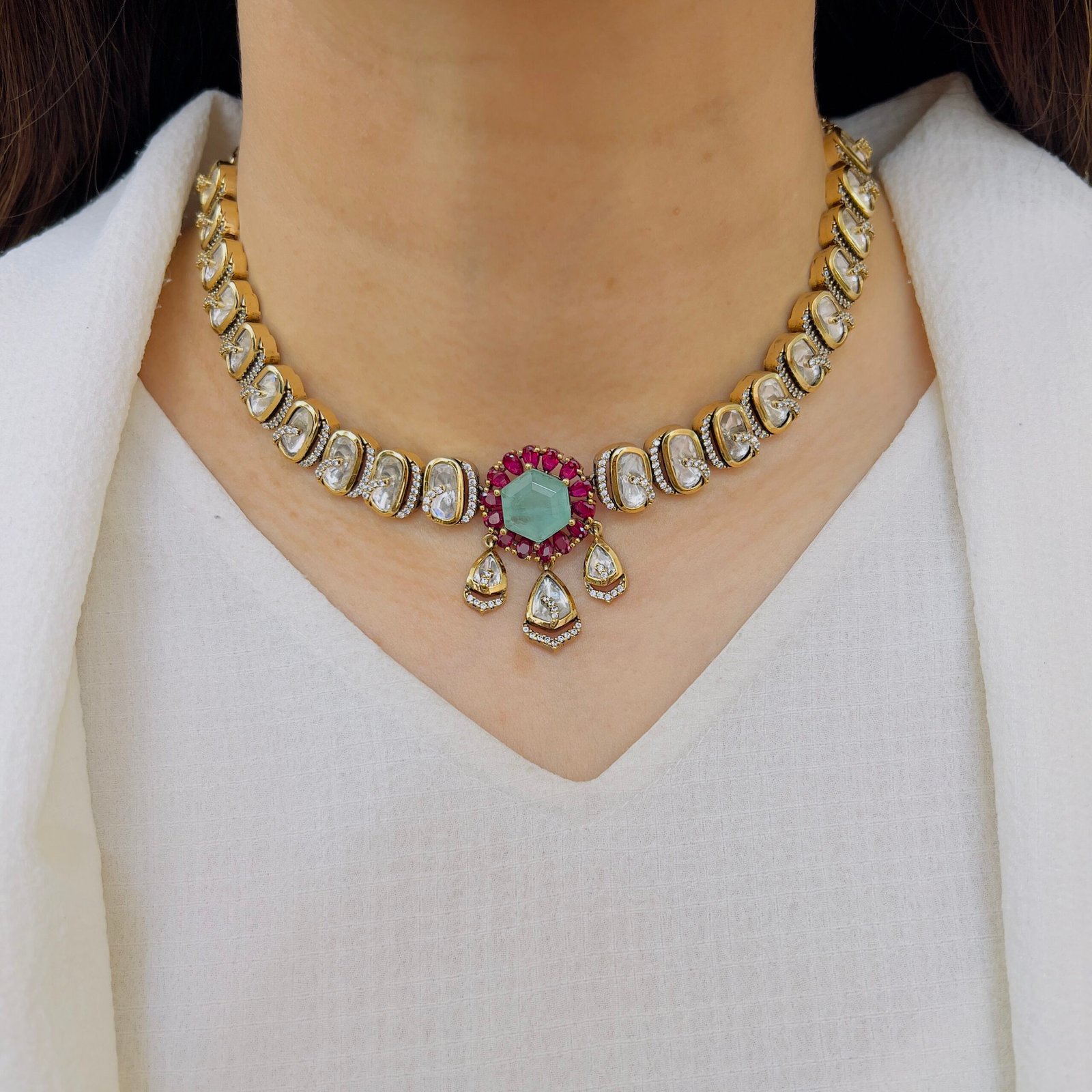 A masterpiece of artisanal design. This choker set captures the essence of royal heritage with its intricate stone-setting and delicate teardrop charms. The soft mint green central stone is beautifully contrasted by a halo of deep rubies, creating a focal point that demands attention.