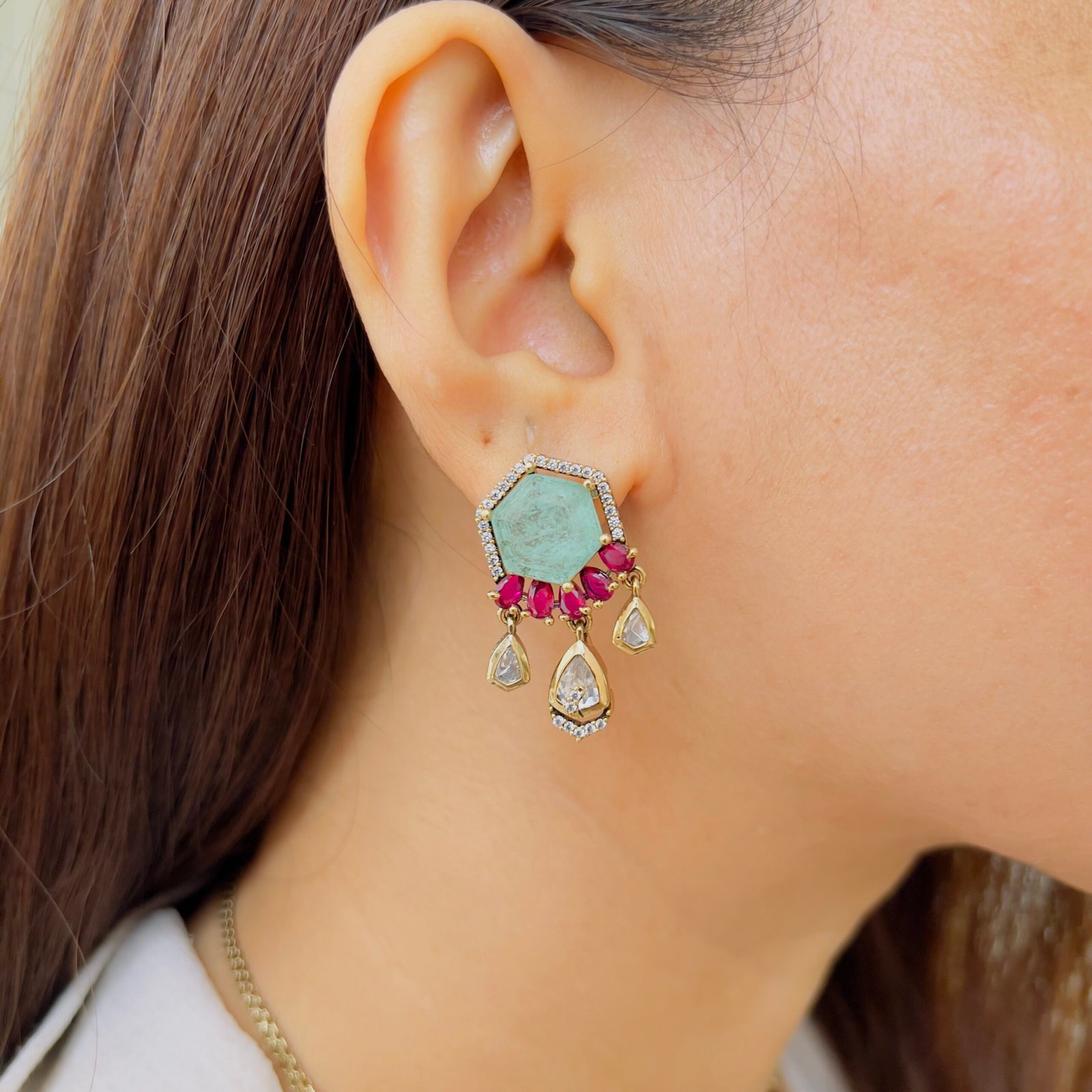 Handcrafted Mint Hexagon Choker with Ruby Accents & Shimmering Droplets