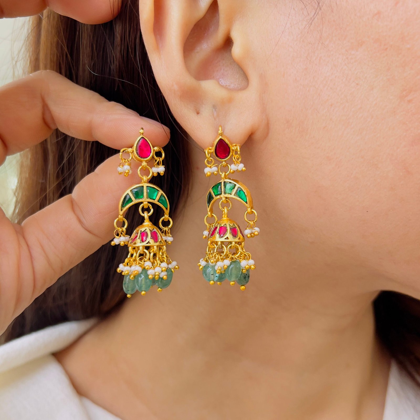 Handcrafted Royal Jadau Jhumkas with Ruby Red Droplets & Pearls