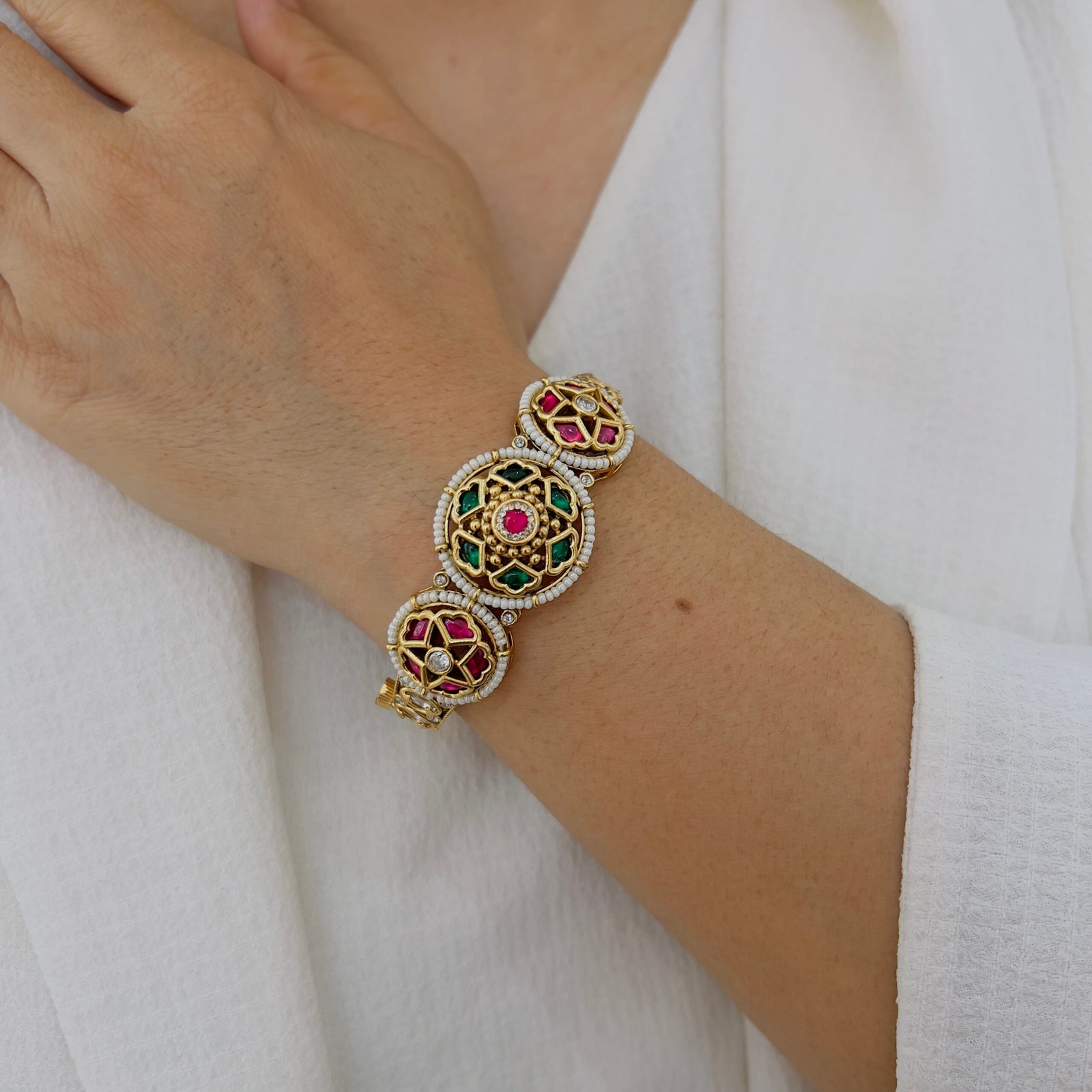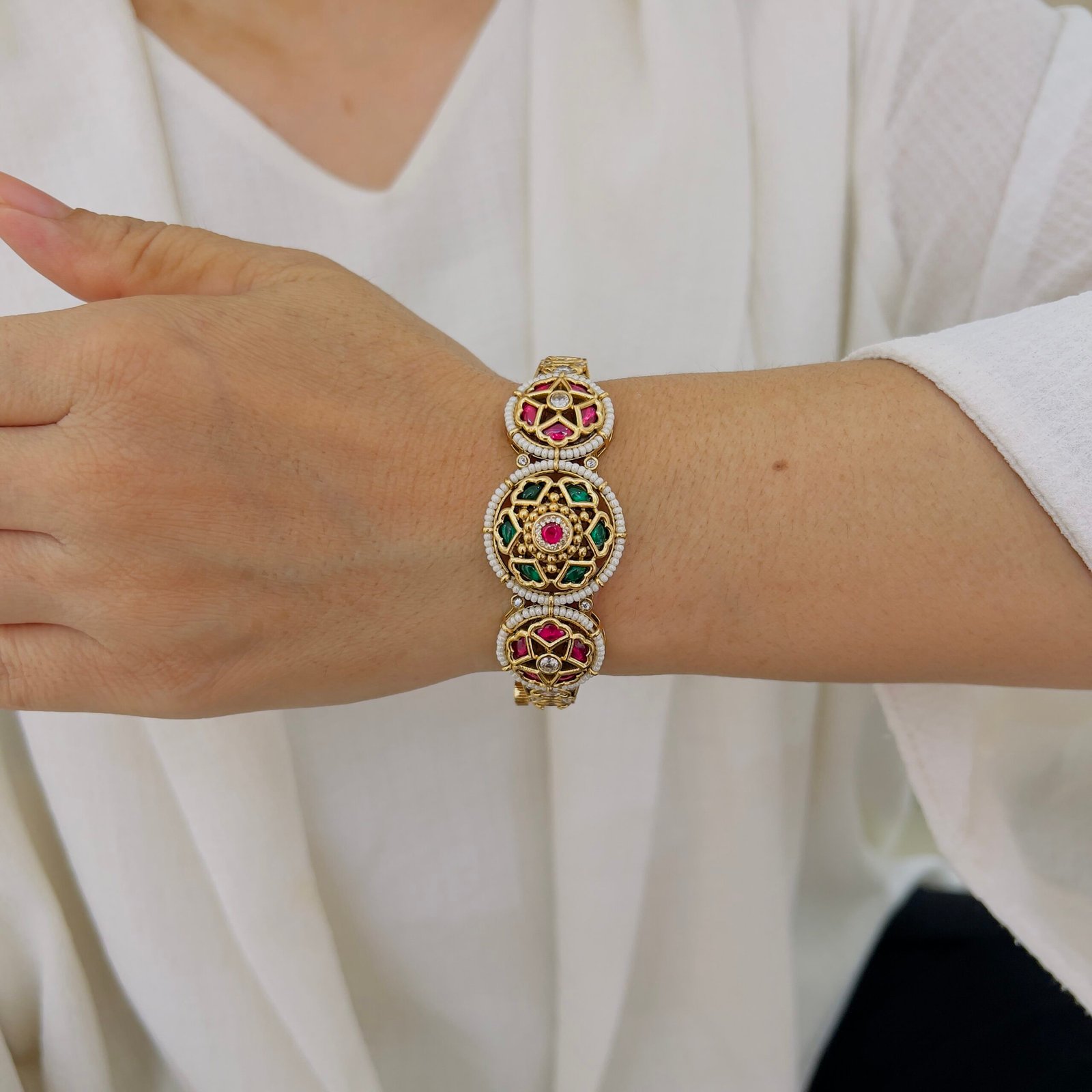Designed with traditional Indian temple craftsmanship, these bangles feature ornate detailing and an antique gold tone that reflects cultural richness, making them perfect for festive occasions and wedding celebrations.