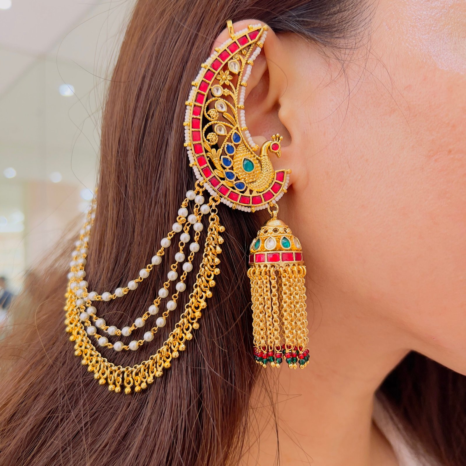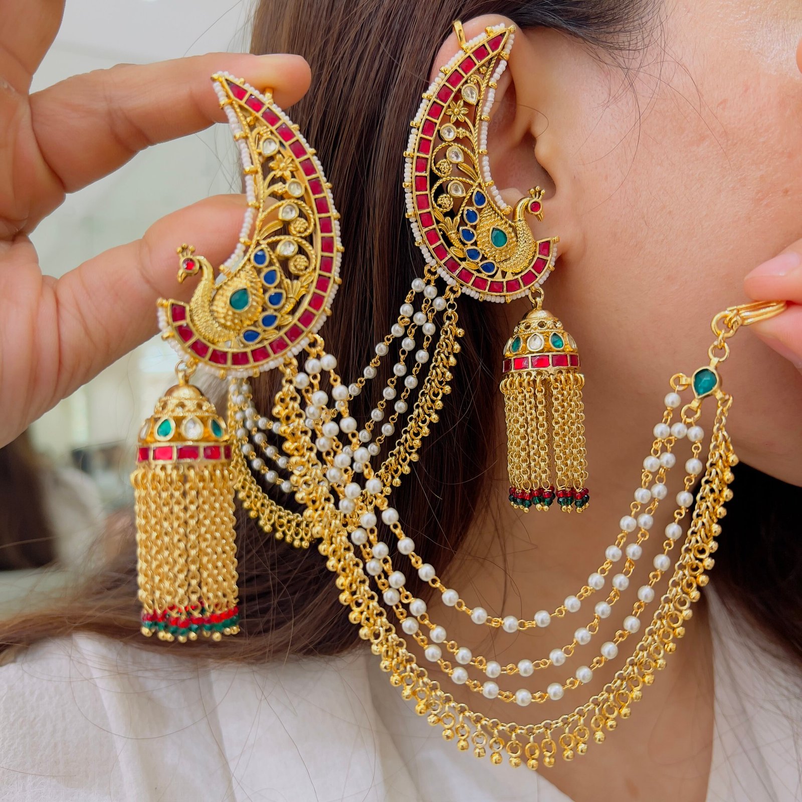 Inspired by royal heritage, this design combines classic Jadau work, pearl accents, a statement earcuff, and flowing chains for a luxurious, elegant finish.