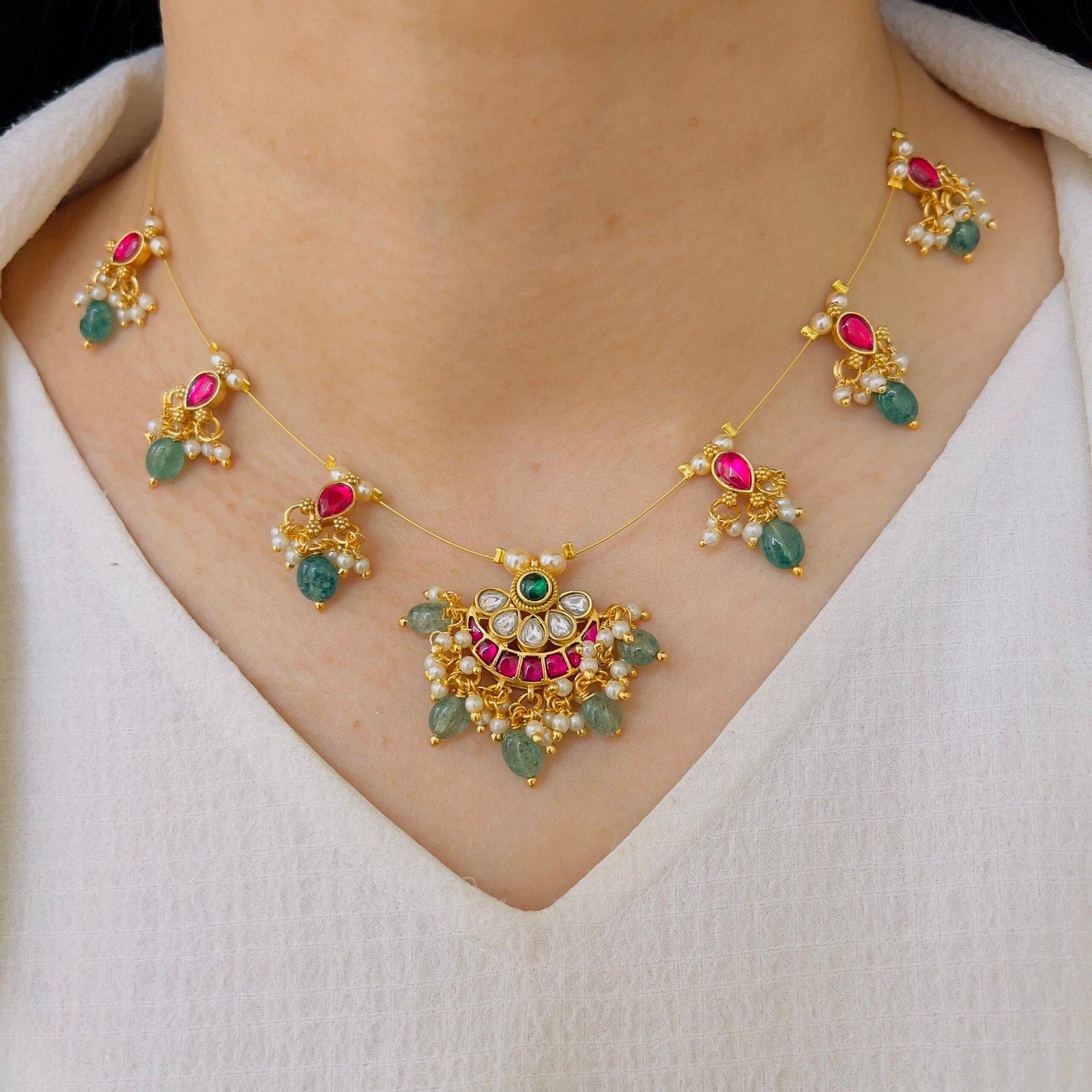 Experience the beauty of Jadau craftsmanship with a modern invisible finish. This delicate chain creates a floating effect, giving a minimal yet luxurious look perfect for daily wear and special occasions.