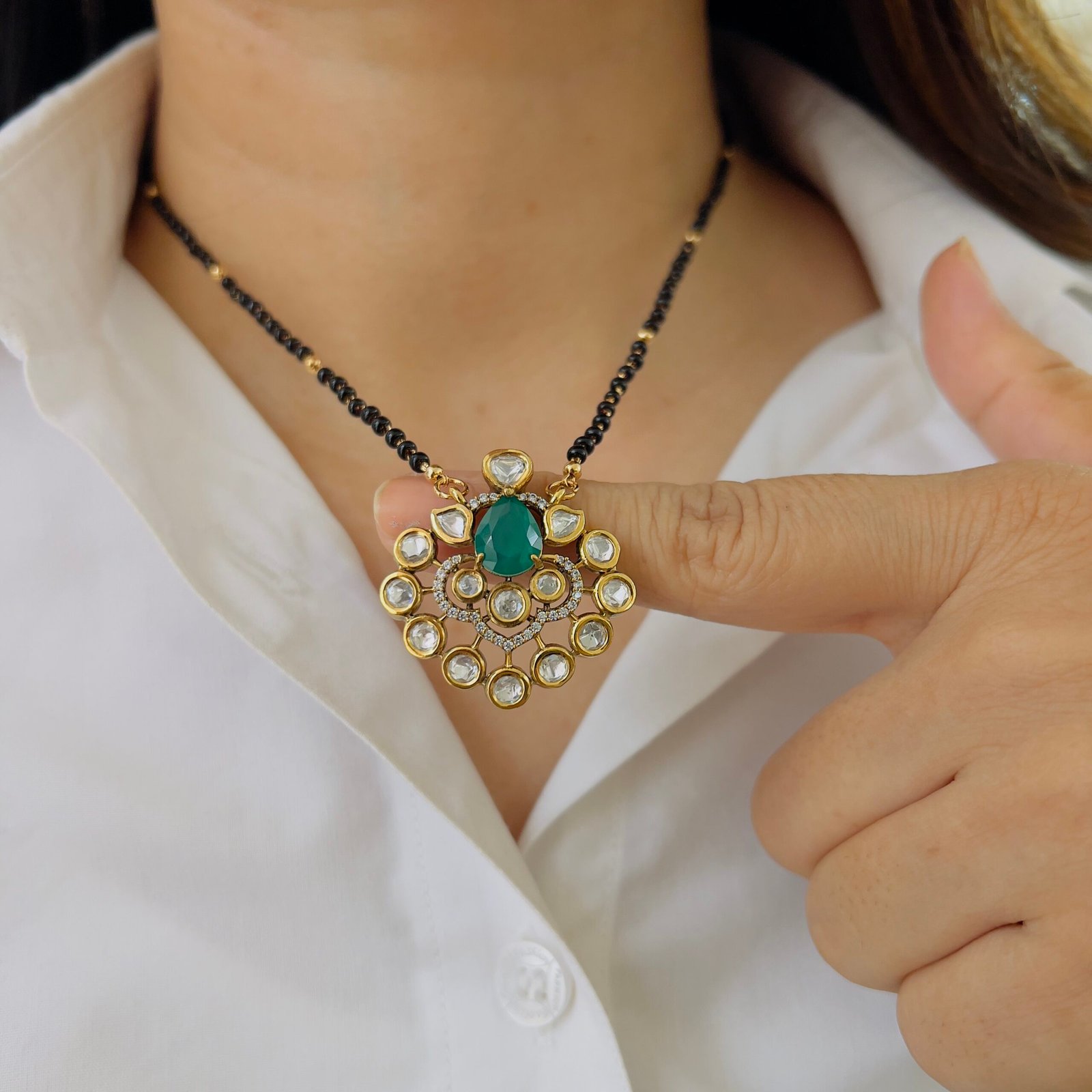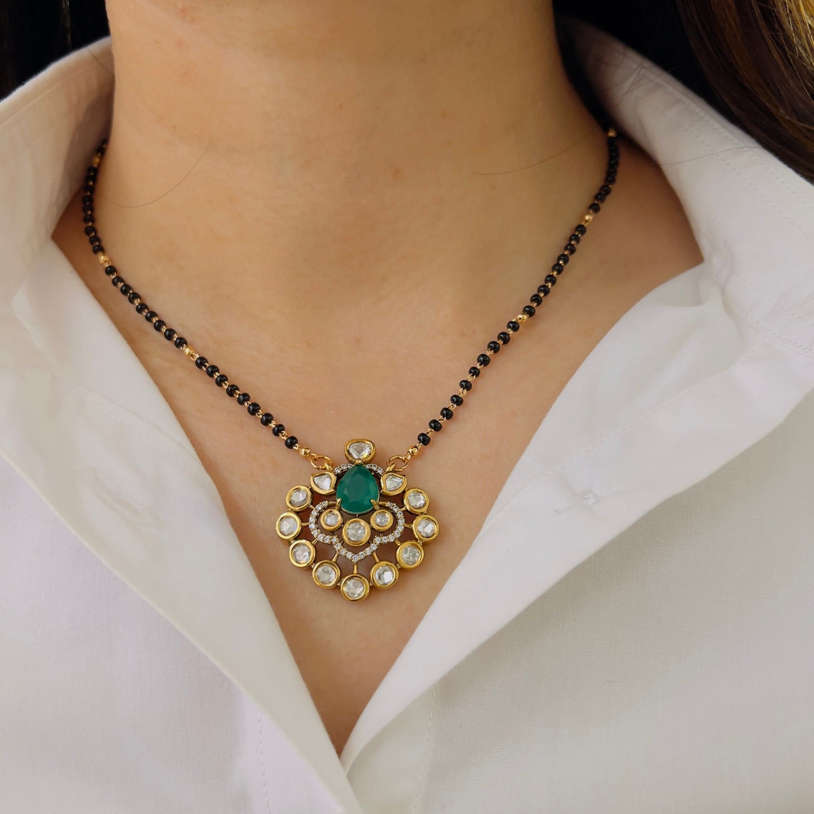 Crafted for modern women, this 18K gold plated mangalsutra offers elegant shine with its stones, Anti-tarnish and strong enough for rough use, it stays stunning all day.