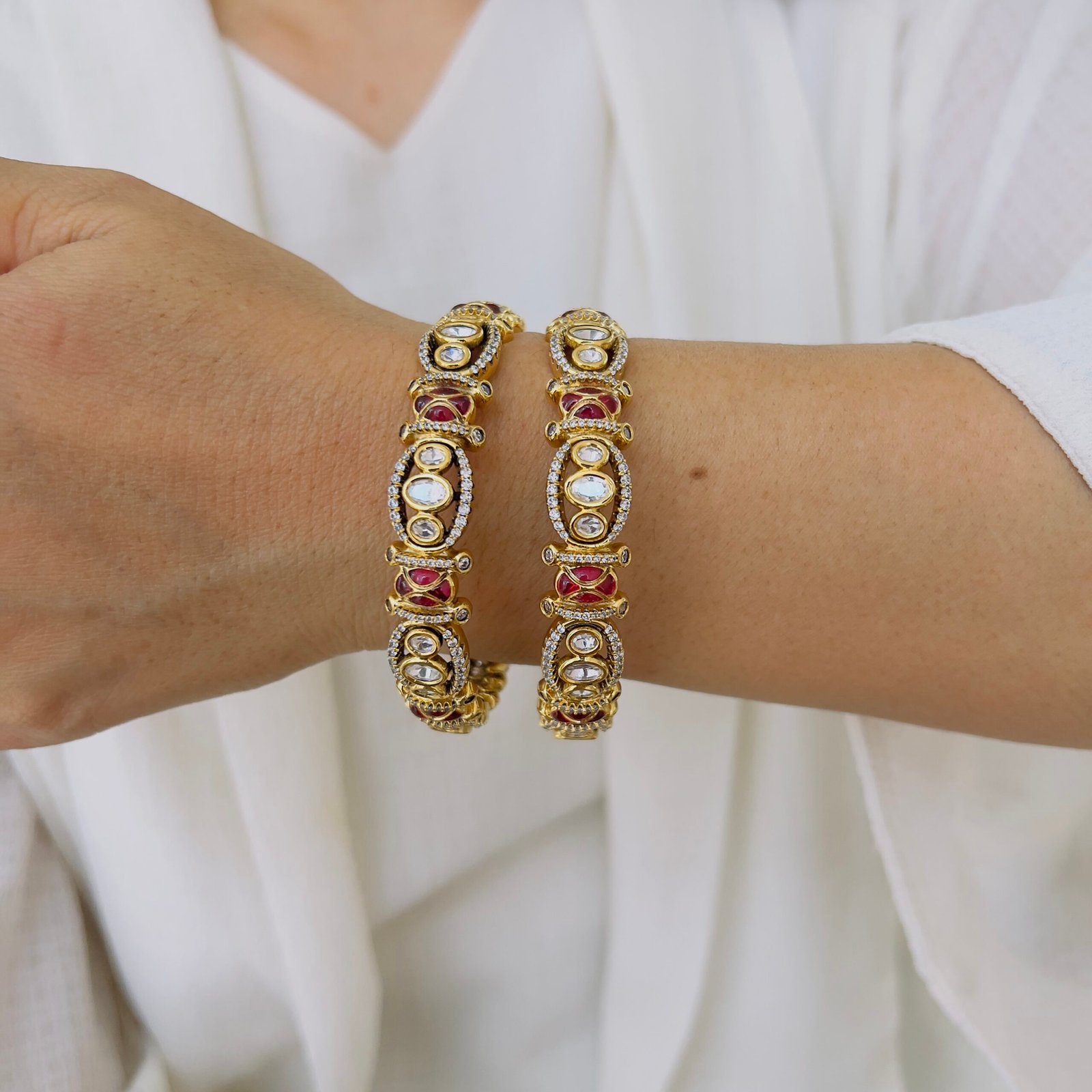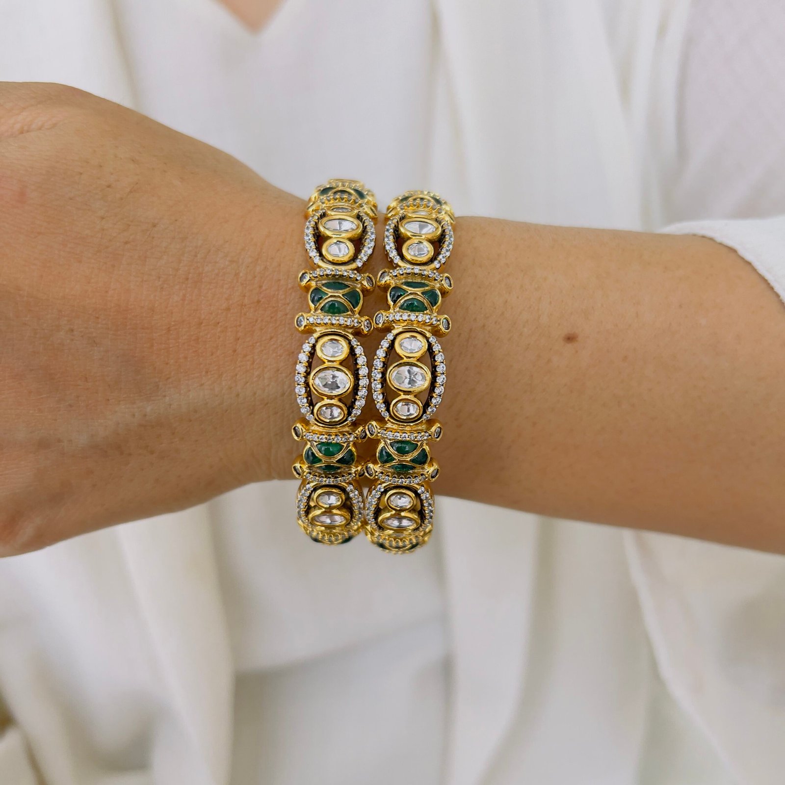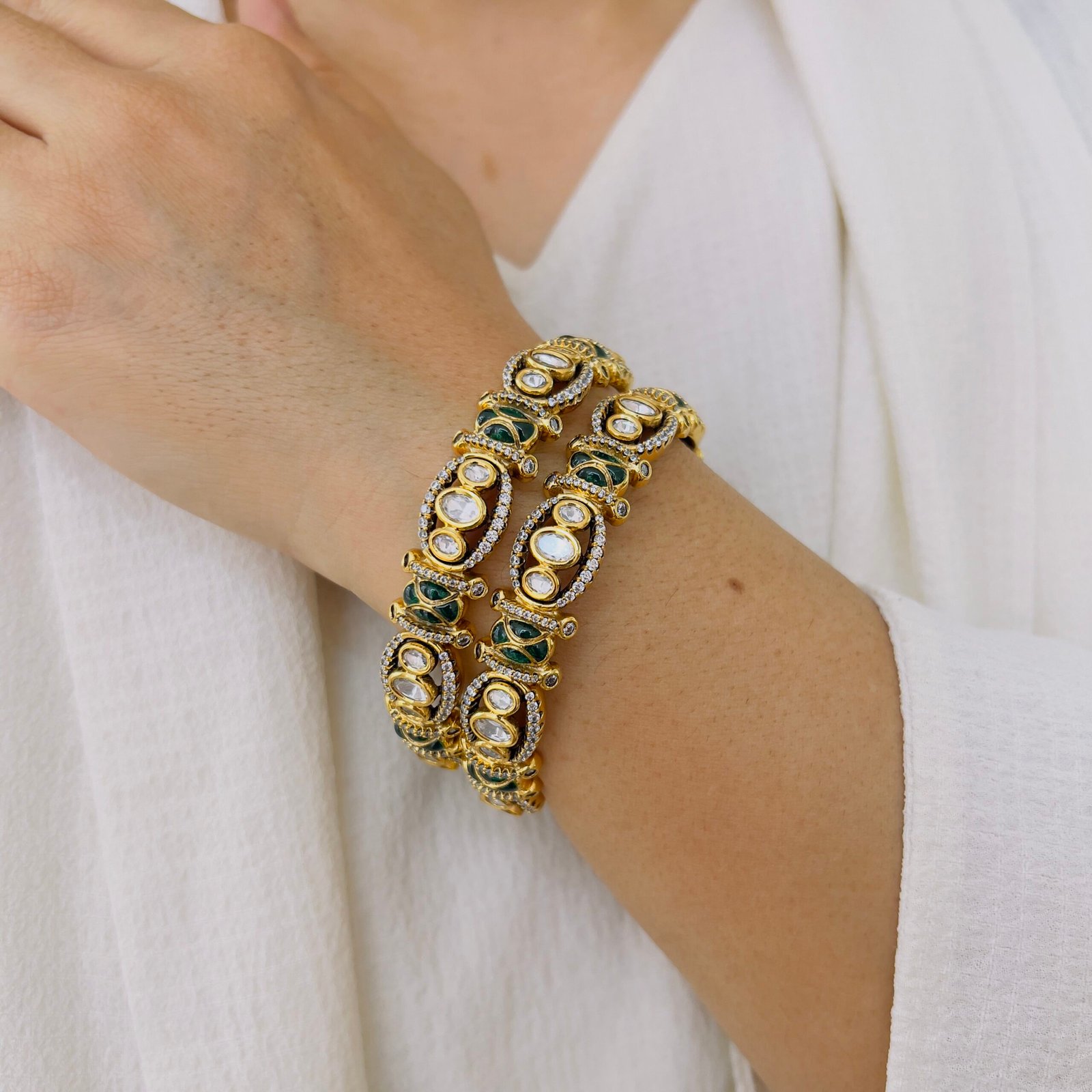 Featuring a prominent floral motif, antique gold texture, and shimmering stones, this Victorian bangle pairs beautifully with sarees, lehengas, and festive outfits for a rich, royal look.