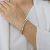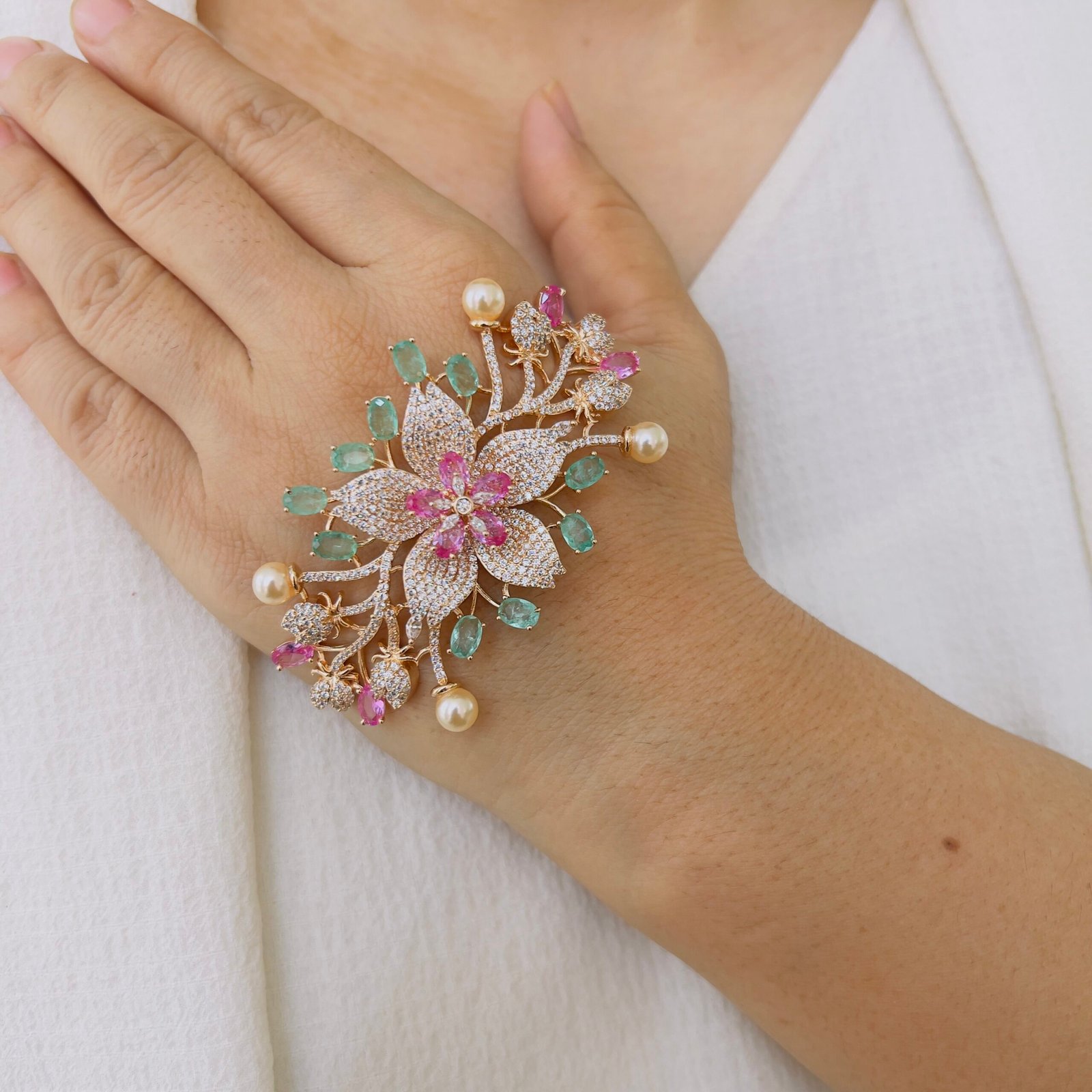 Elevate your look with this intricately designed haath phool bracelet, featuring delicate floral patterns, shimmering crystals, and elegant pearl drops. Its unique design gracefully covers the hand, making it a standout accessory for bridal and festive styling.