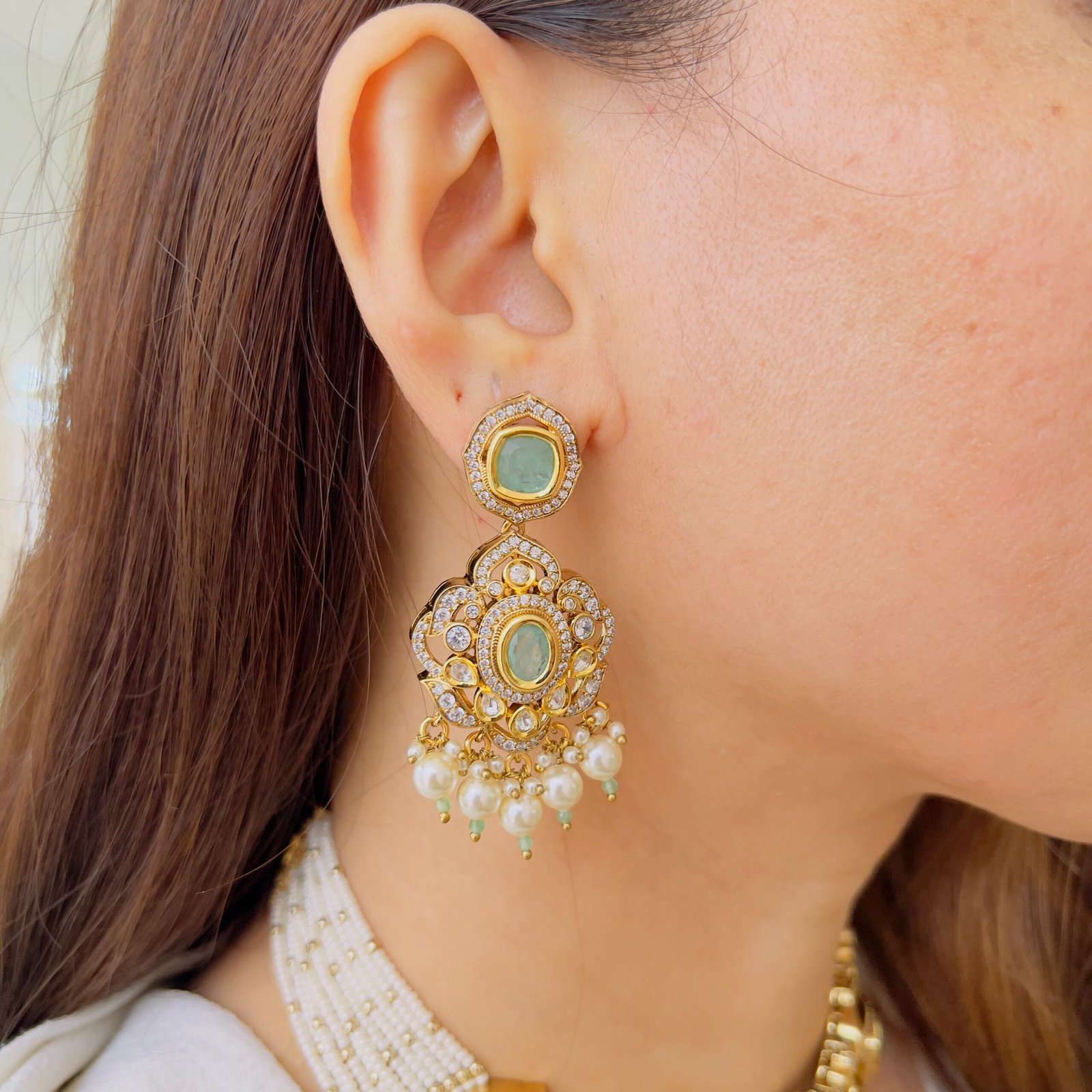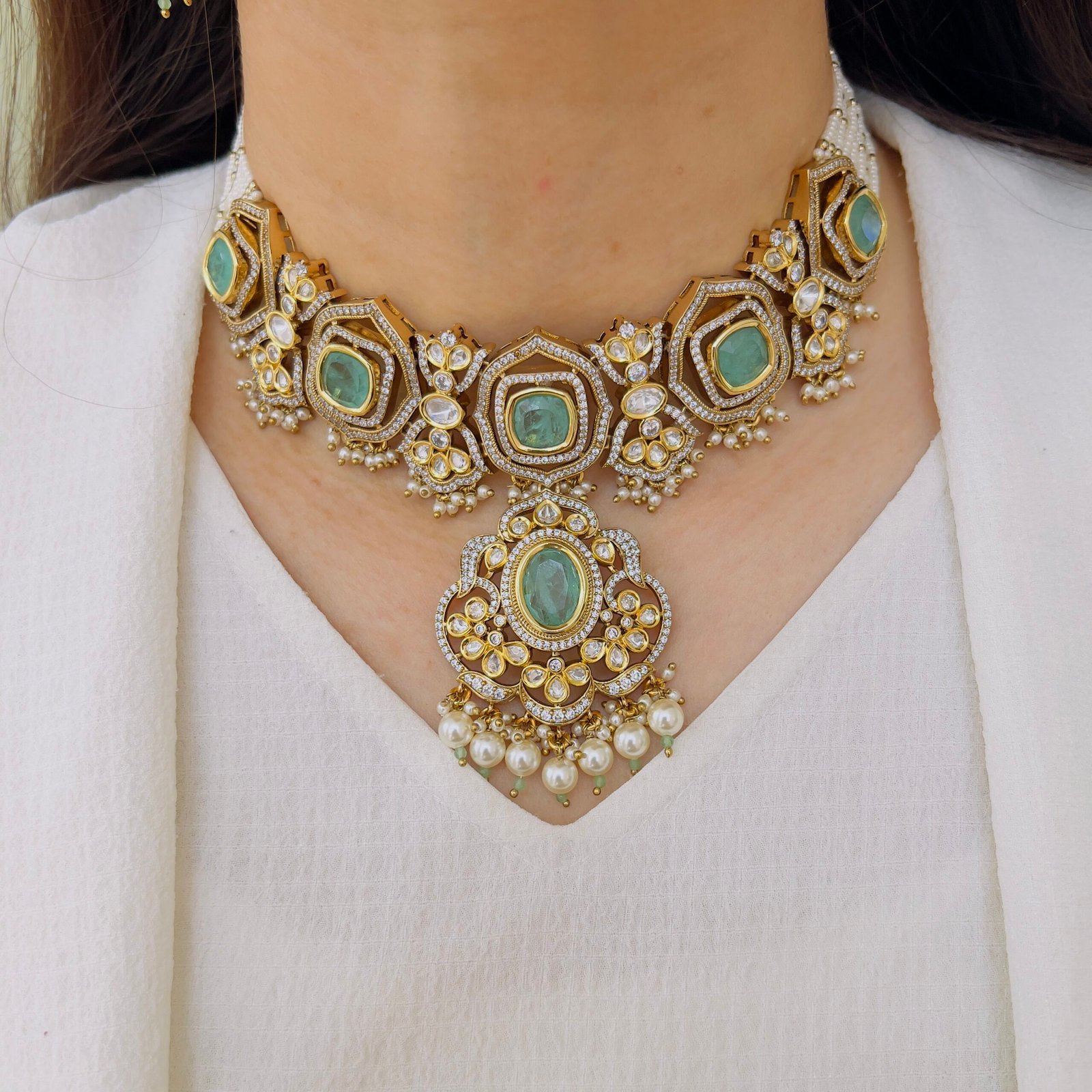 Command attention with the regal pairing of deep amethyst and fiery ruby. This handcrafted set features five luxurious strands of faceted purple beads that shimmer with every movement. The grand gold-toned pendant is a masterpiece of artisan craft, featuring ruby-pink floral motifs, shimmering Polki-style glass, and a delicate fringe of pearls. Completed by a pair of heavy statement drop earrings, this duo is designed for the woman who loves her jewelry to tell a story of vintage royalty.
