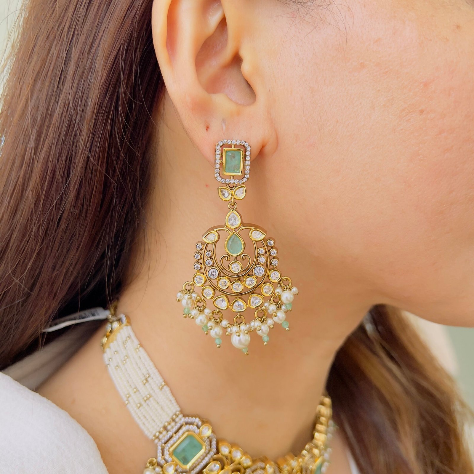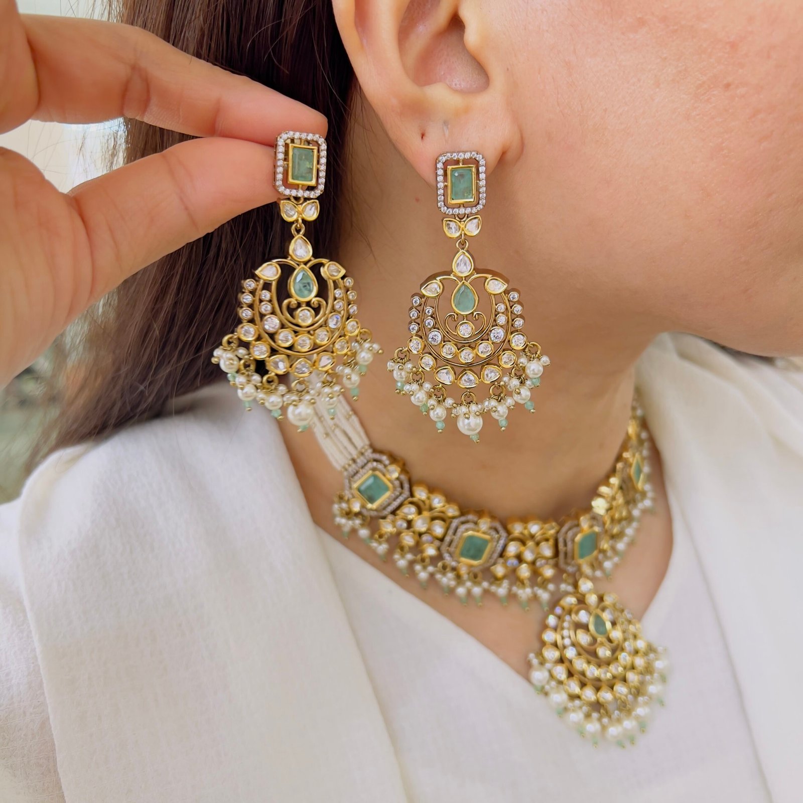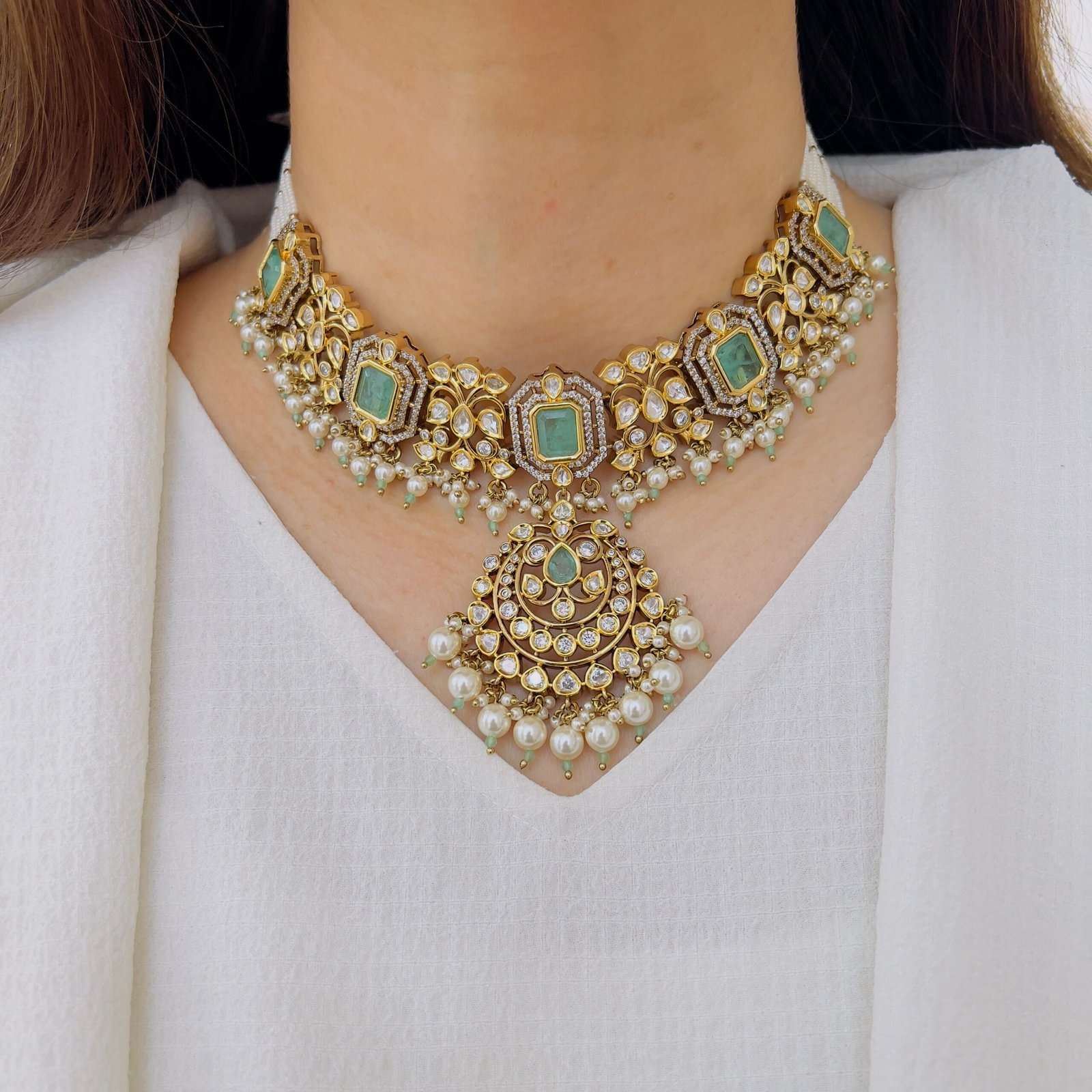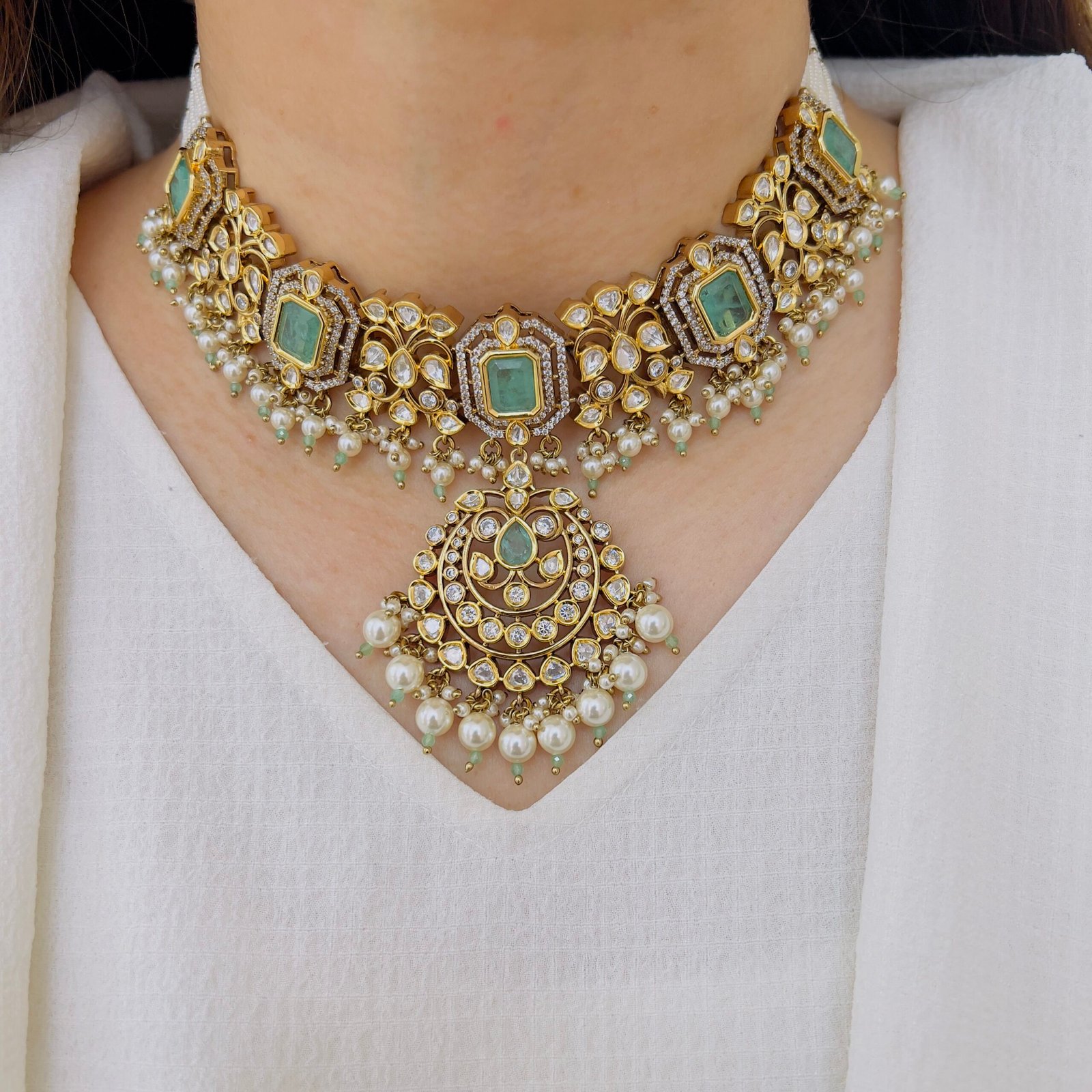Majestic Emerald & Polki Choker Set with Pearl Droplets