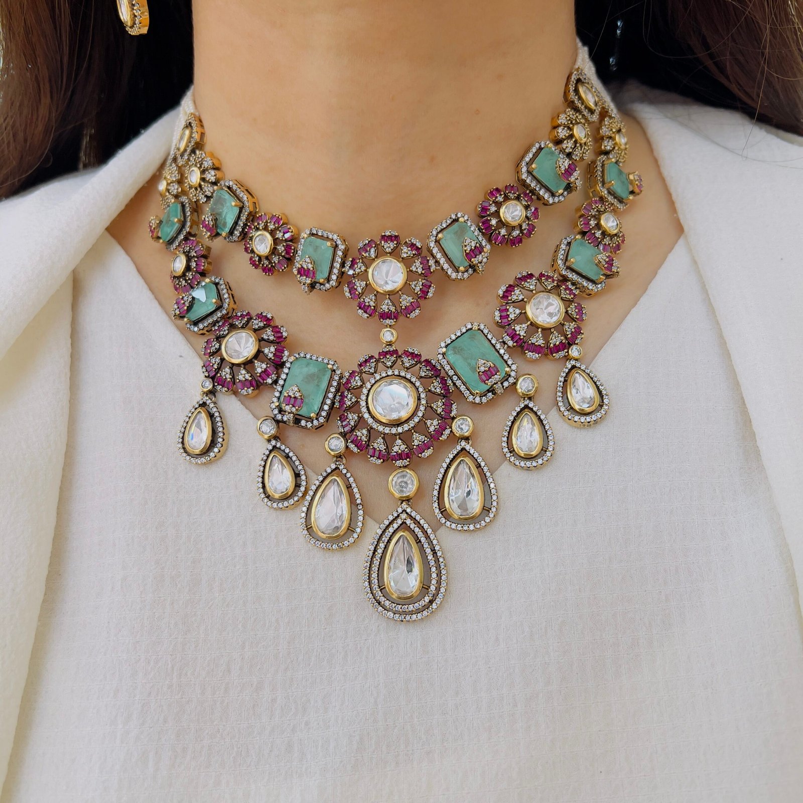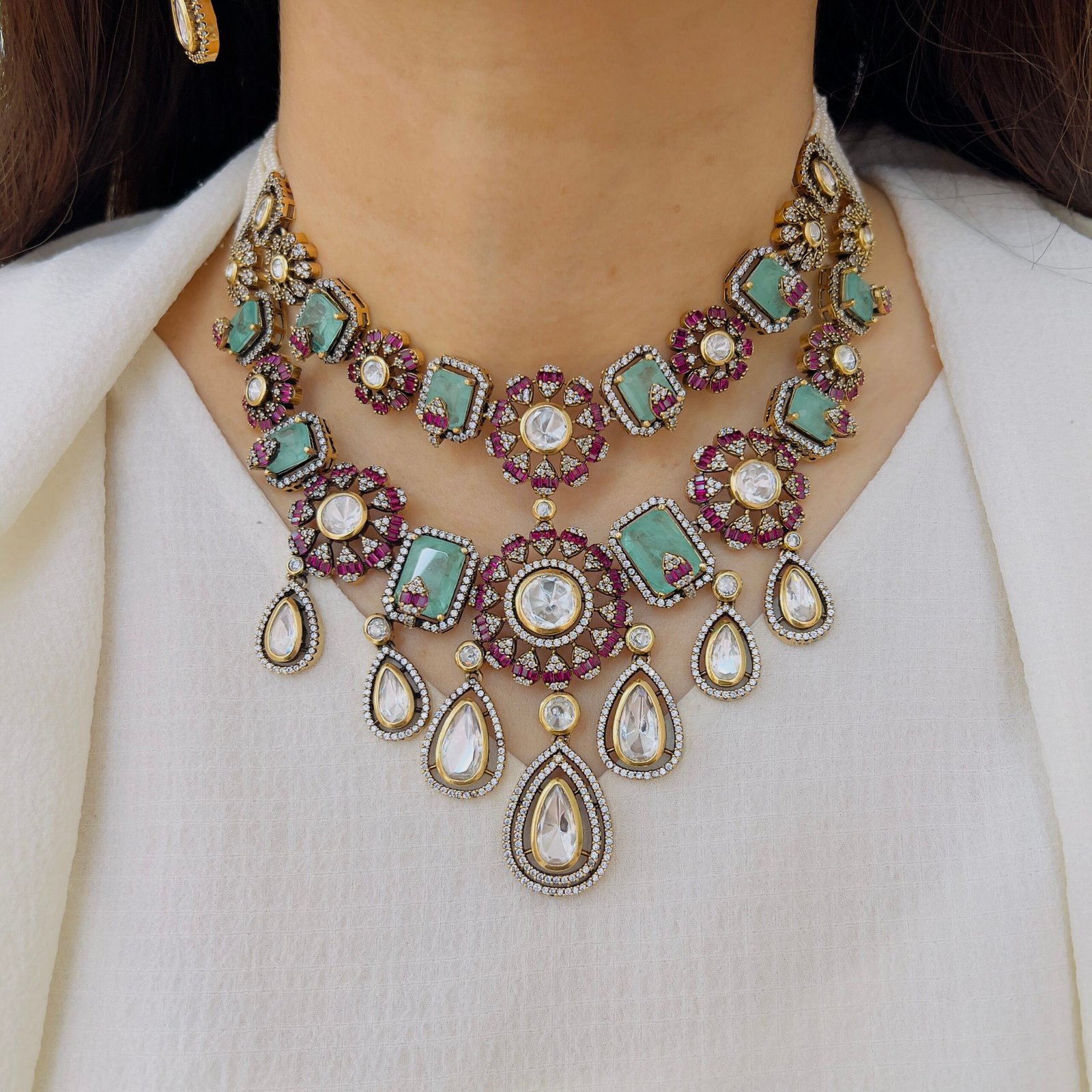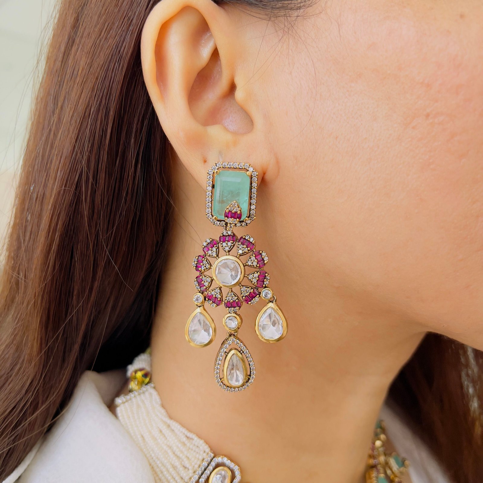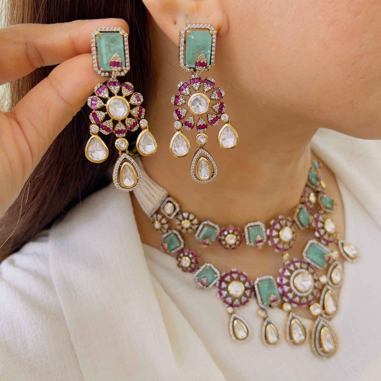 Embrace the timeless beauty of classic jewelry design. This set features a bold, ruby-red central stone framed by intricate golden metalwork and finished with delicate ruby-toned beads. It’s a masterpiece that pays homage to traditional “country model” craftsmanship.