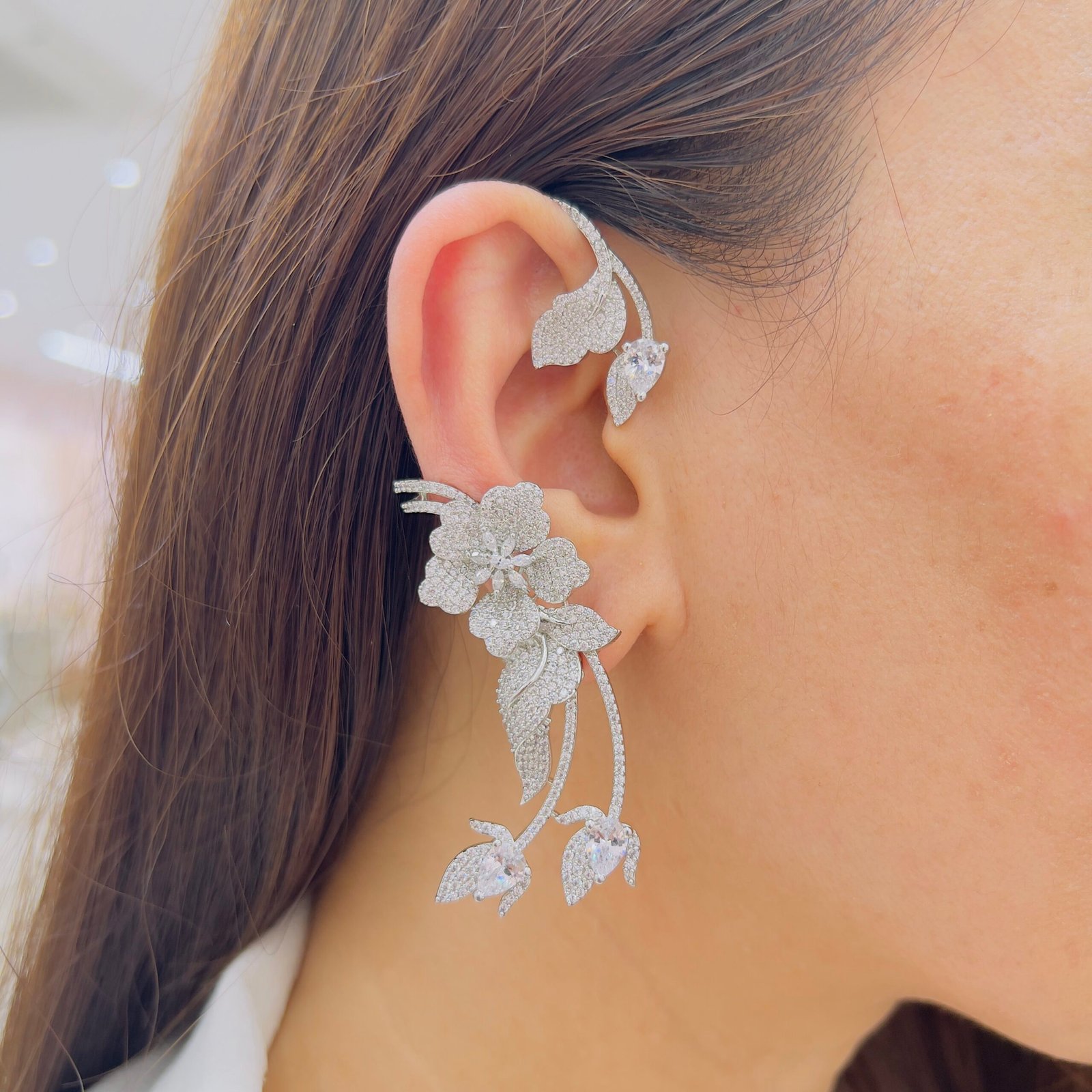 Designed to steal the spotlight, these ear cuffs feature a graceful cascade of shimmering stones that flow like liquid sparkle, Perfect for elevating your party and evening looks effortlessly.