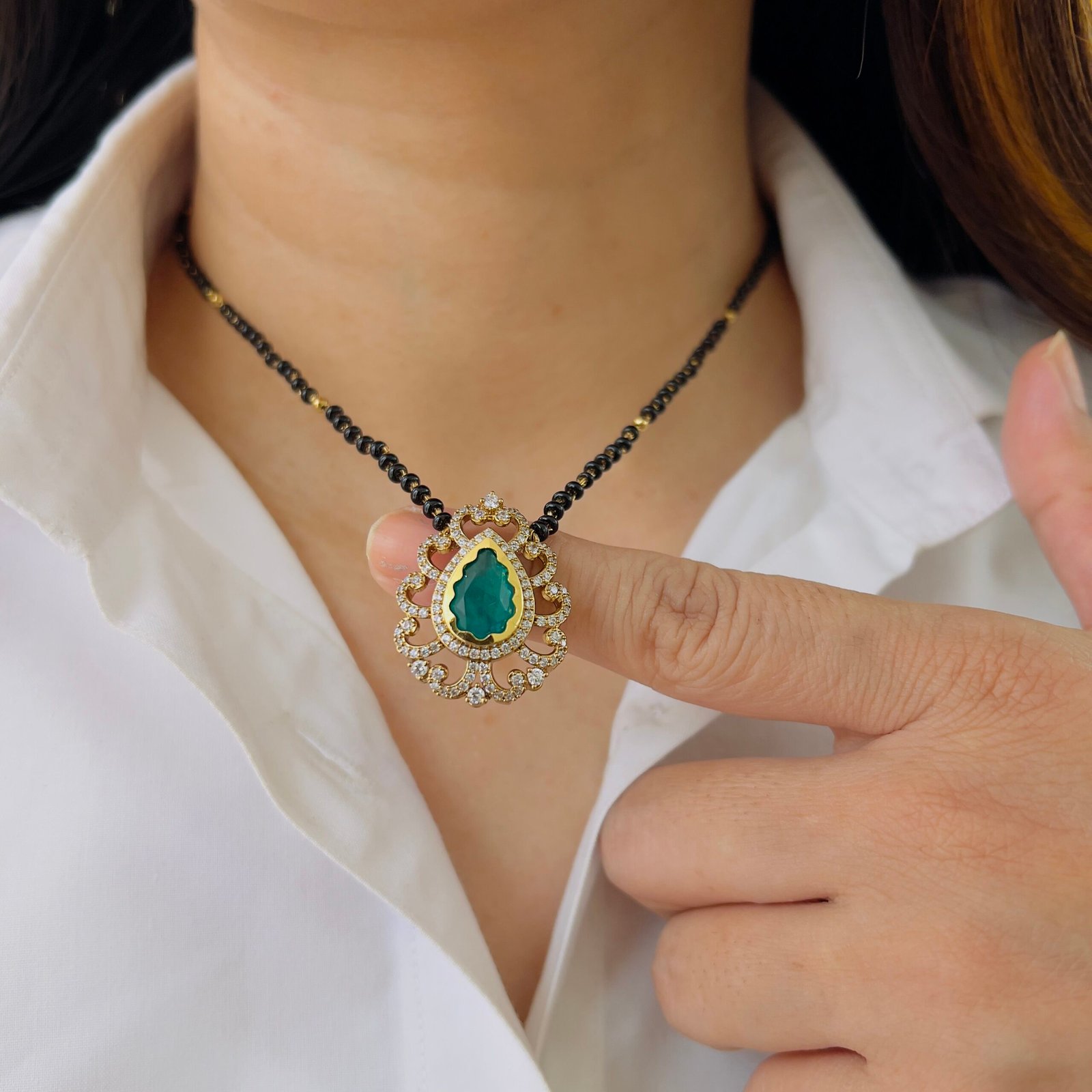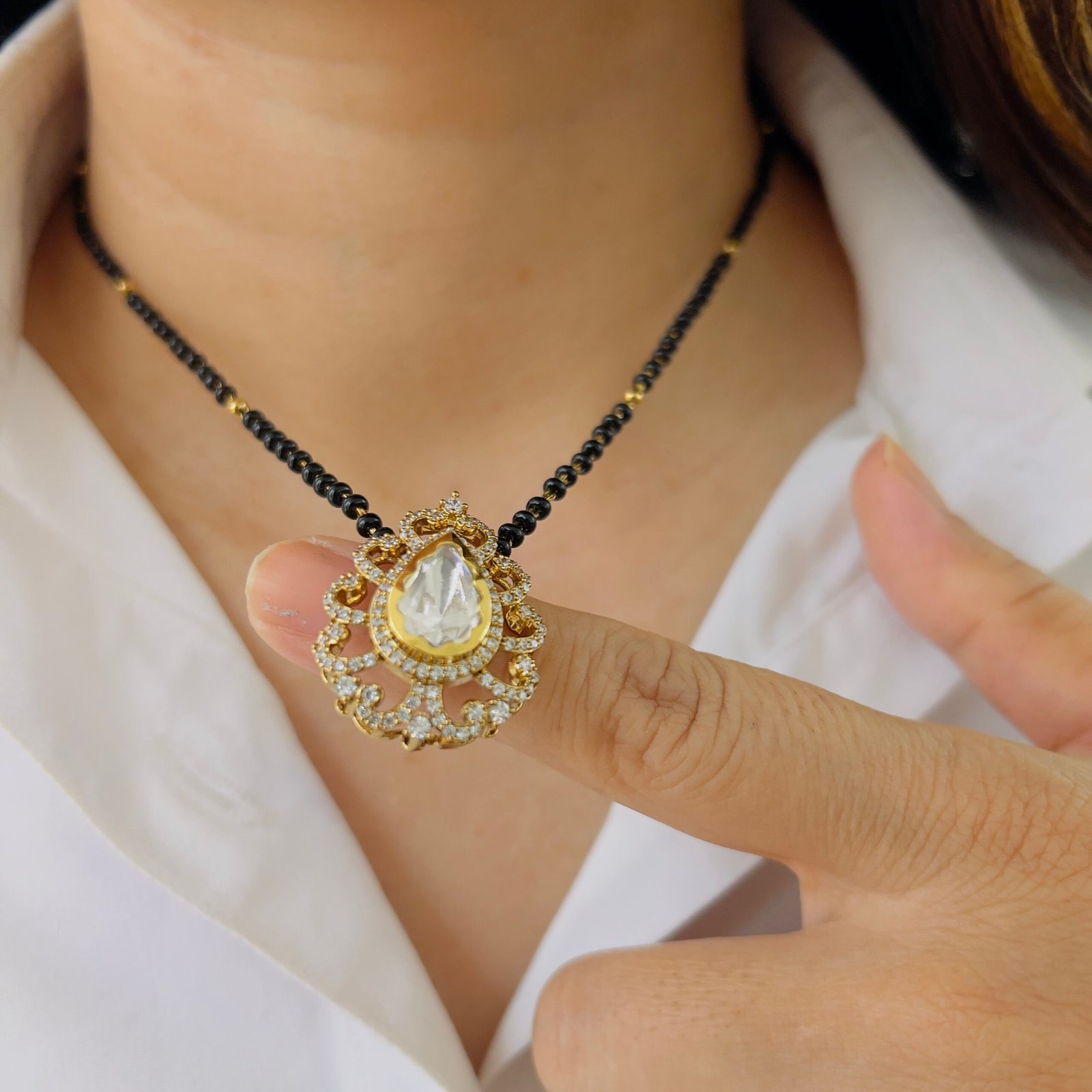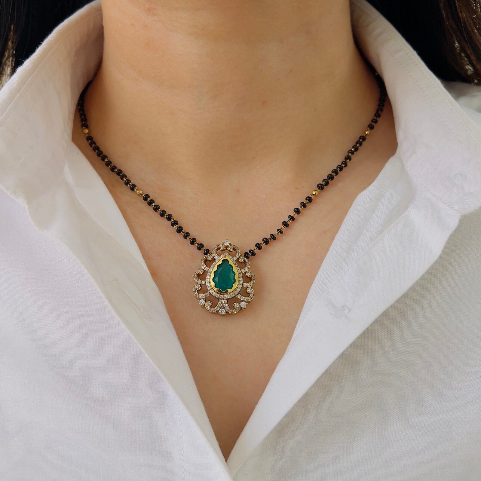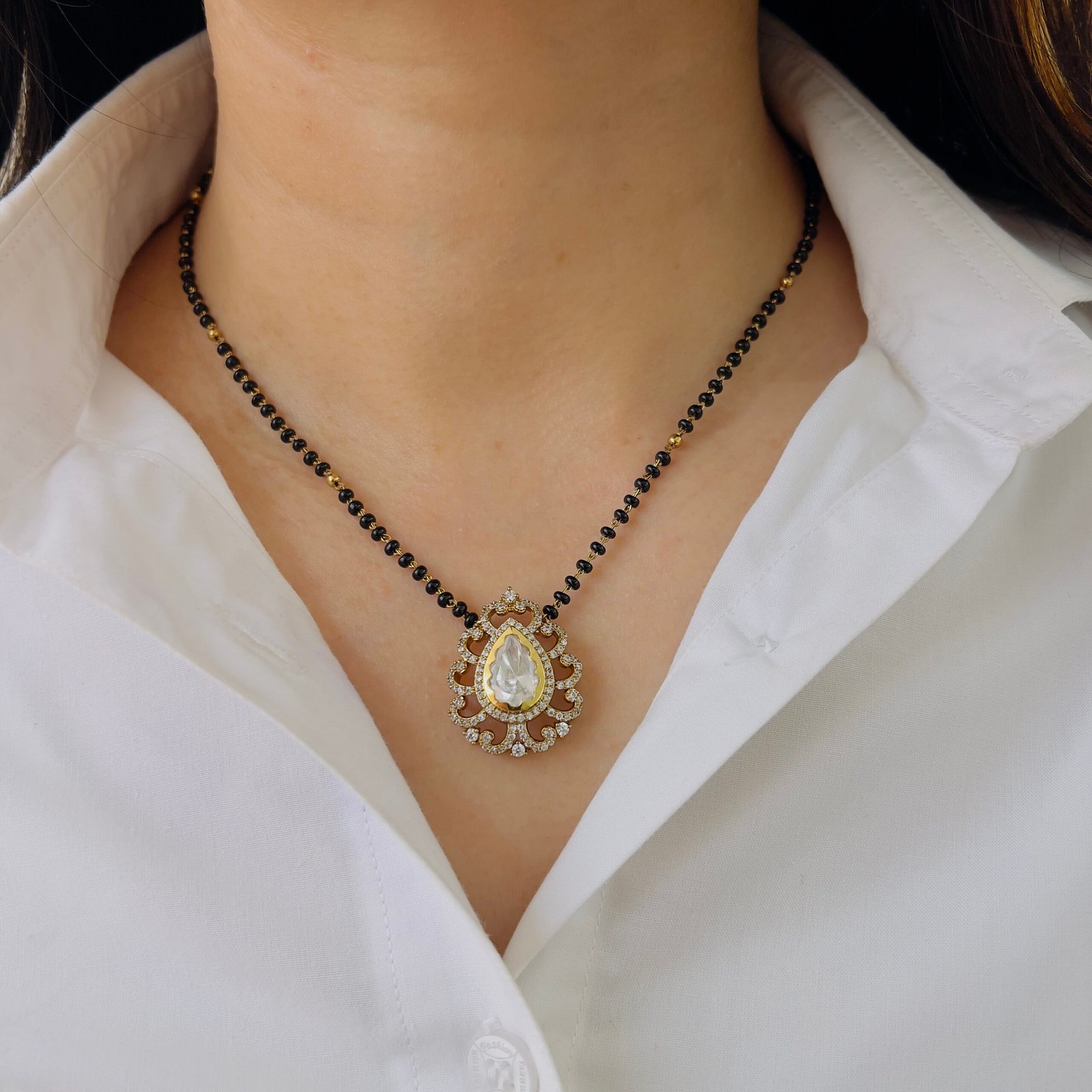 A timeless 18K gold plated mangalsutra designed for strength and shine, Anti-tarnish and suitable for rough use, with sparkling stones for a rich touch.