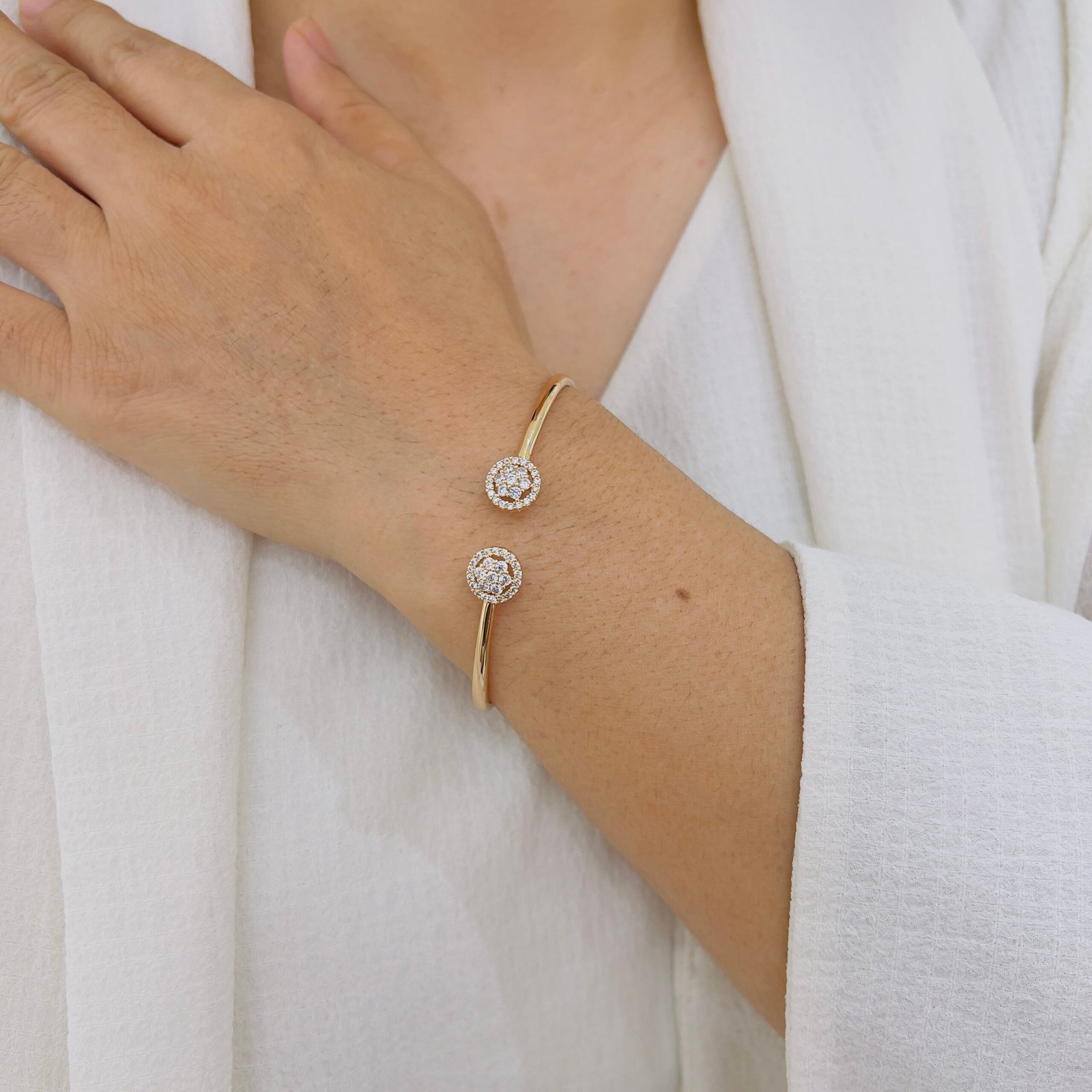 Designed with premium 18k gold plating, this shiny open kada bracelet showcases carefully set American diamond stones, Perfect for daily wear, it delivers a stylish look with durable comfort suited for routine use.