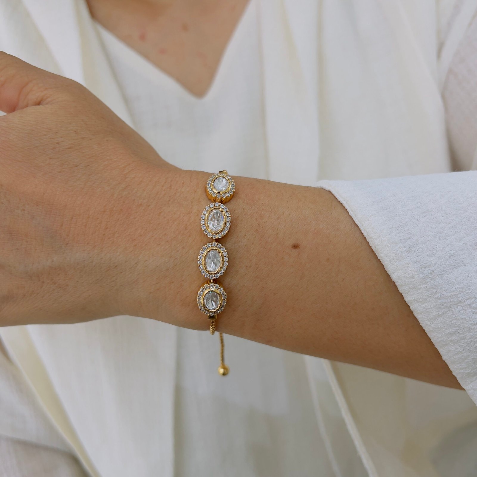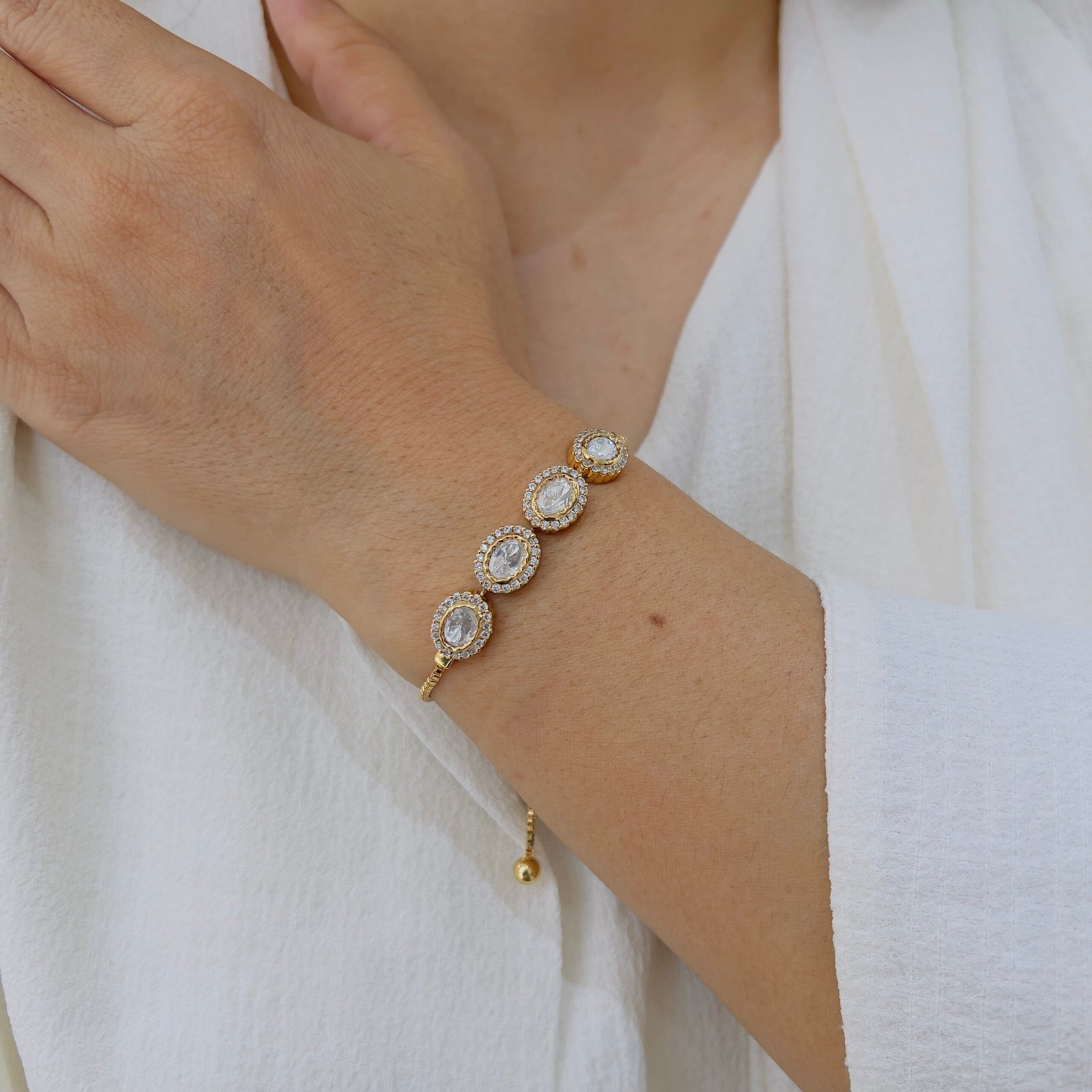 A beautiful everyday bracelet with premium gold plating and shiny stones, Lightweight, comfortable, and perfect for office wear or daily use.
