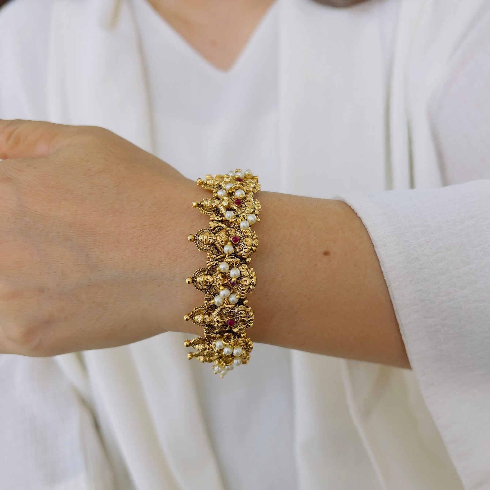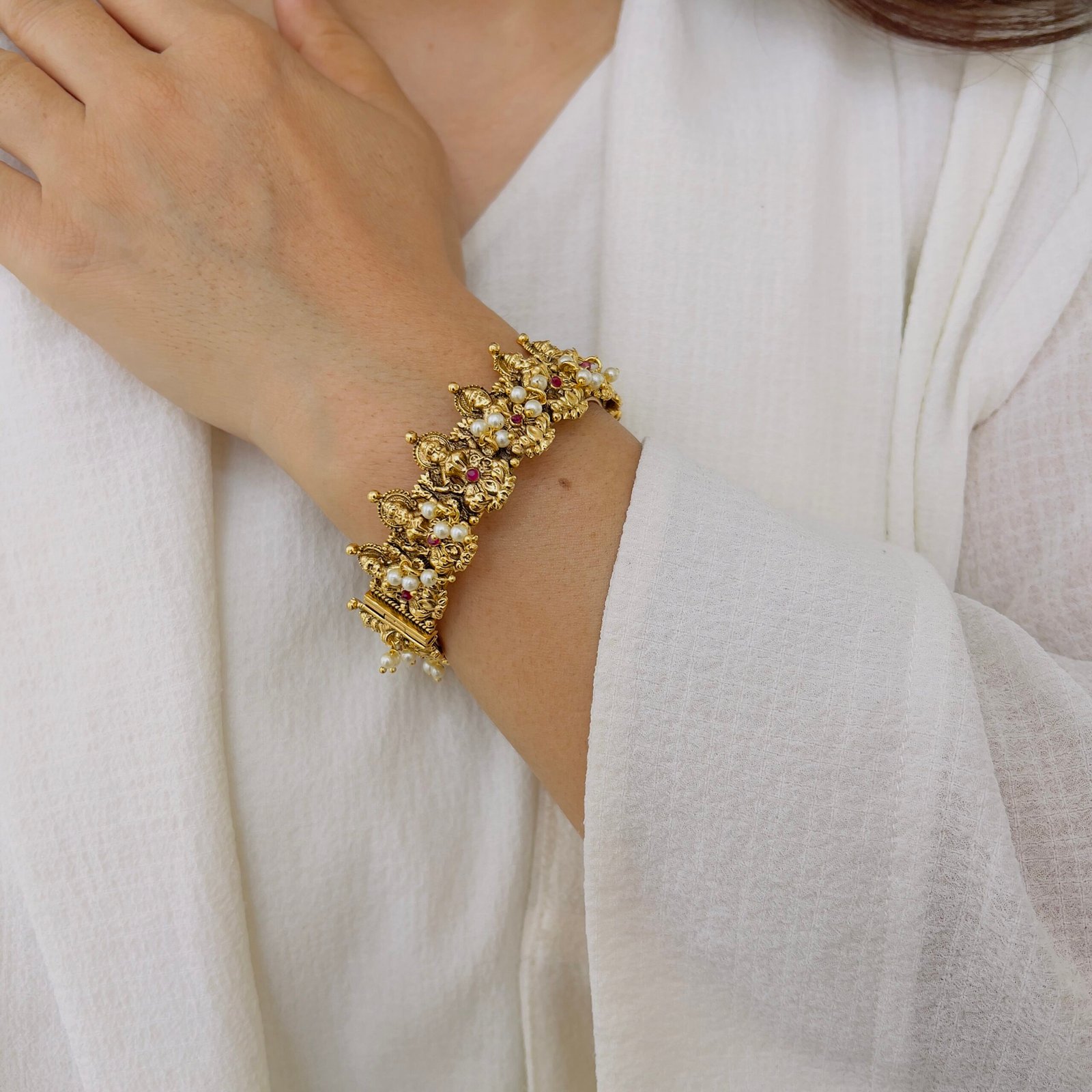 Crafted with intricate temple-inspired motifs, these bangles bring a luxurious and elegant touch to your jewelry collection. Perfect for weddings and festive occasions, they beautifully enhance your ethnic outfits.