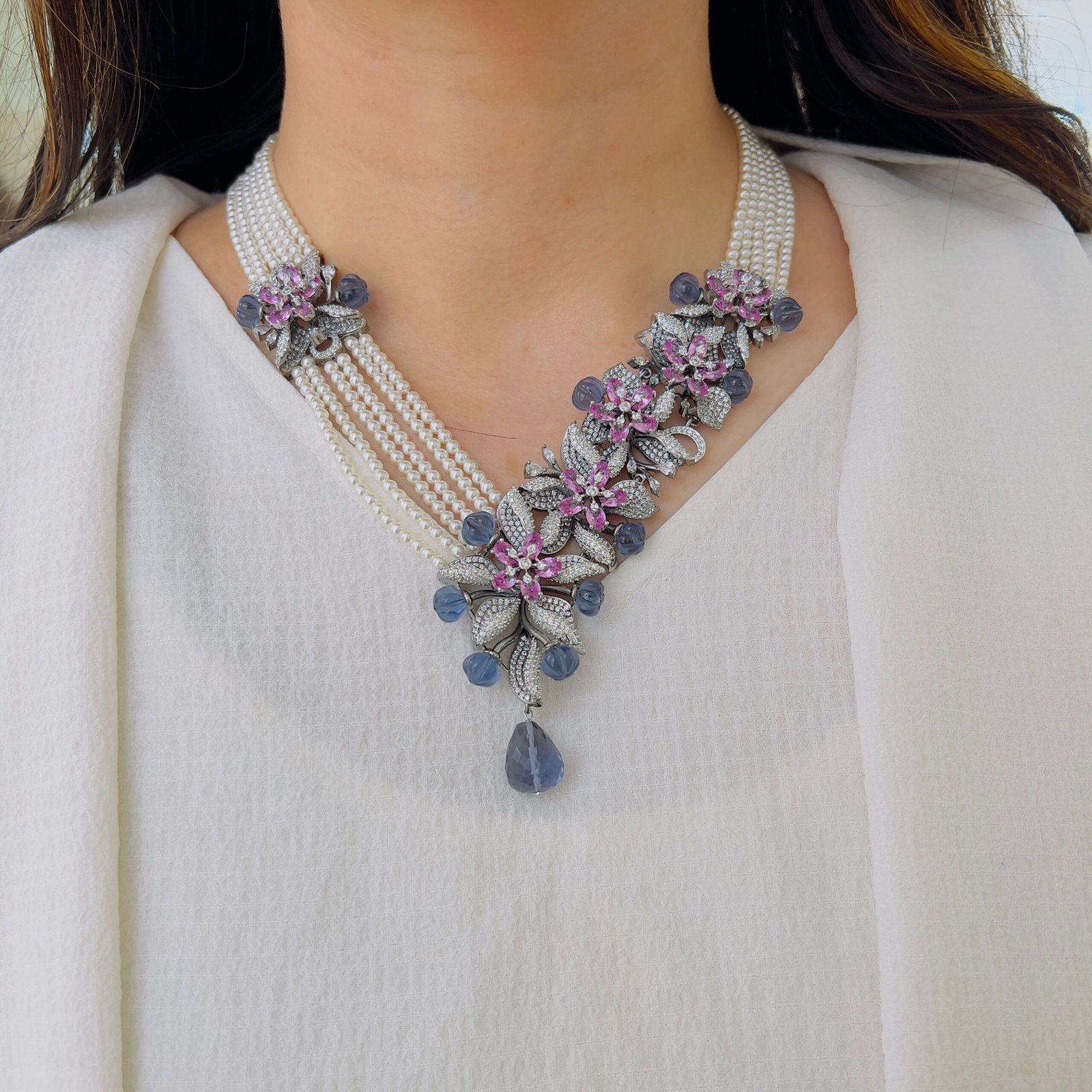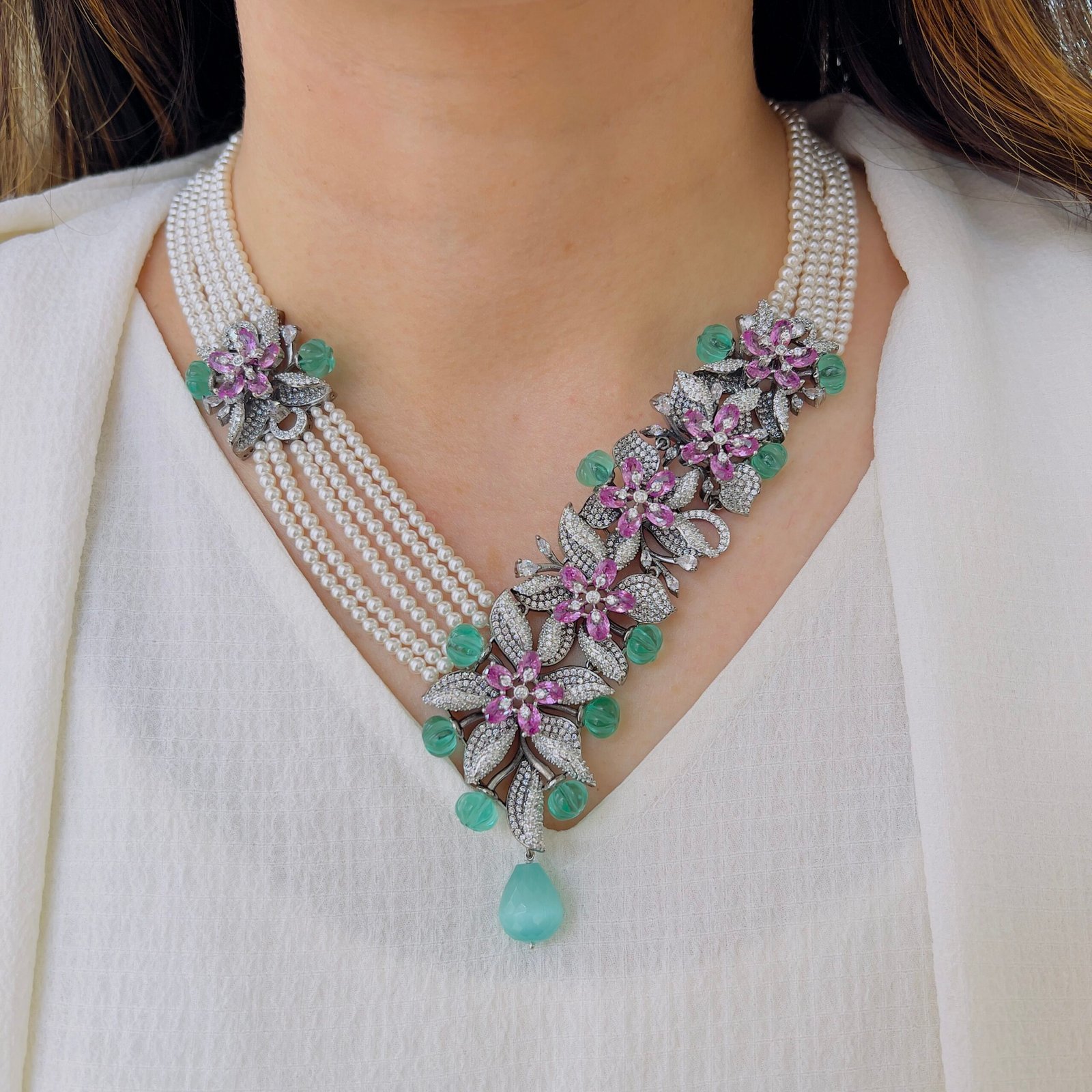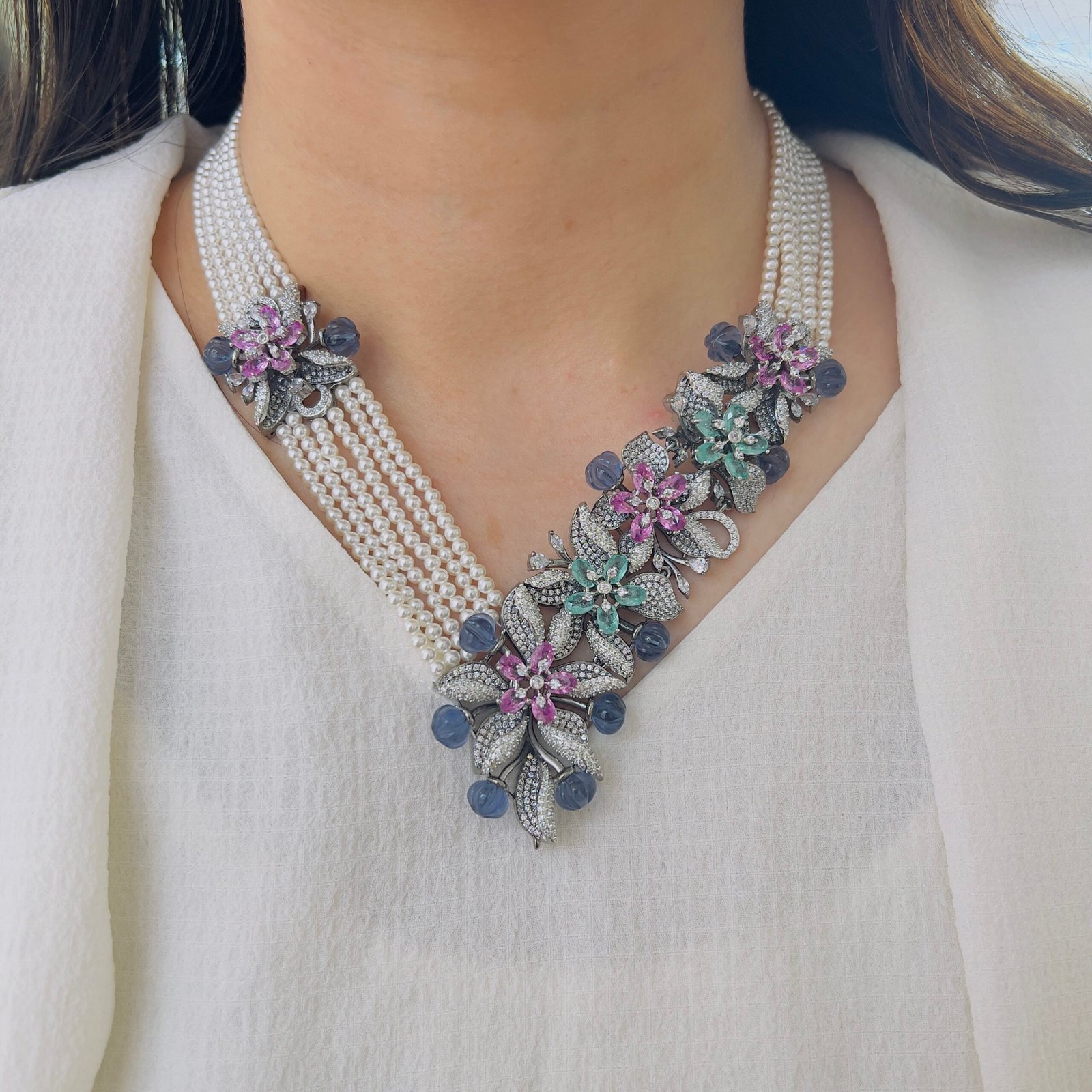 Featuring exquisite stone-studded flowers and smooth beaded strands, this necklace brings together artistry and sophistication, A perfect accessory to elevate ethnic and Indo-western ensembles, ideal for customers who appreciate high-quality statement jewellery.