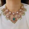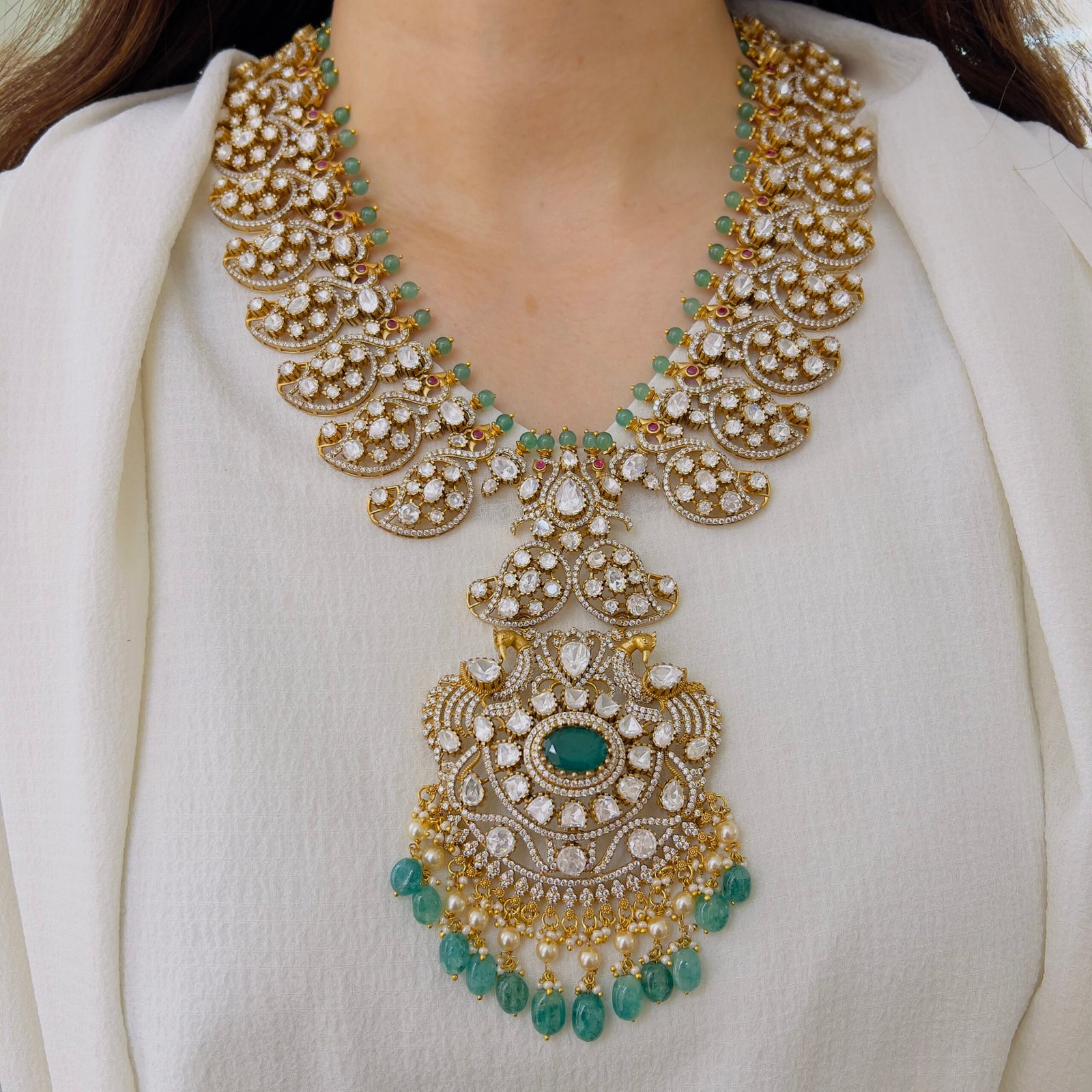 Turn every occasion into a royal affair with this breathtaking Jadau–Kundan necklace set. Designed with intricate handcrafted detailing, the necklace features layers of sparkling stones forming elegant traditional motifs, finished with a grand statement pendant. The beautiful green stone centerpiece and delicate bead drops add a rich and luxurious touch to the design, Paired with matching long statement earrings, this set is perfect for weddings, festive celebrations, and special occasions. A timeless blend of traditional Jadau craftsmanship and classic Kundan elegance that instantly elevates any outfit. ✨