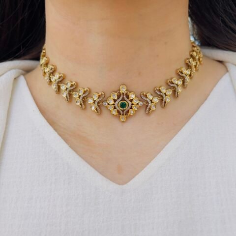 A statement choker crafted to elevate your elegance. Designed with intricate detailing, it sits beautifully on the neckline, making it perfect for weddings, festive wear, or adding a regal touch to any outfit.