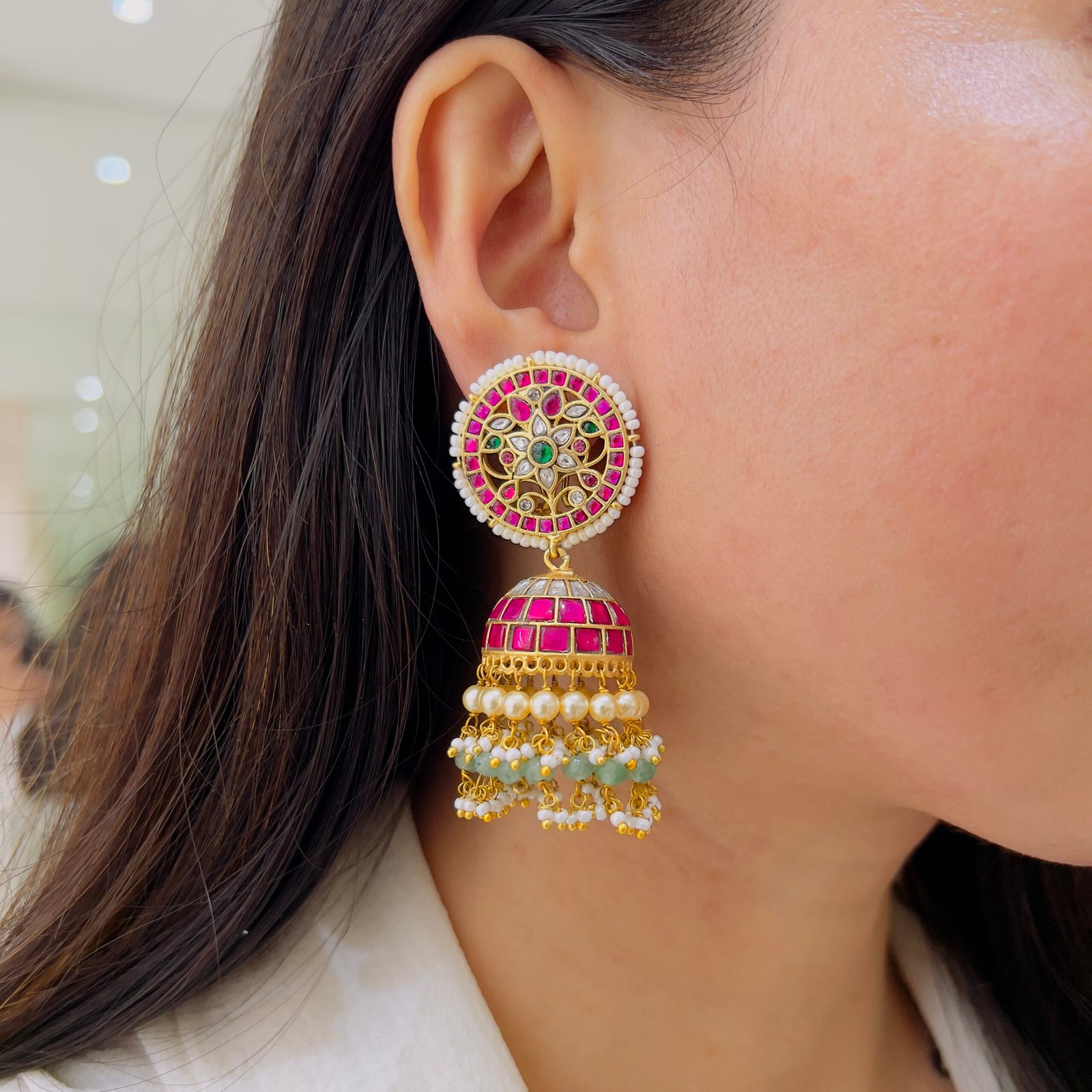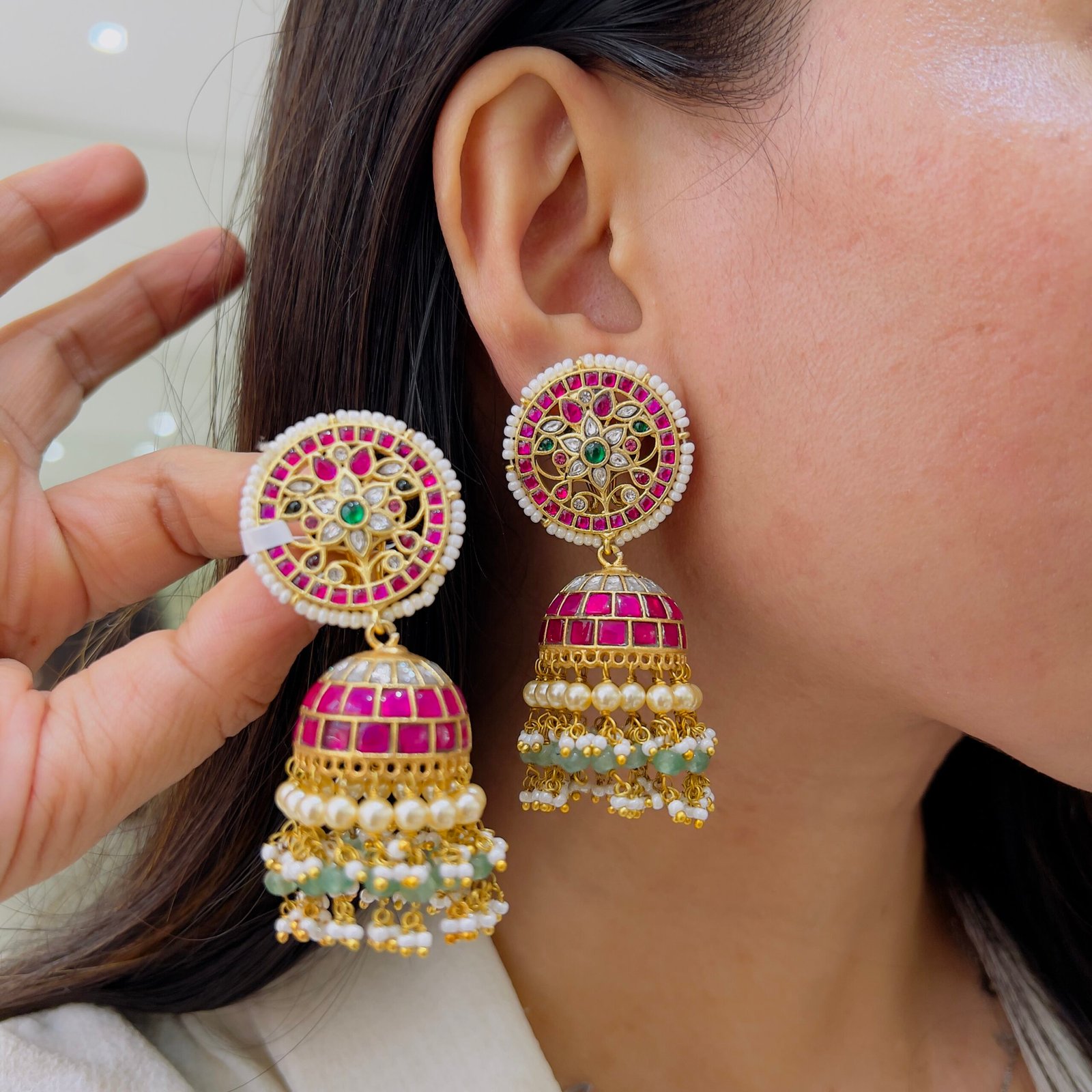 Step into elegance with this handcrafted Jadau Kundan Jhumka featuring rich ruby-toned stones, lustrous pearls, and an intricate floral design,18K gold plated, anti-tarnish, and perfect for rough use — this stunning piece shines with traditional luxury and modern durability.