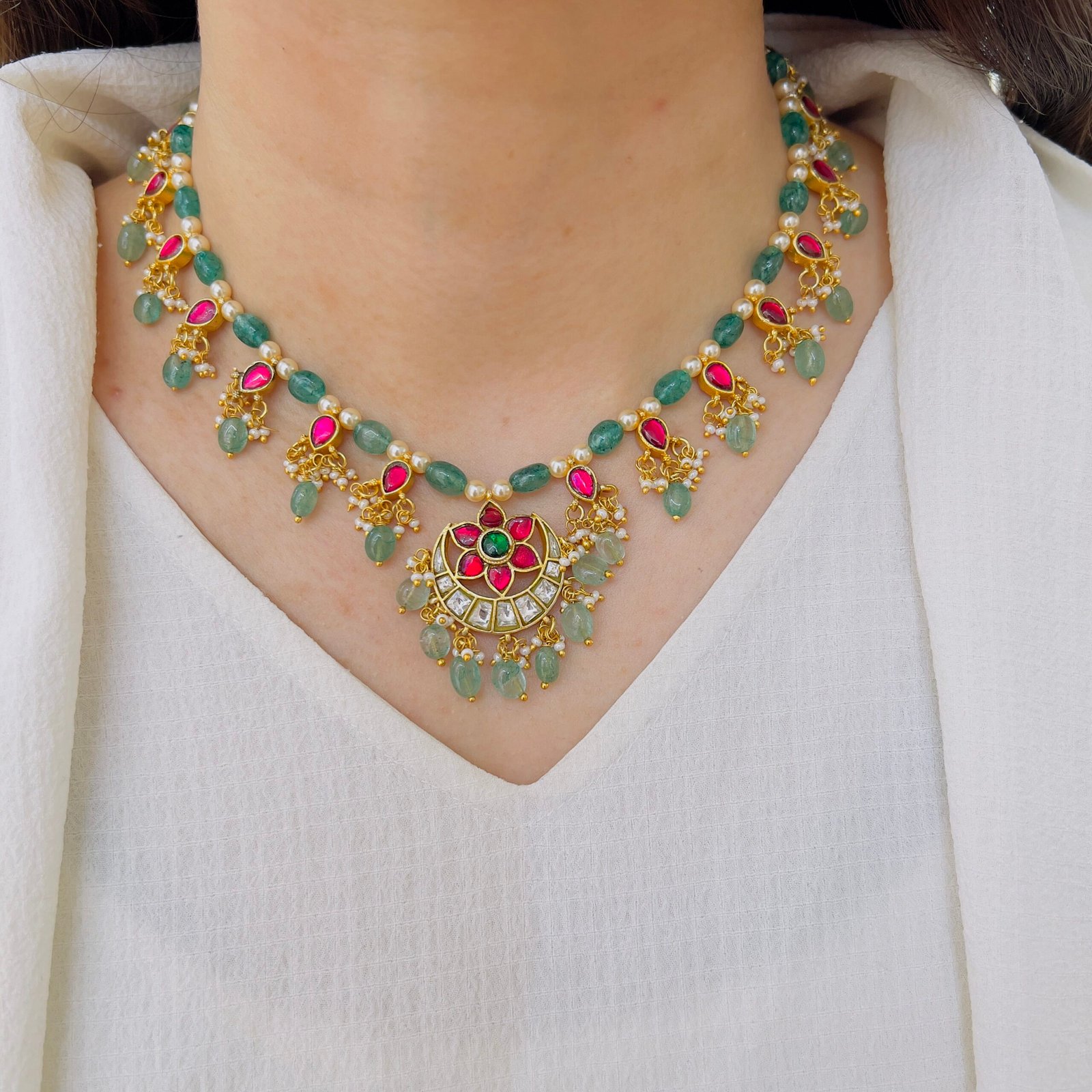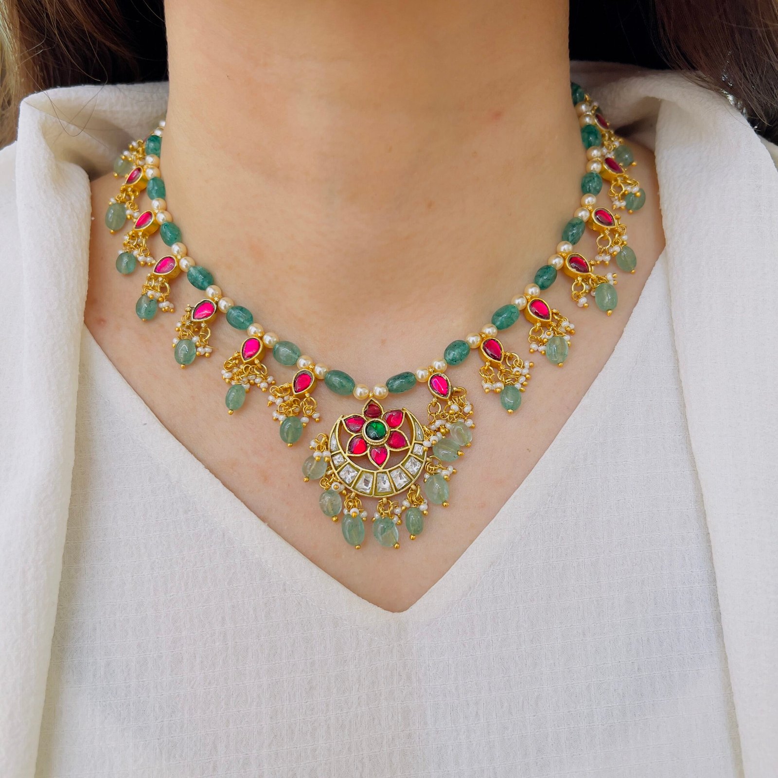 Celebrate timeless Indian craftsmanship with this exquisite Jadau necklace. Designed with rich kundan stones, delicate pearls, and soothing green beads, this piece reflects regal charm and traditional elegance, Perfect for weddings, festive occasions, and ethnic celebrations, it adds a graceful statement to any traditional outfit.