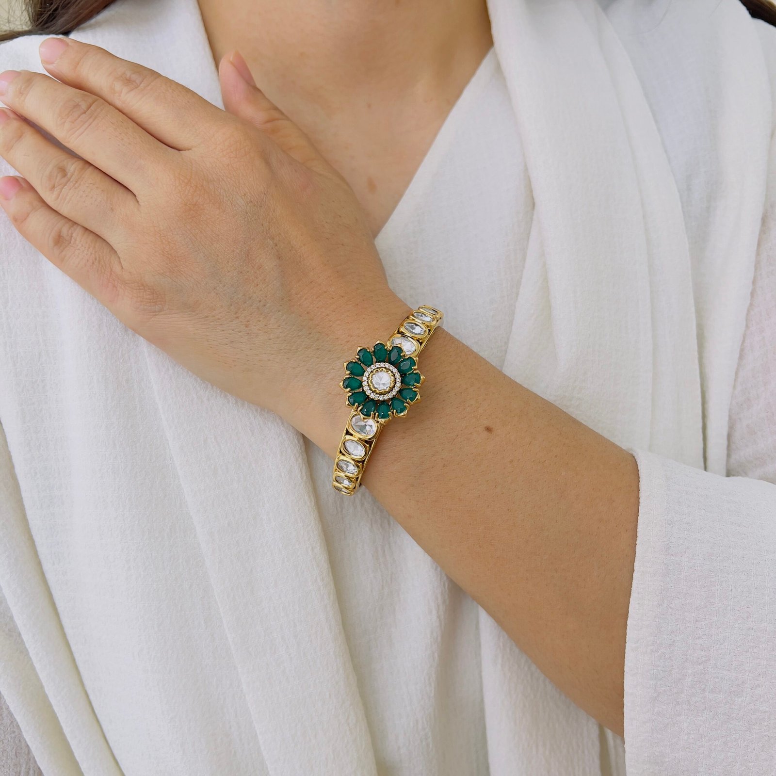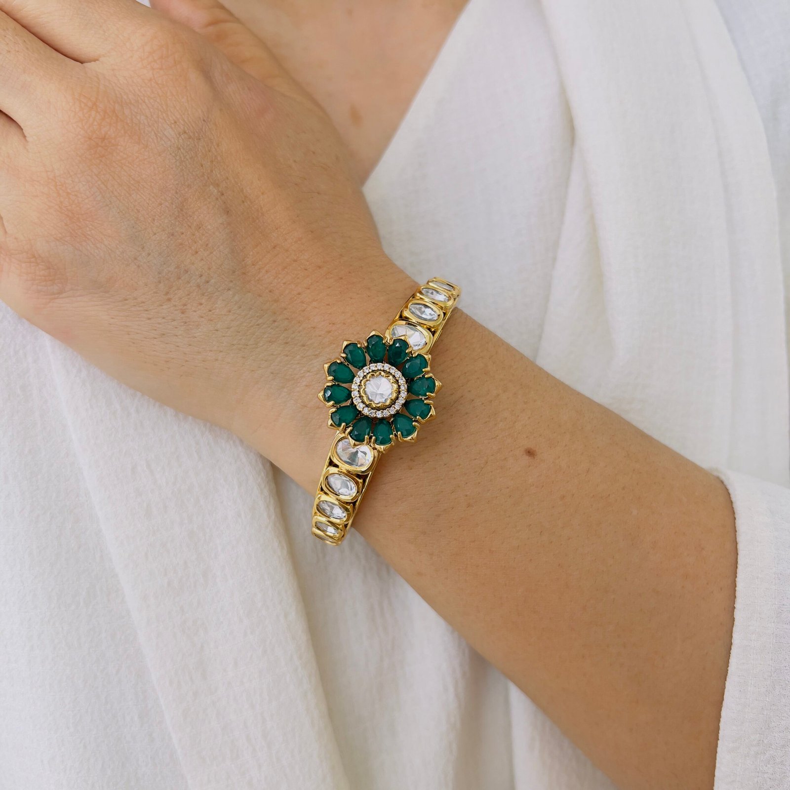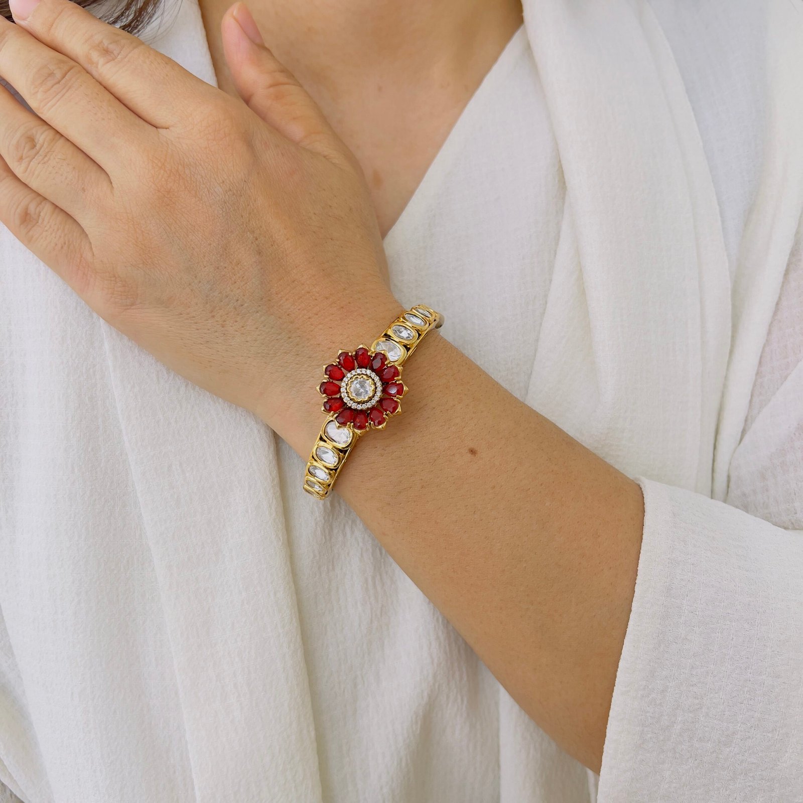 Crafted with a rich Victorian finish and radiant ruby accents, this statement bangle brings heritage charm and refined sparkle to traditional and fusion looks.